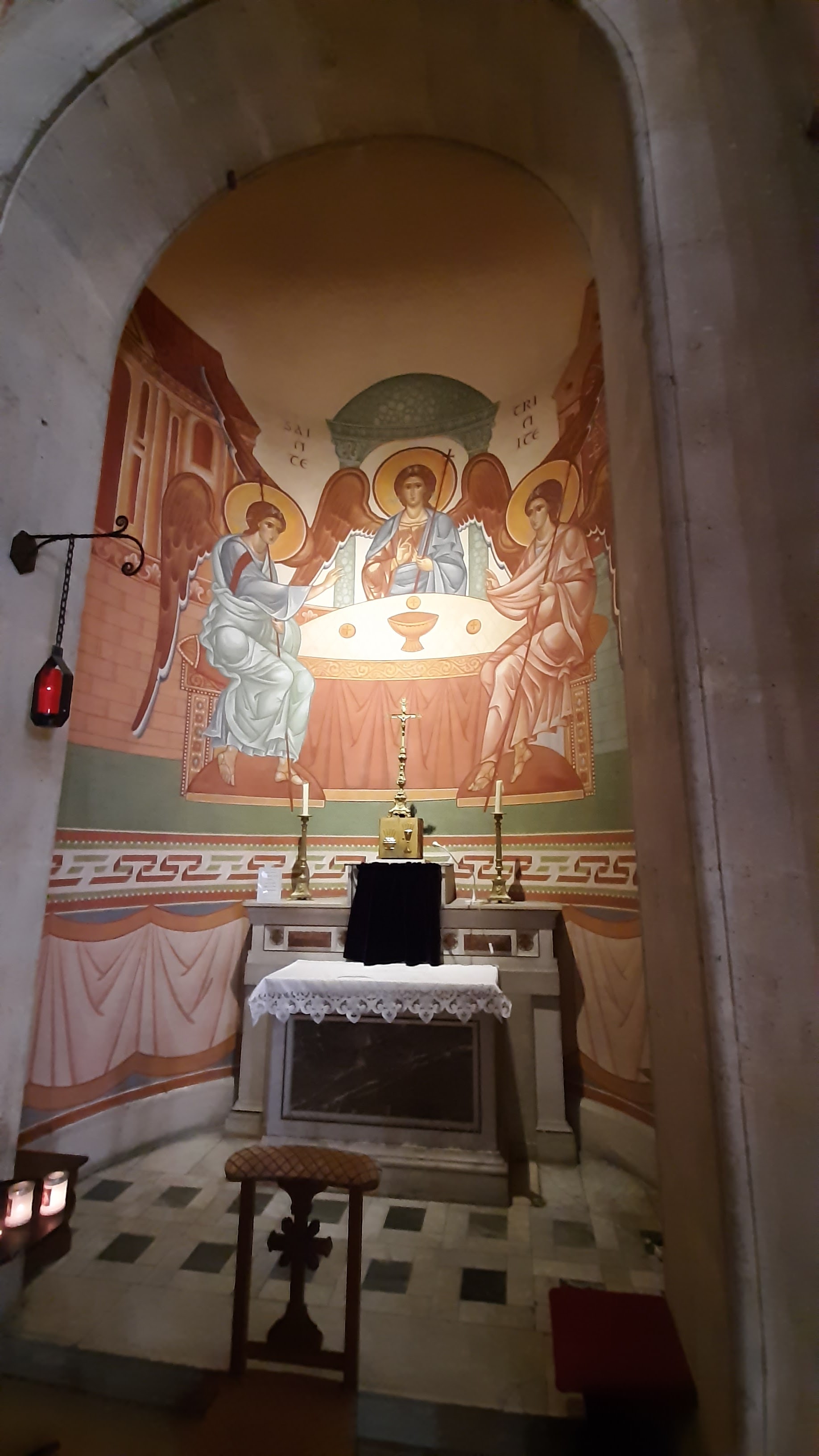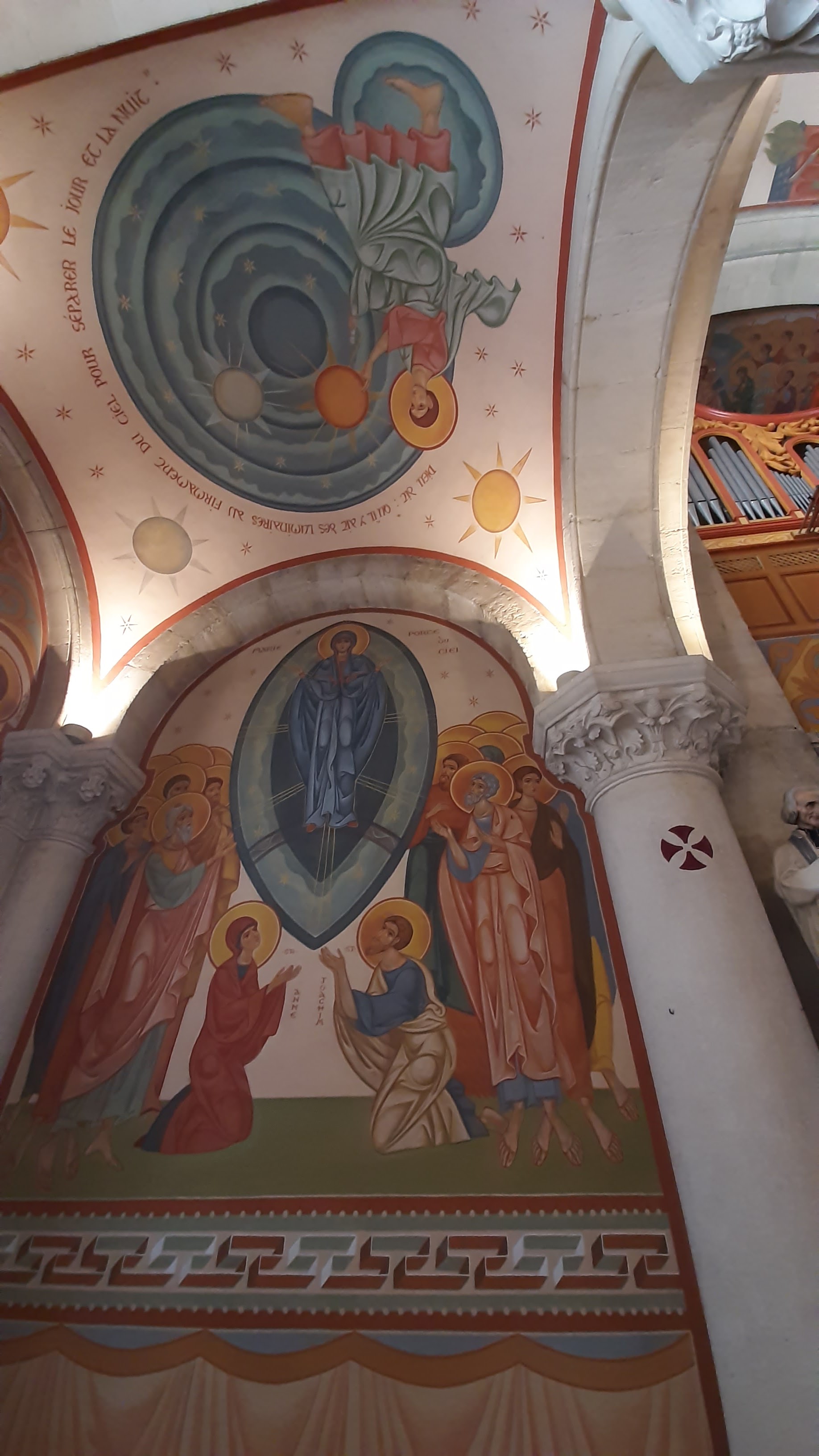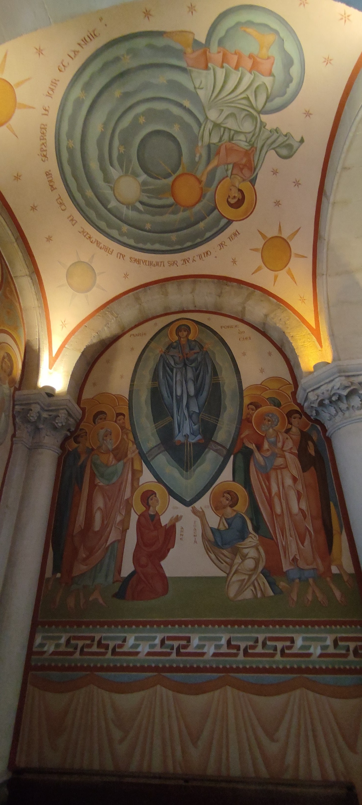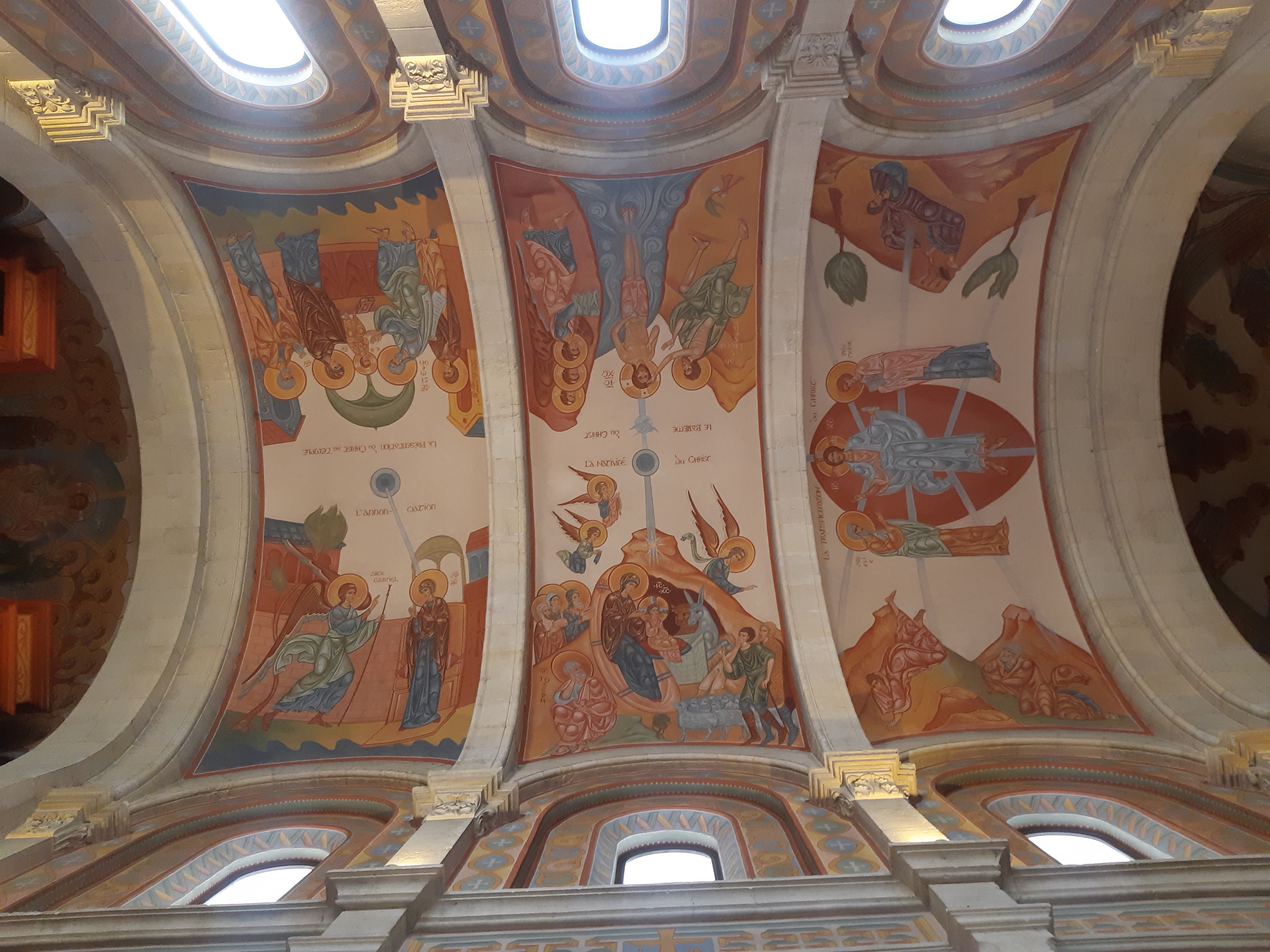 Très belles fresques sur les murs et le plafond un peu à la manière byzantine. Lieu propice au recueillement.