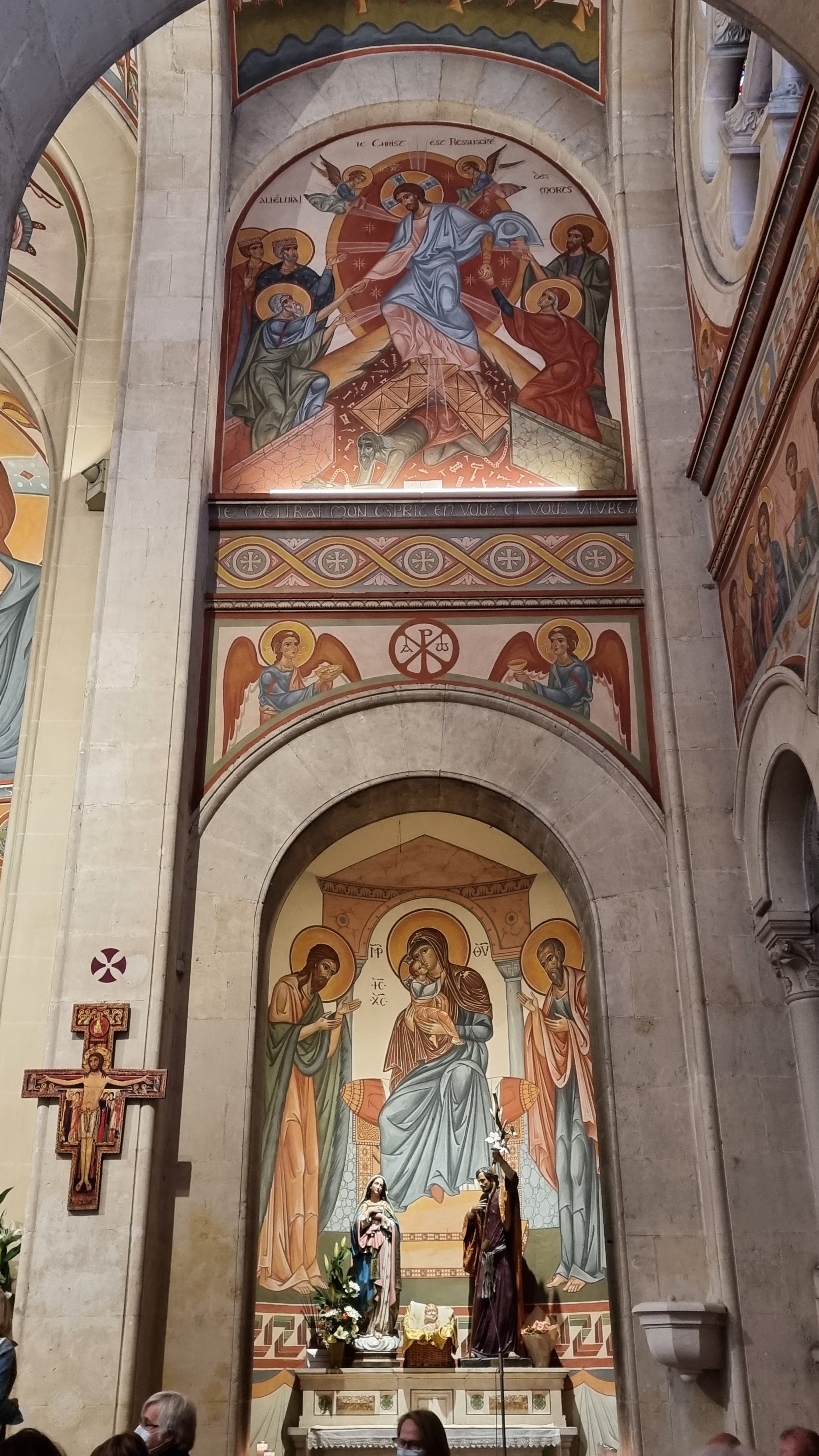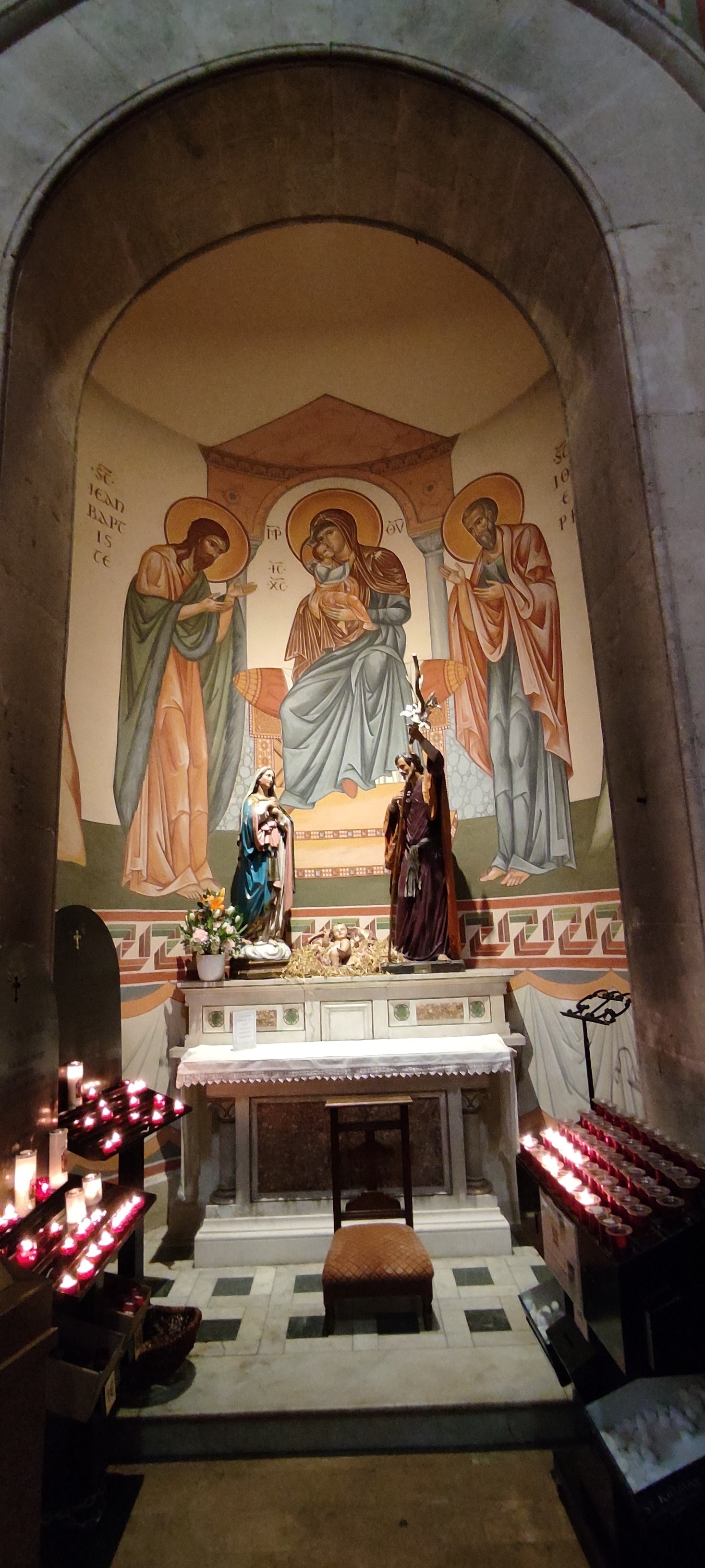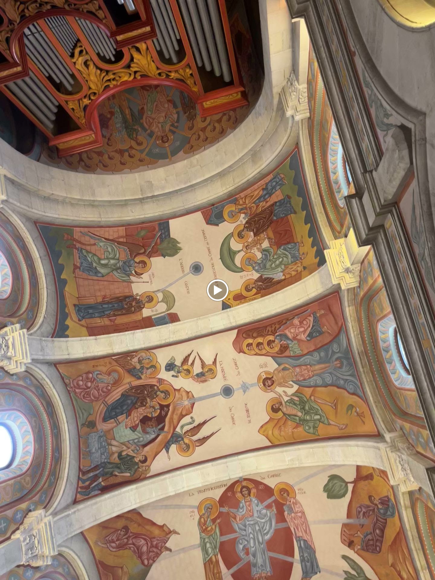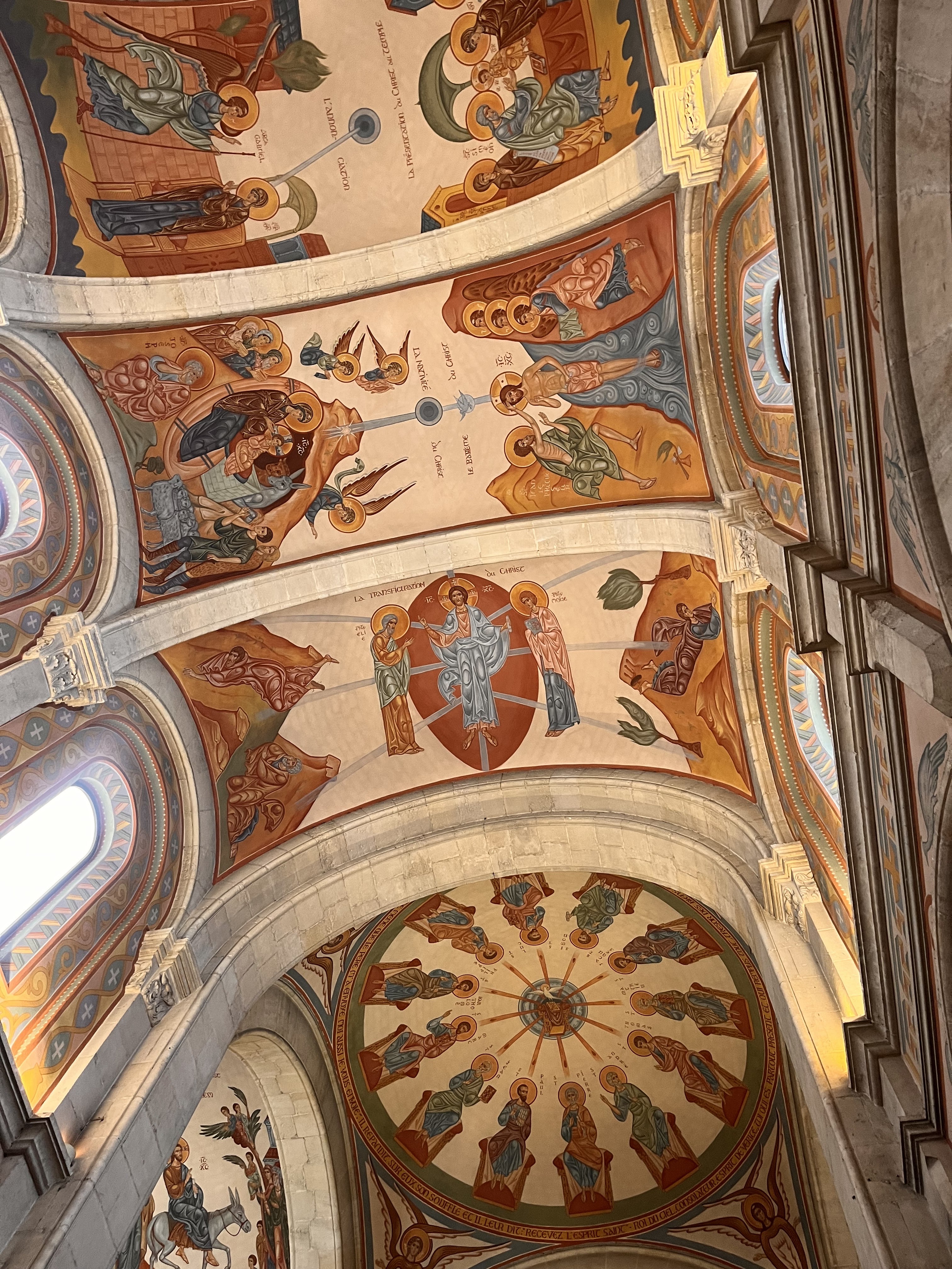 Très belles fresques sur les murs et le plafond un peu à la manière byzantine. Lieu propice au recueillement.