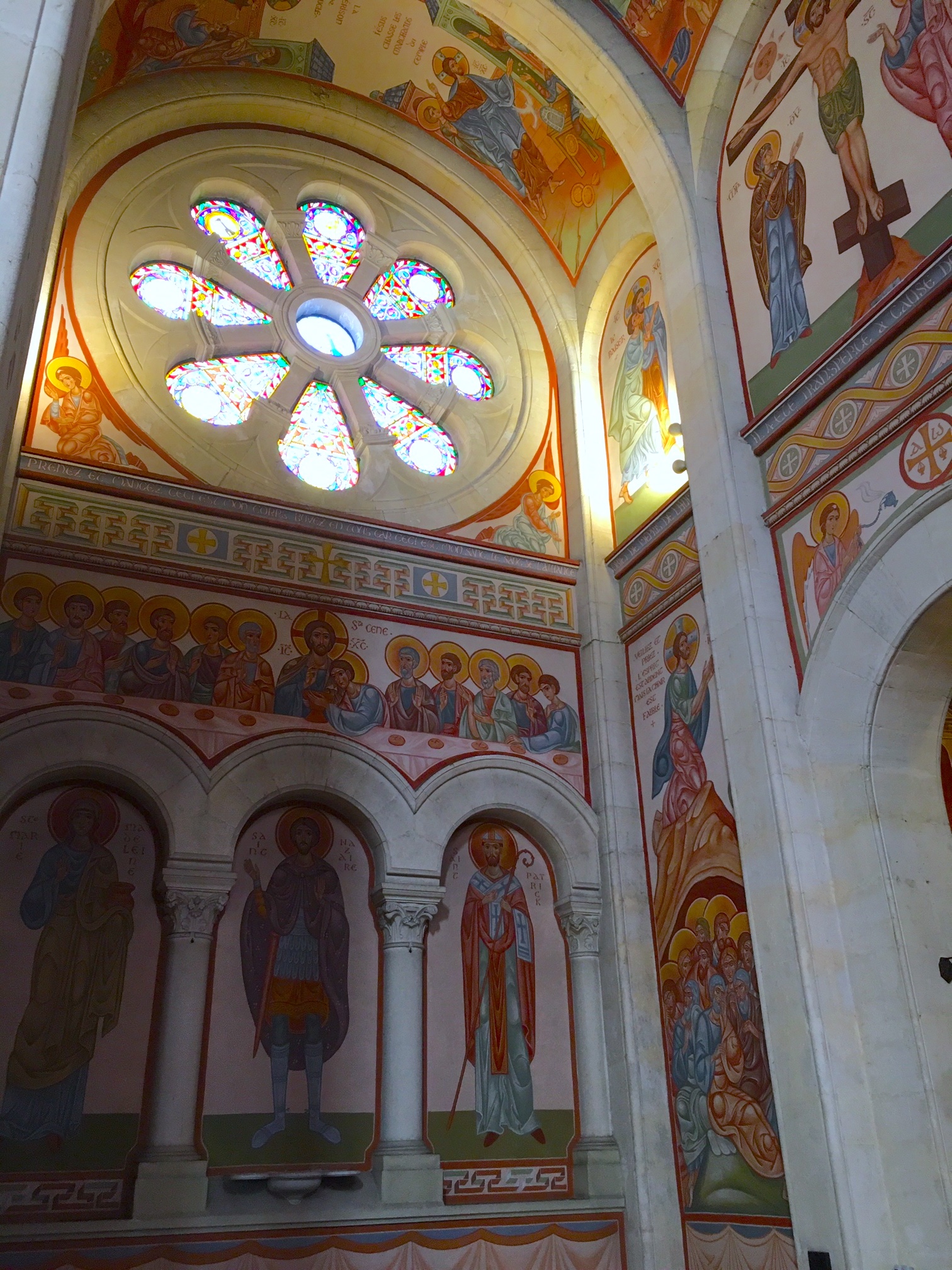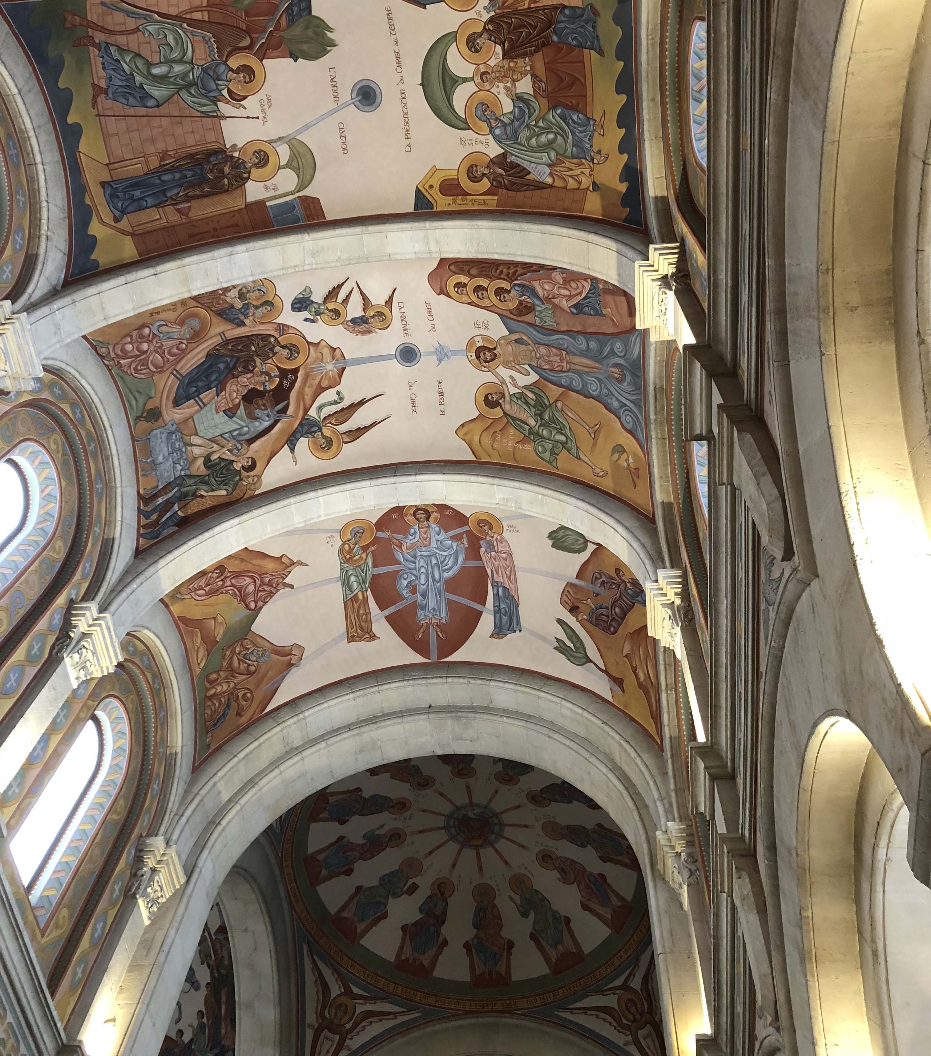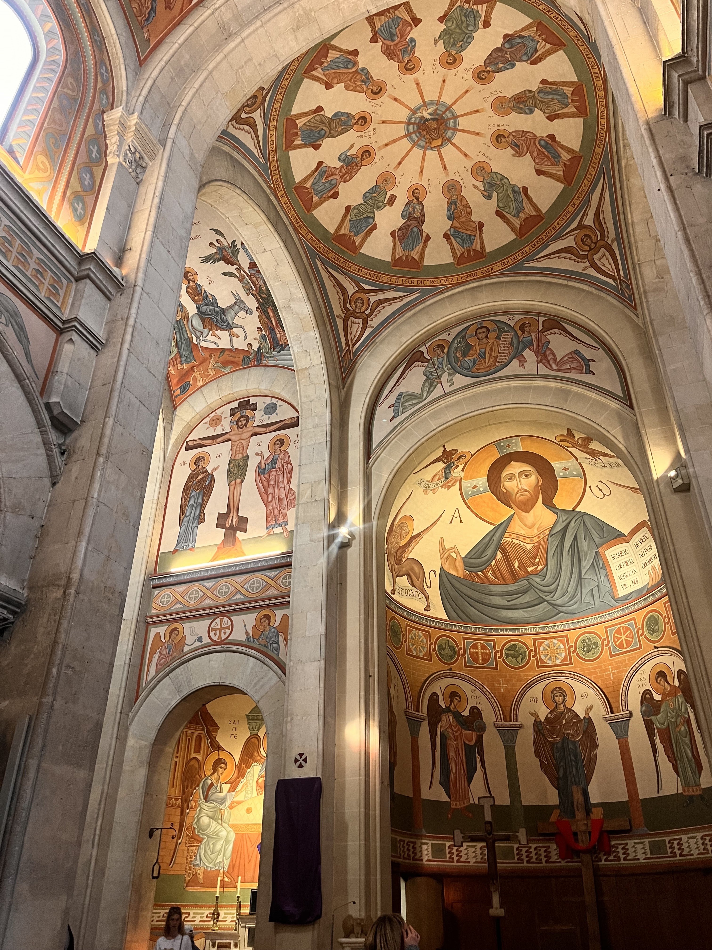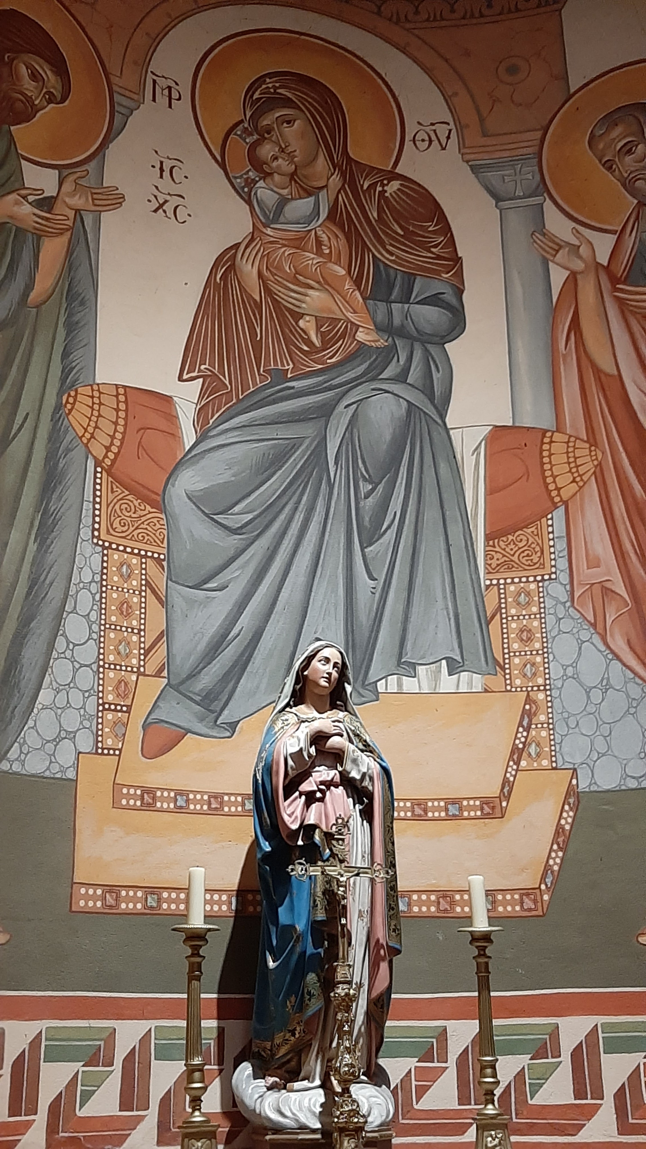 Très belles fresques sur les murs et le plafond un peu à la manière byzantine. Lieu propice au recueillement.