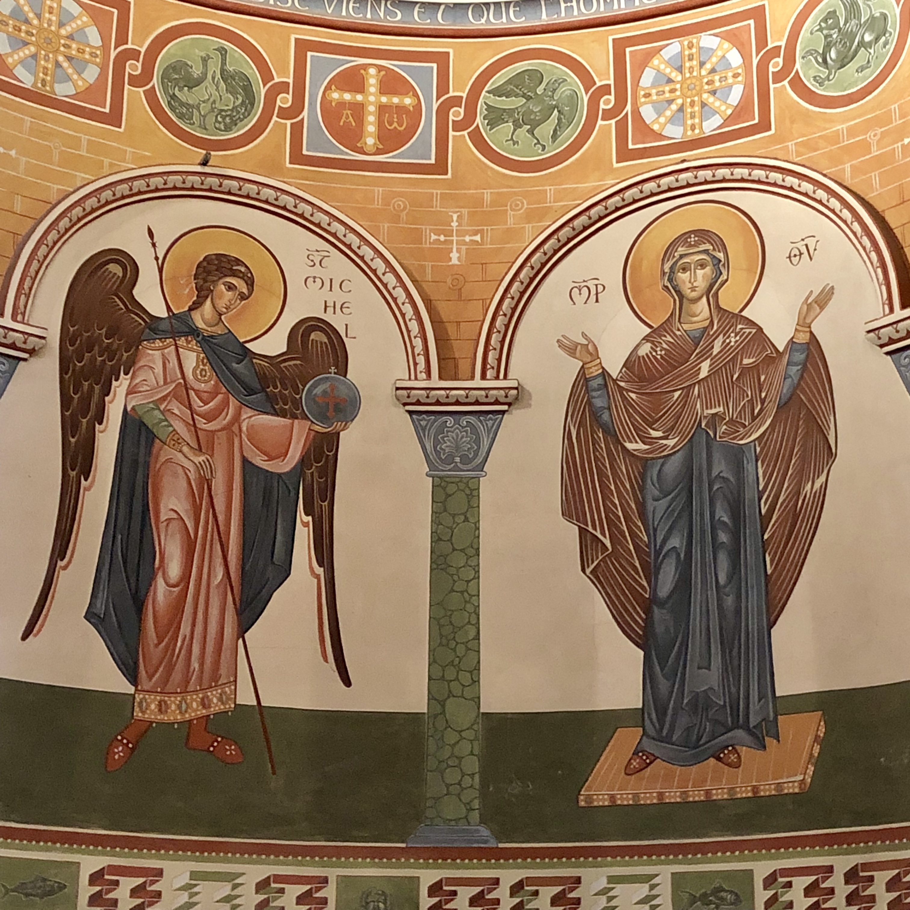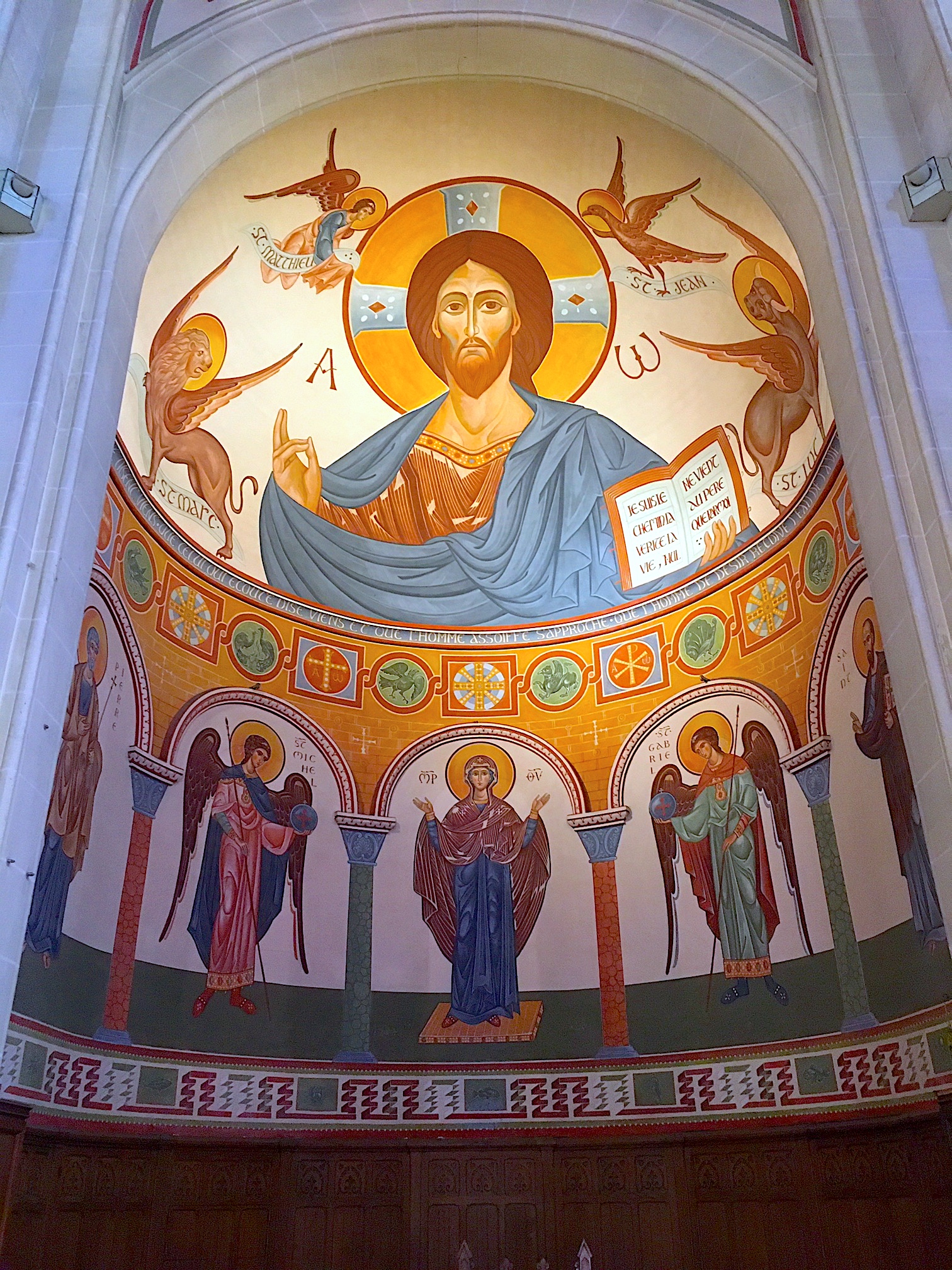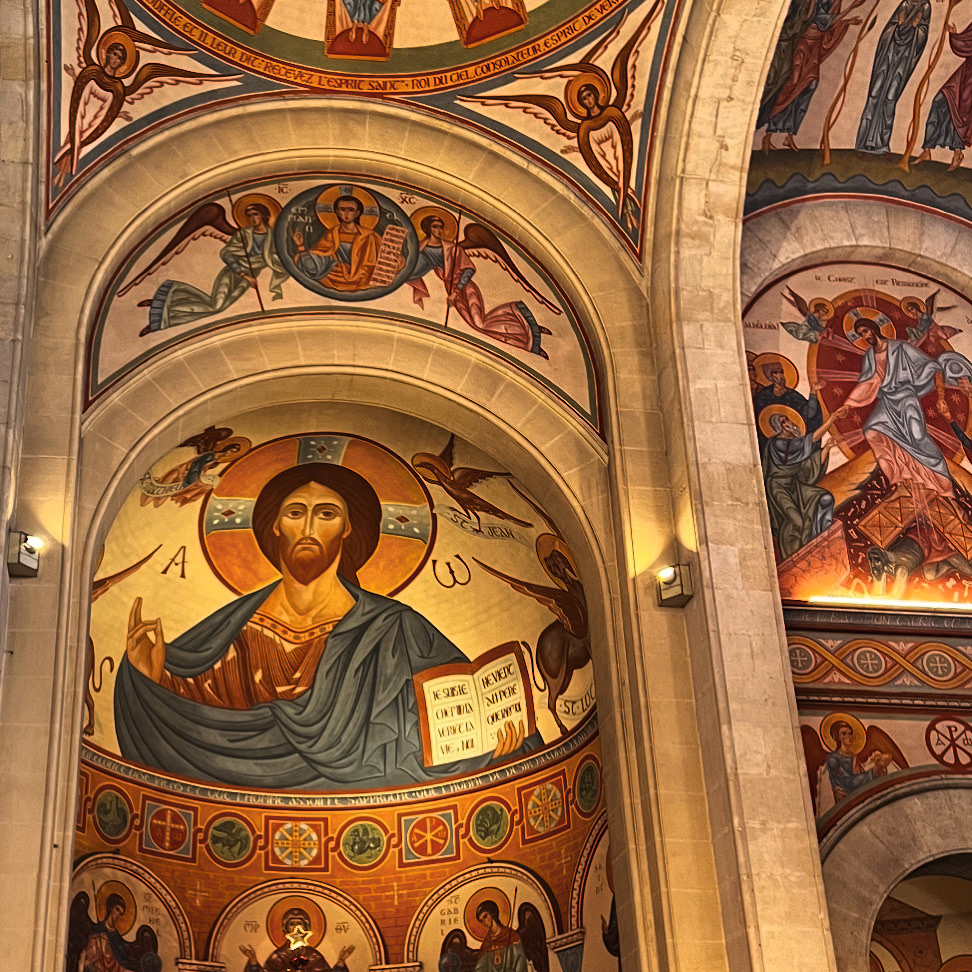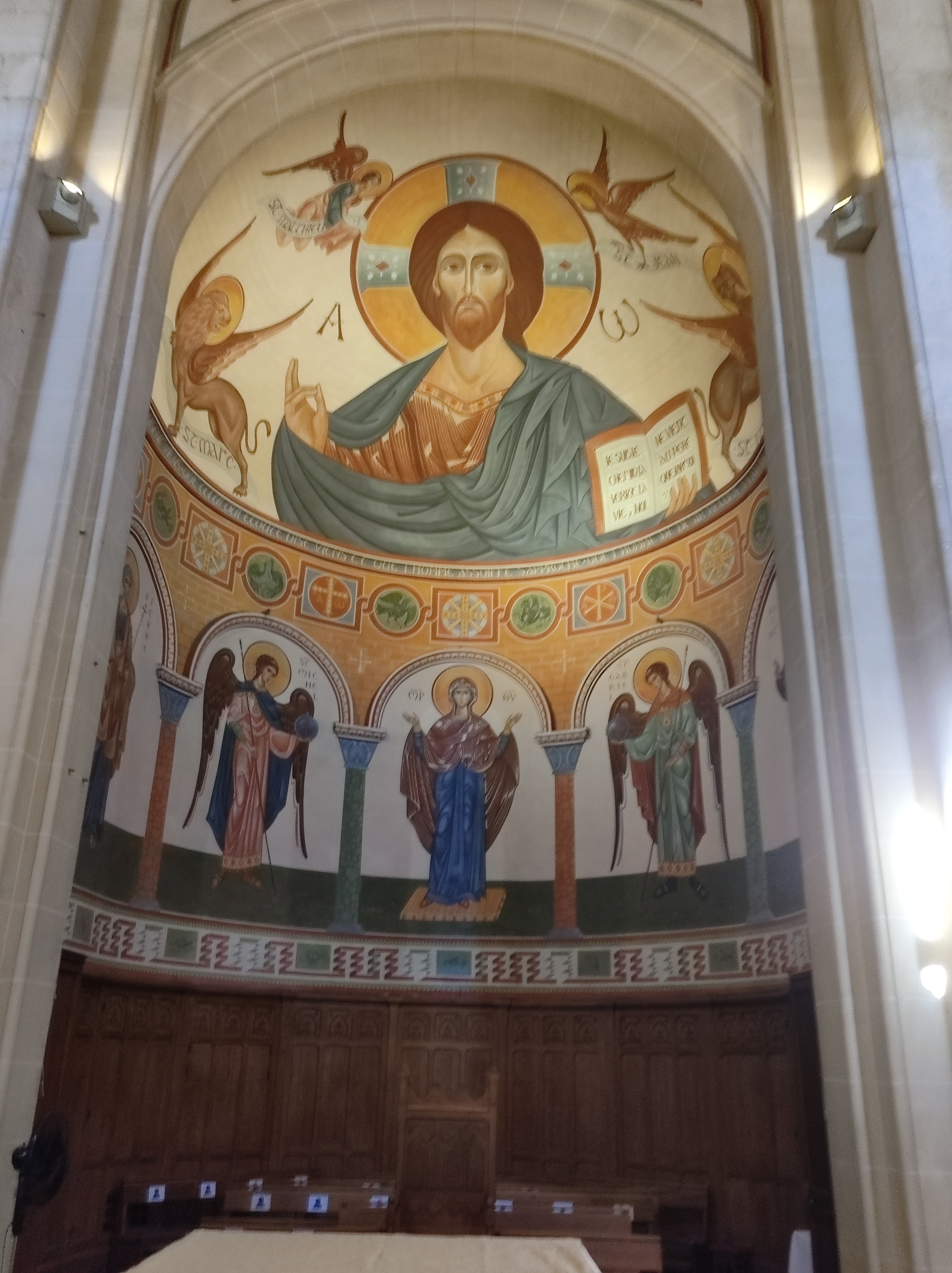 Très belles fresques sur les murs et le plafond un peu à la manière byzantine. Lieu propice au recueillement.