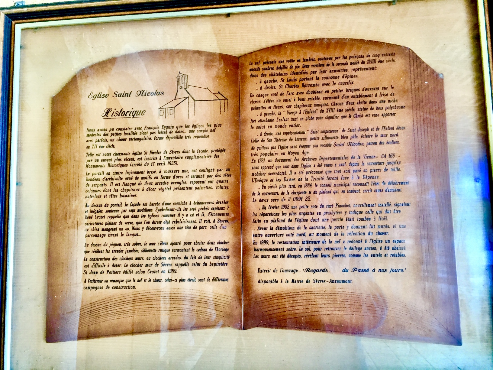 Touchante église romane Cette région fourmille de petites églises du 12è et 13è siècles, caractéristiques des monuments ruraux, qui présentent toutes de riches histoires locales. J'adore ce genre d'églises car leur modestie est touchante et leur parfait état de conservation est dû à l'attachement des villageois à leur patrimoine. L'église Saint-Nicolas de Sèvres-Anxaumont, classée pour sa façade en 1935 est un parfait exemple de ces monuments ruraux. Elle est située comme il se doit au milieu du cimetière dans lequel se trouve une croix hosannière datant du 14ème siècle, encadrée de deux tombaux sur colonnes du 13ème. Horaires d'ouverture au public : demander les clefs à la mairie située sur la même place. A proximité, vous pouvez découvrir la petite église de Mignaloux-Beauvoir et la très belle église du 19ème de Saint-Julien-L'ars. La région possède aussi un patrimoine roman exceptionnel, depuis l'église préromane (7ème siècle) de Saint-Pierre les églises (le seul édifice religieux en Europe de cette époque présentant ses murs originaux) jusqu'à l'ensemble des édifices prestigieux de Poitiers, Saint-Savin, Chauvigny etc...