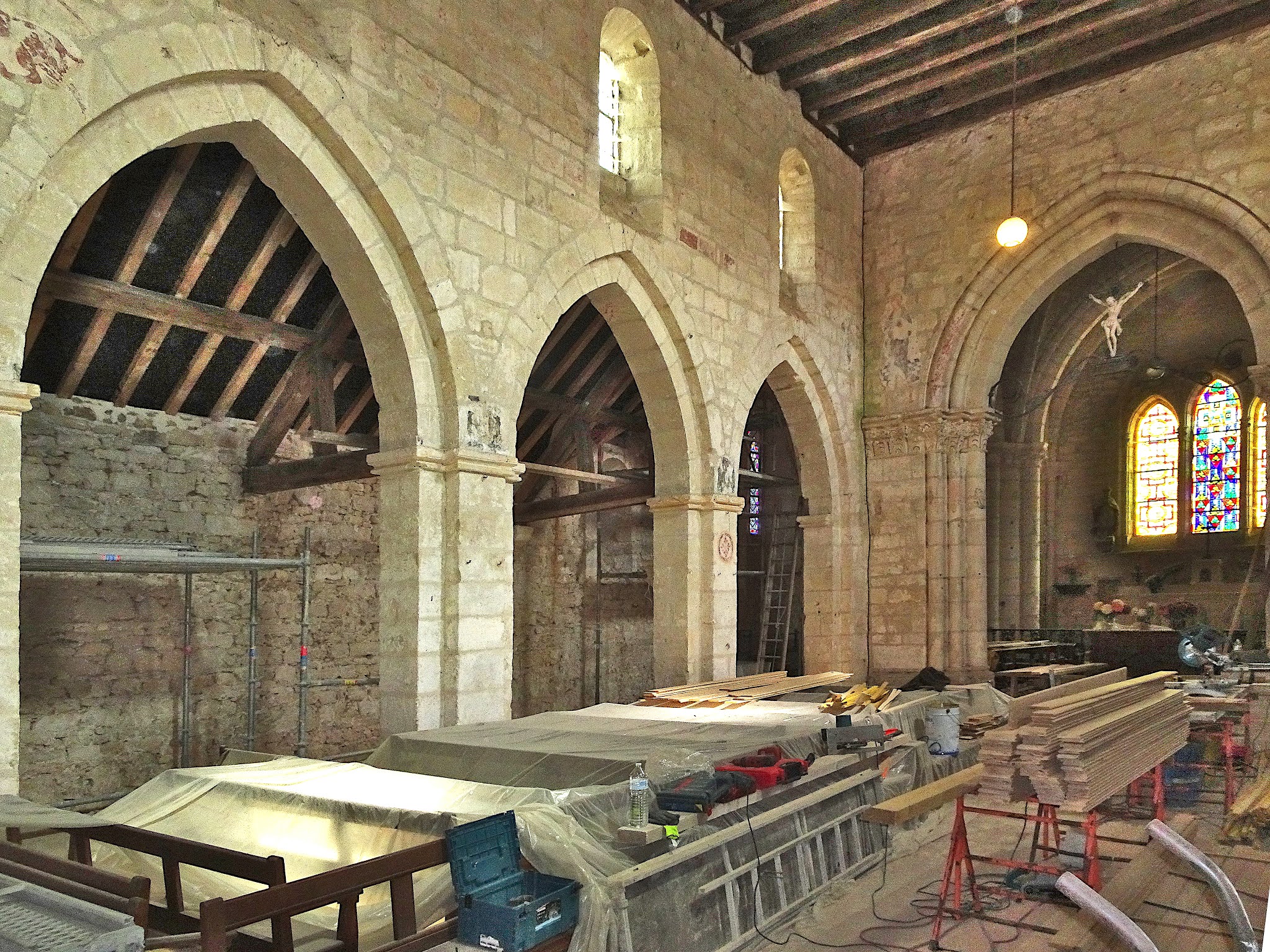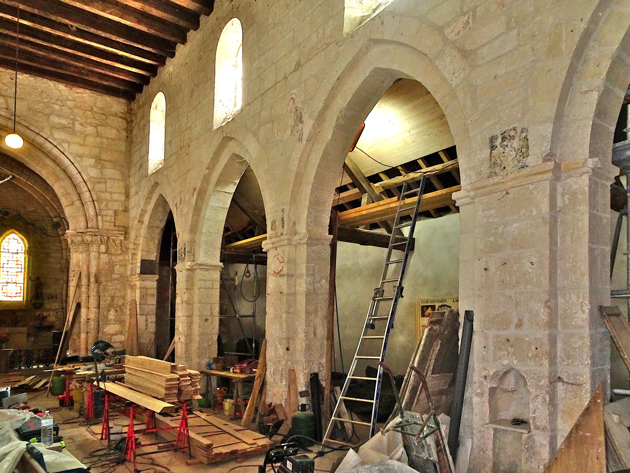L'église romane Saint-Nicolas de Lhéry, du XIIIe siècle, est une grande bâtisse pour un village de 80 habitants ! L'histoire remonte à l'an 1100, quand on parle déjà d'un don d'autel. L’église ne survivra pas indemne à 900 ans d’existence – bien sûr ! Mais pendant la Première Guerre mondiale, l’église semble réellement disparaître. L'édifice fut touché par les bombardements en 1918 lors de la Seconde Bataille de la Marne, perdant toutes les toitures et la quasi-totalité de la nef. Le bâtiment a été tellement endommagé qu'en 1919, un comité national de restauration a estimé qu'il ne valait plus la peine d'être réparé. En 1921, cette décision est révisée et Saint-Nicolas est classé monument historique. La restauration dura jusqu'en 1936. L'église ne fut pas touchée par la Seconde Guerre mondiale, seulement par un ouragan le 14 mars 1940 ! Une importante restauration débutera en 2017, et quand on veut voir l'église en août 2020, il s'avère que la façade et tout l'intérieur sont recouverts d'échafaudages. Malgré le fait qu'ils travaillent très dur, nous sommes toujours autorisés à jeter un œil à l'intérieur et à prendre des photos. Je suis toujours heureux qu'à notre époque il y ait encore autant d'argent disponible pour ces monuments historiques, qui ne sont ouverts que dans une mesure limitée et ne peuvent pas compter sur un grand nombre de croyants. L'église semble désormais appartenir à la municipalité locale.