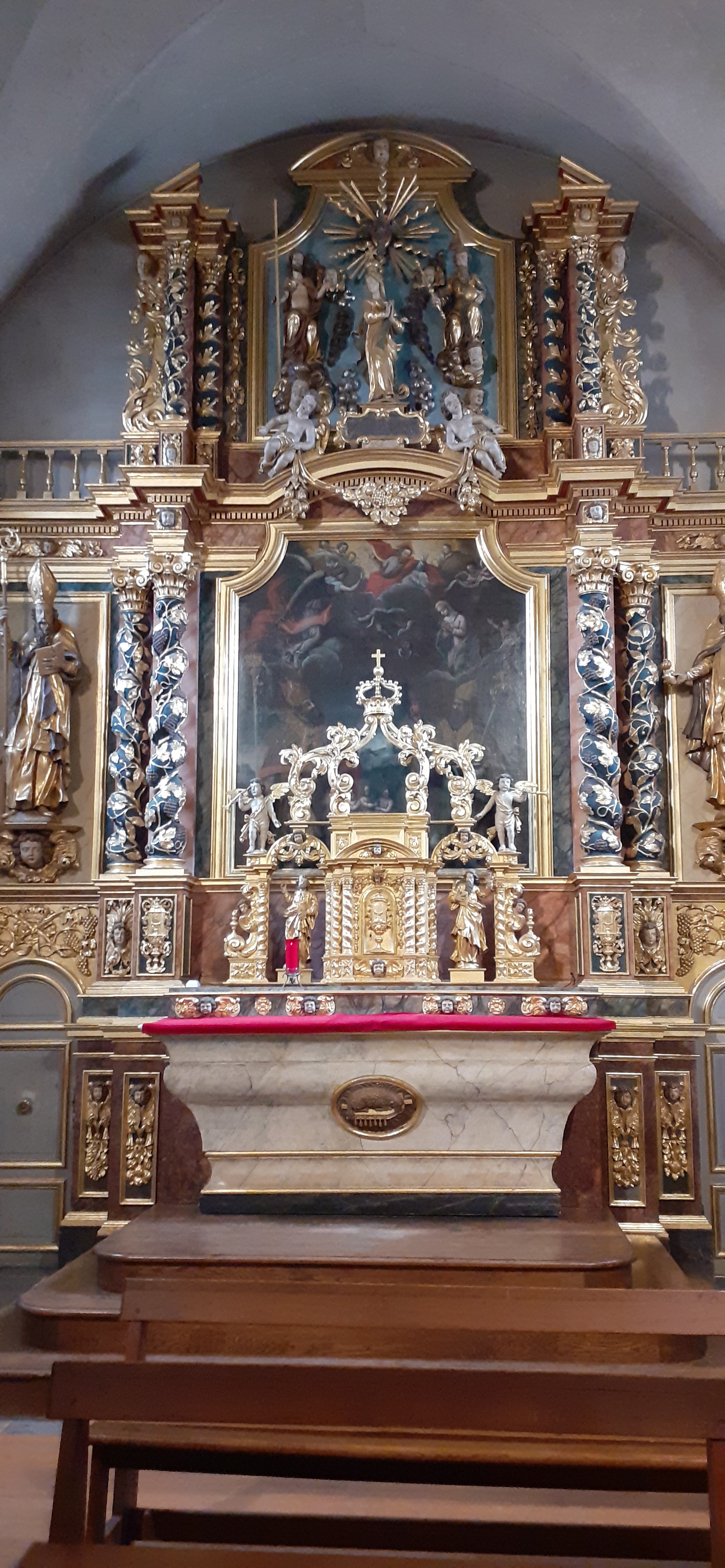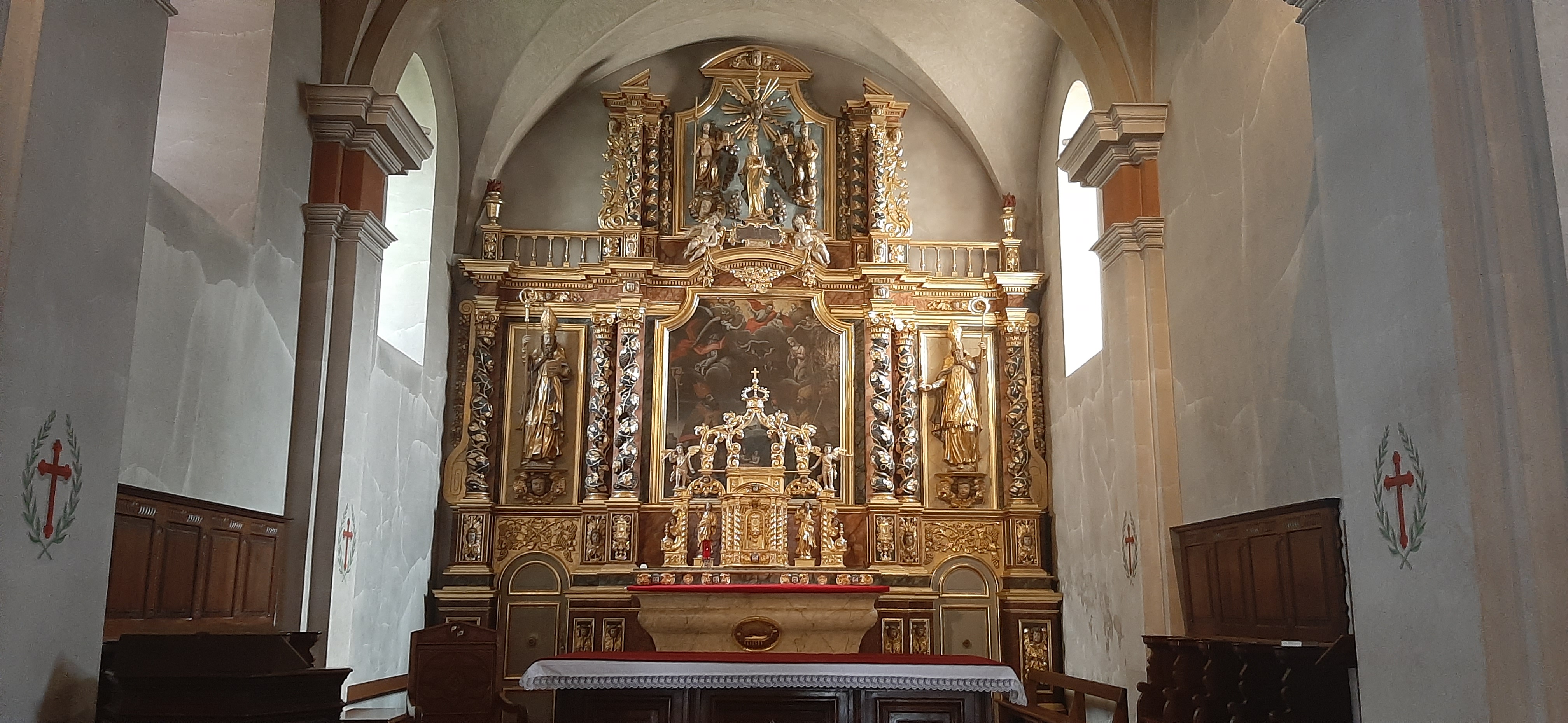 Typique des Églises alpines, cette église dispose d'un retable baroque du 18e.