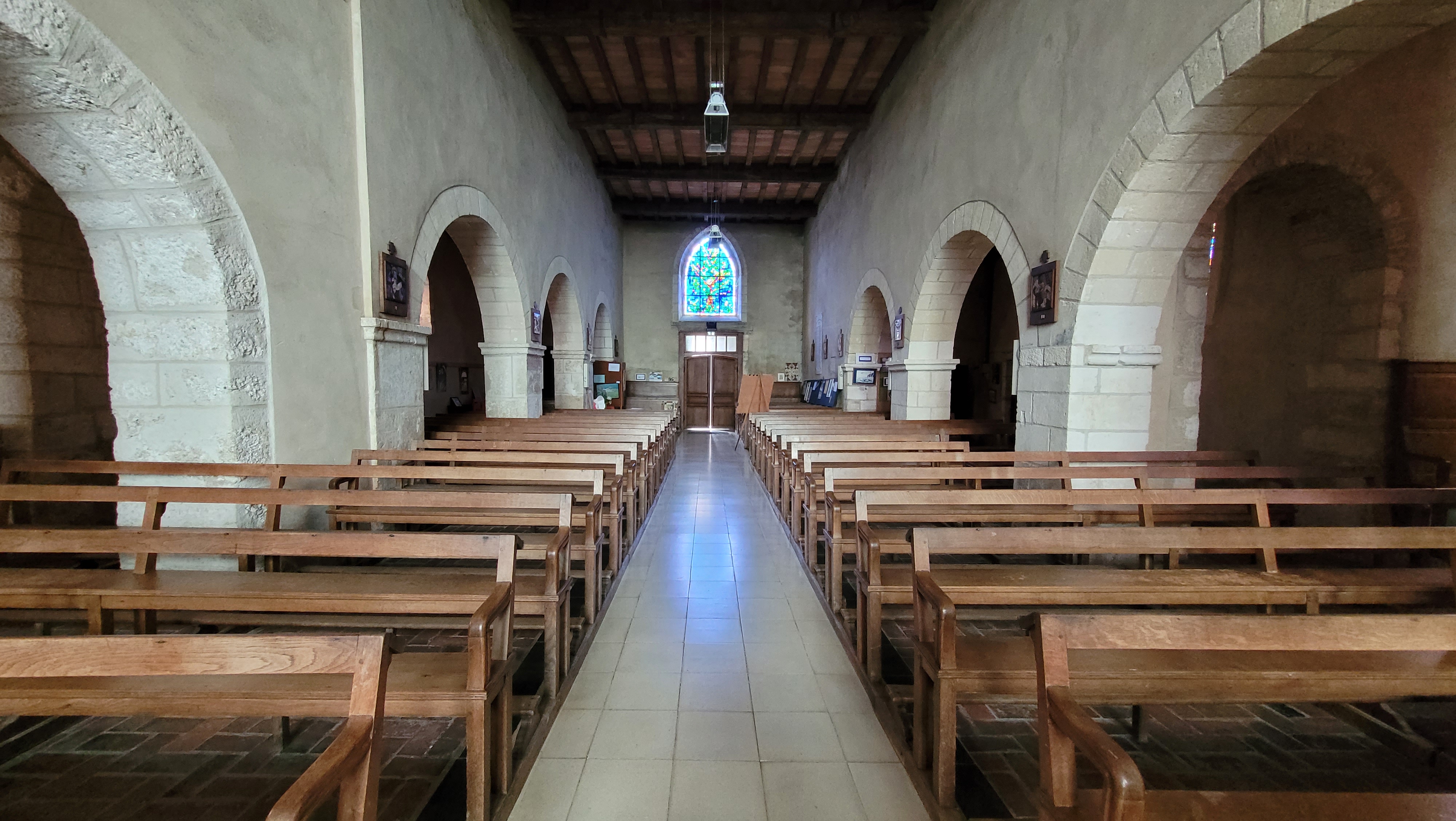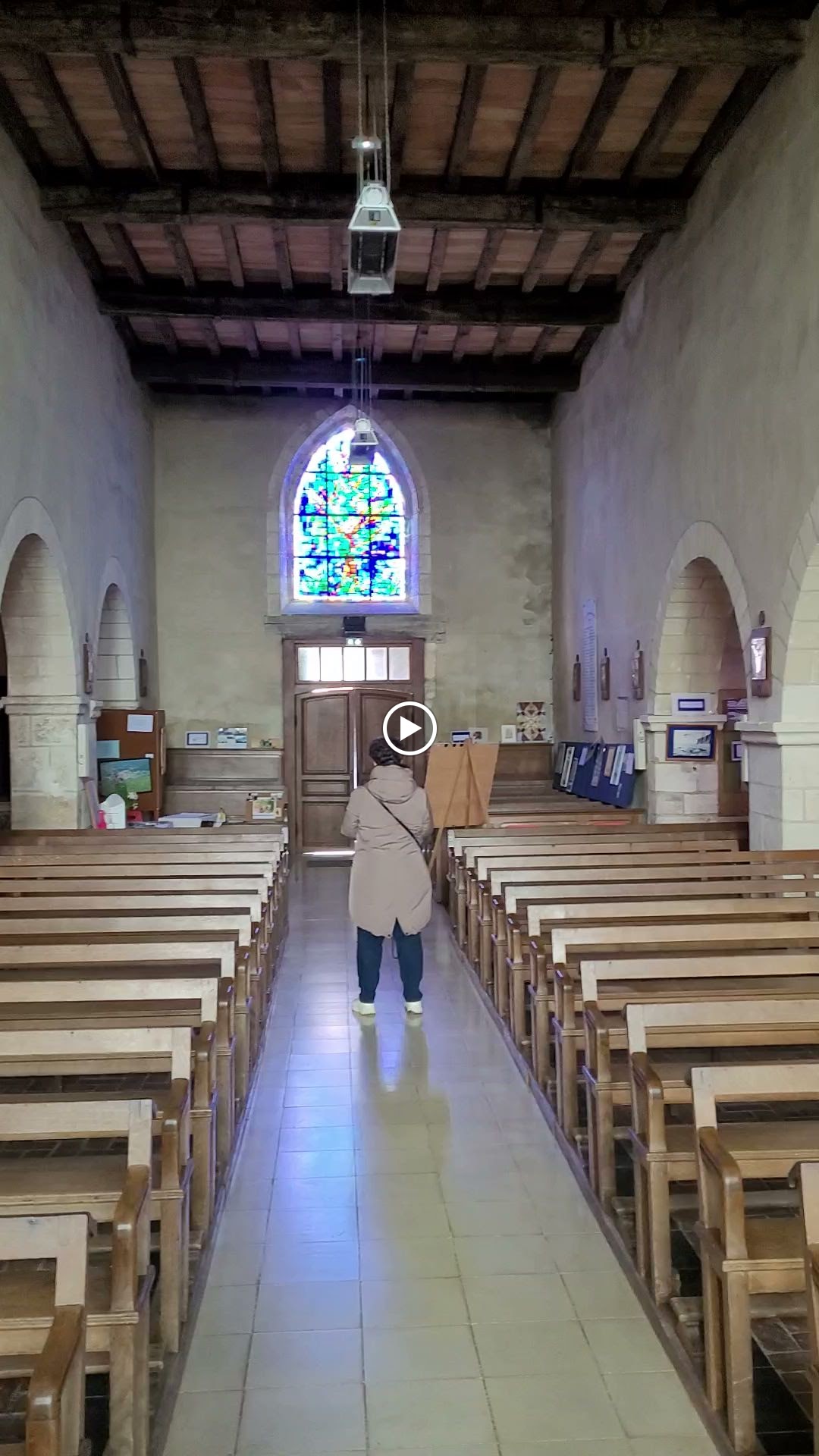 Petite église avec (vitraux) et vitraux.
