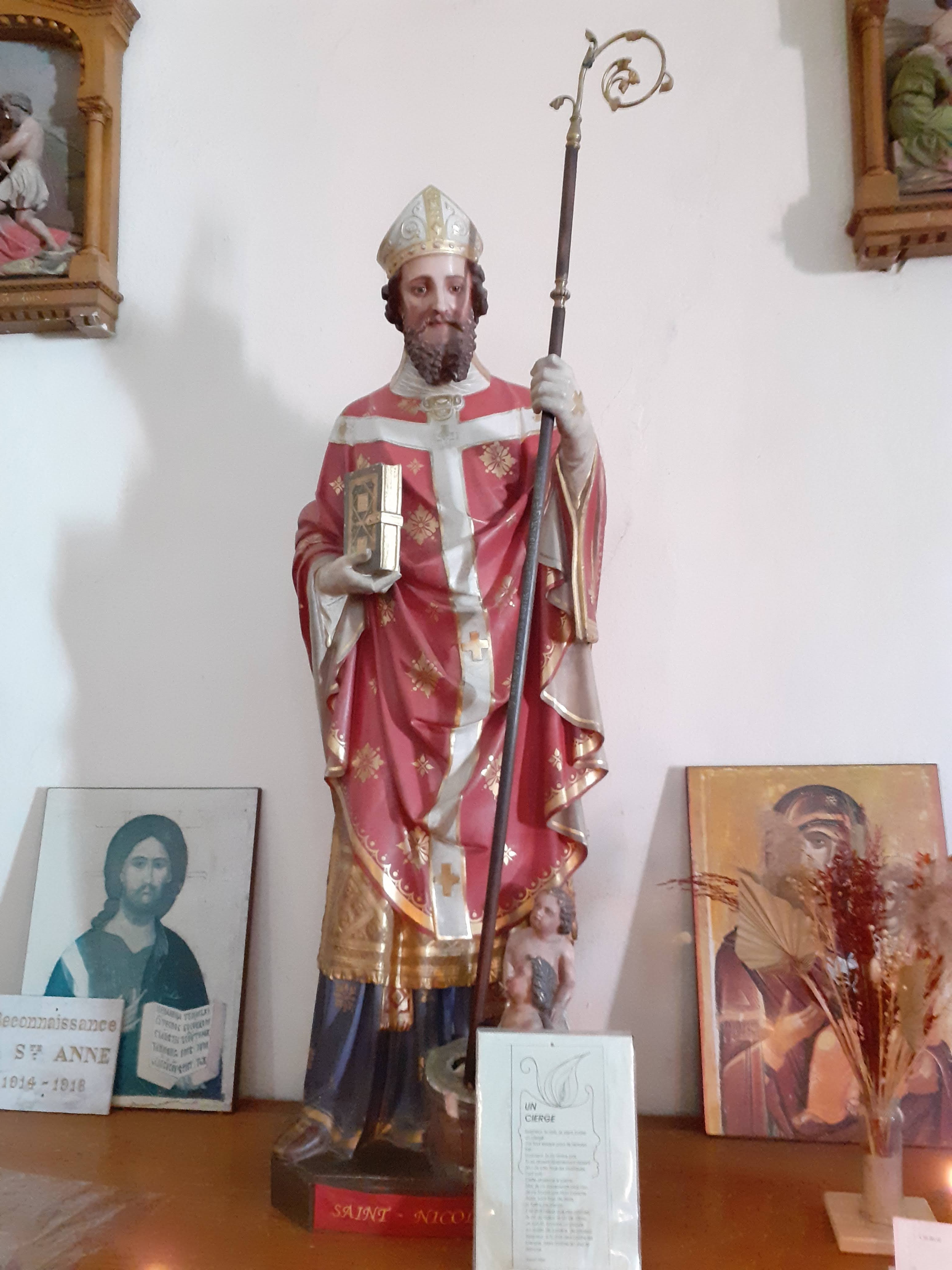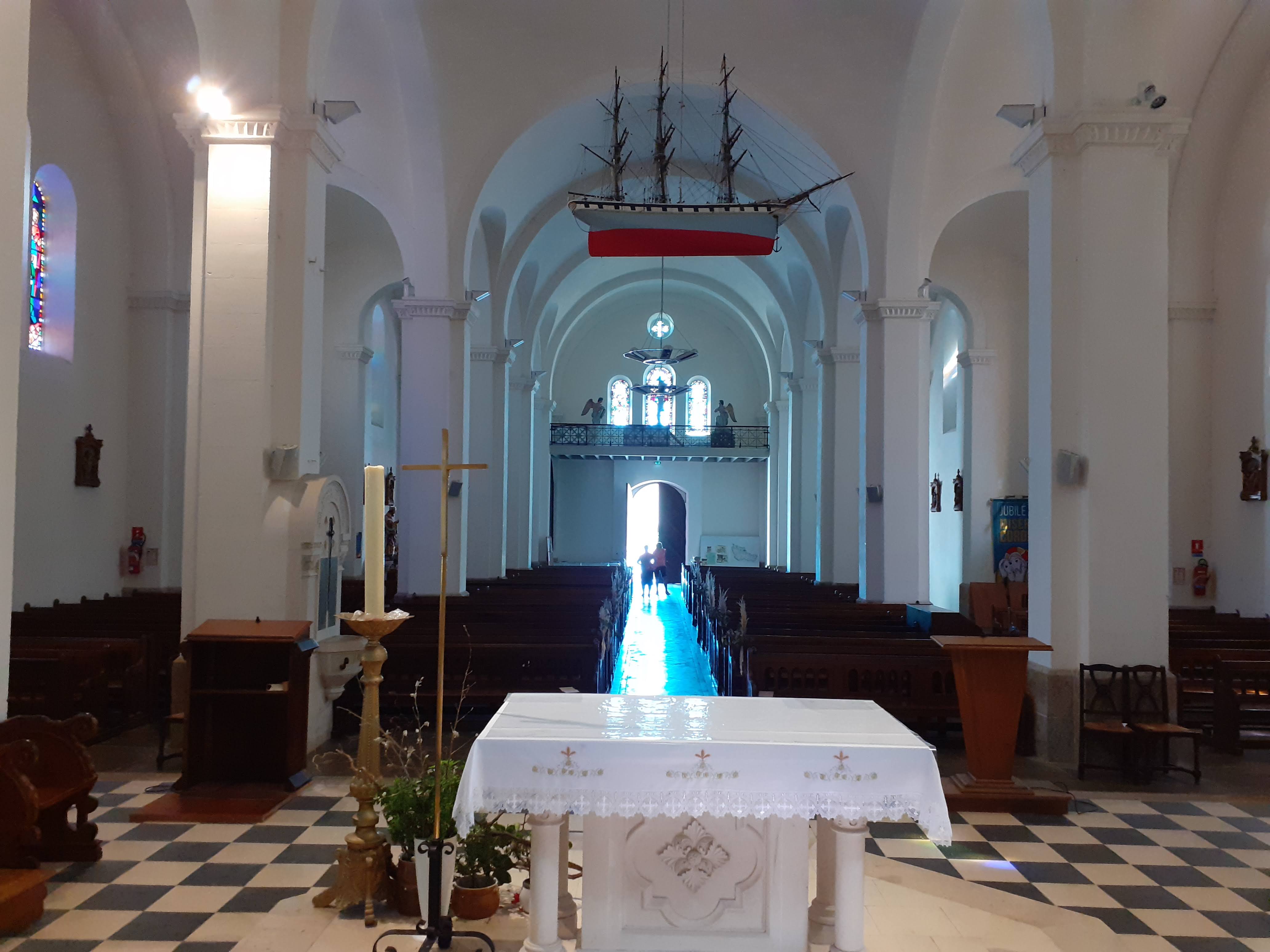 05/2022 - Saint patron des Marins. Construite fin XIX ème, style néo-roman en granit. Intérieur gai et assez clair. Jolis vitraux, statuettes dont Saint Nicolas.