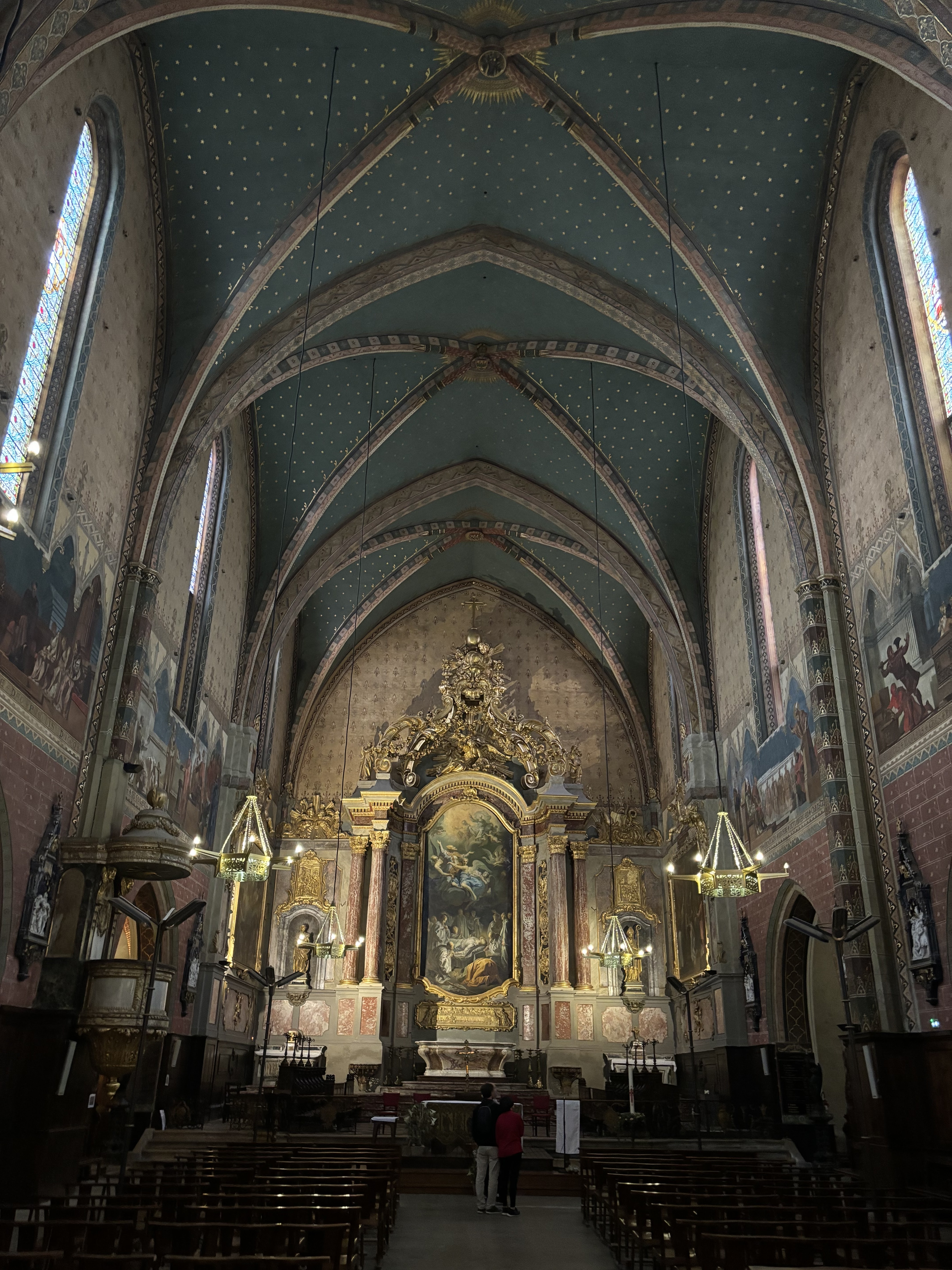 Superbe église à l' intérieur d' un bâti des plus austères. Il s' agît d' ailleurs de la seule église de la rive gauche à TOULOUSE dont l' édification date du Moyen Âge. Je n' avais jamais pu la visiter: dans mes 1ères années à TOULOUSE, elle faisait en effet l' objet d' importantes restaurations. Puis, elle fût souvent fermée ! Aussi, quel bonheur d' admirer ces magnifiques fresques qui courent tout le long de la nef, de contempler ce rétable impressionnant, ou de découvrir ces chapelles qui, chacune, réserve une surprise ! L' orgue, enfin, est majestueux &, à n' en point douter, apporte aux offices la solennité qui sied à une belle cérémonie !