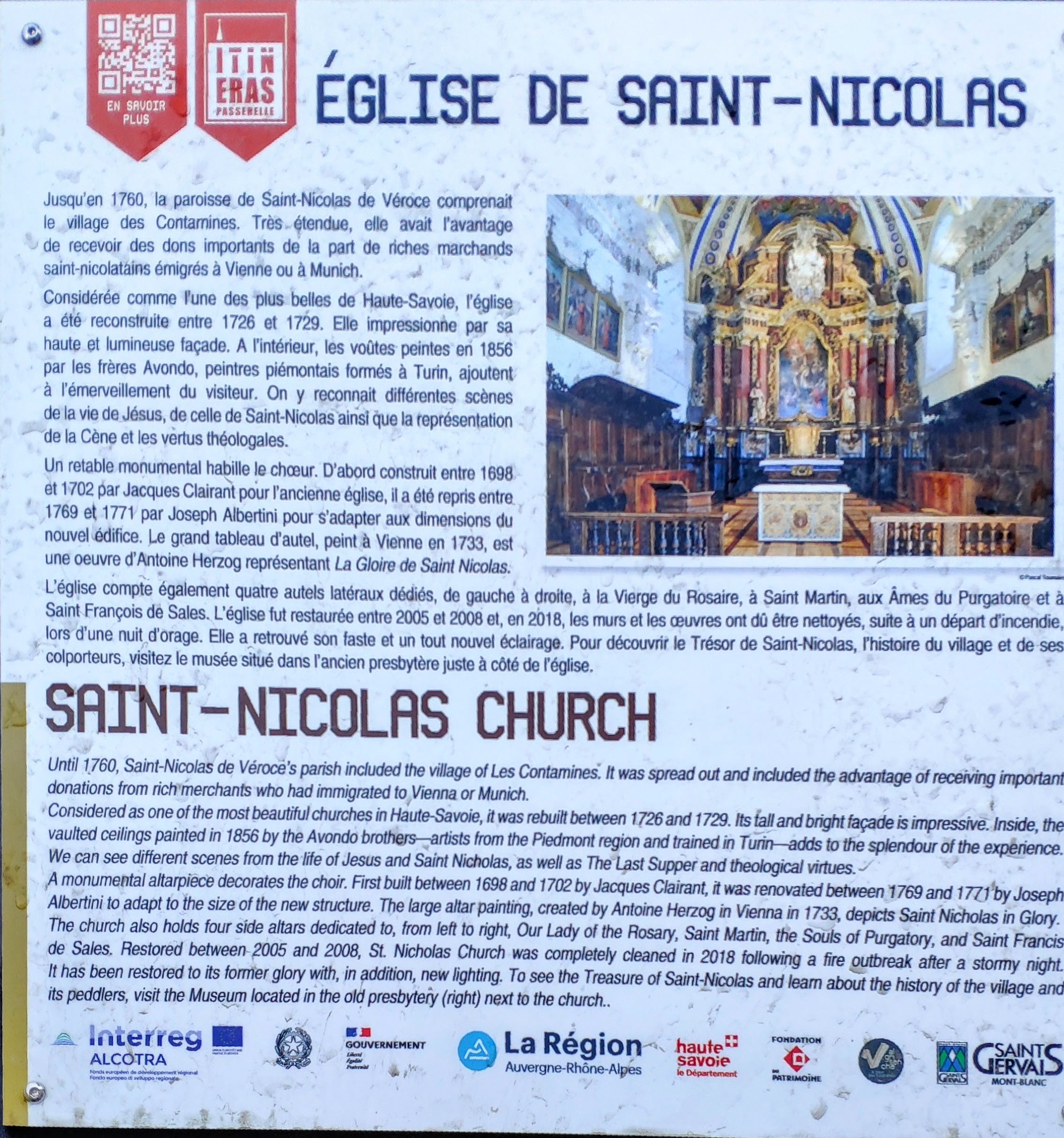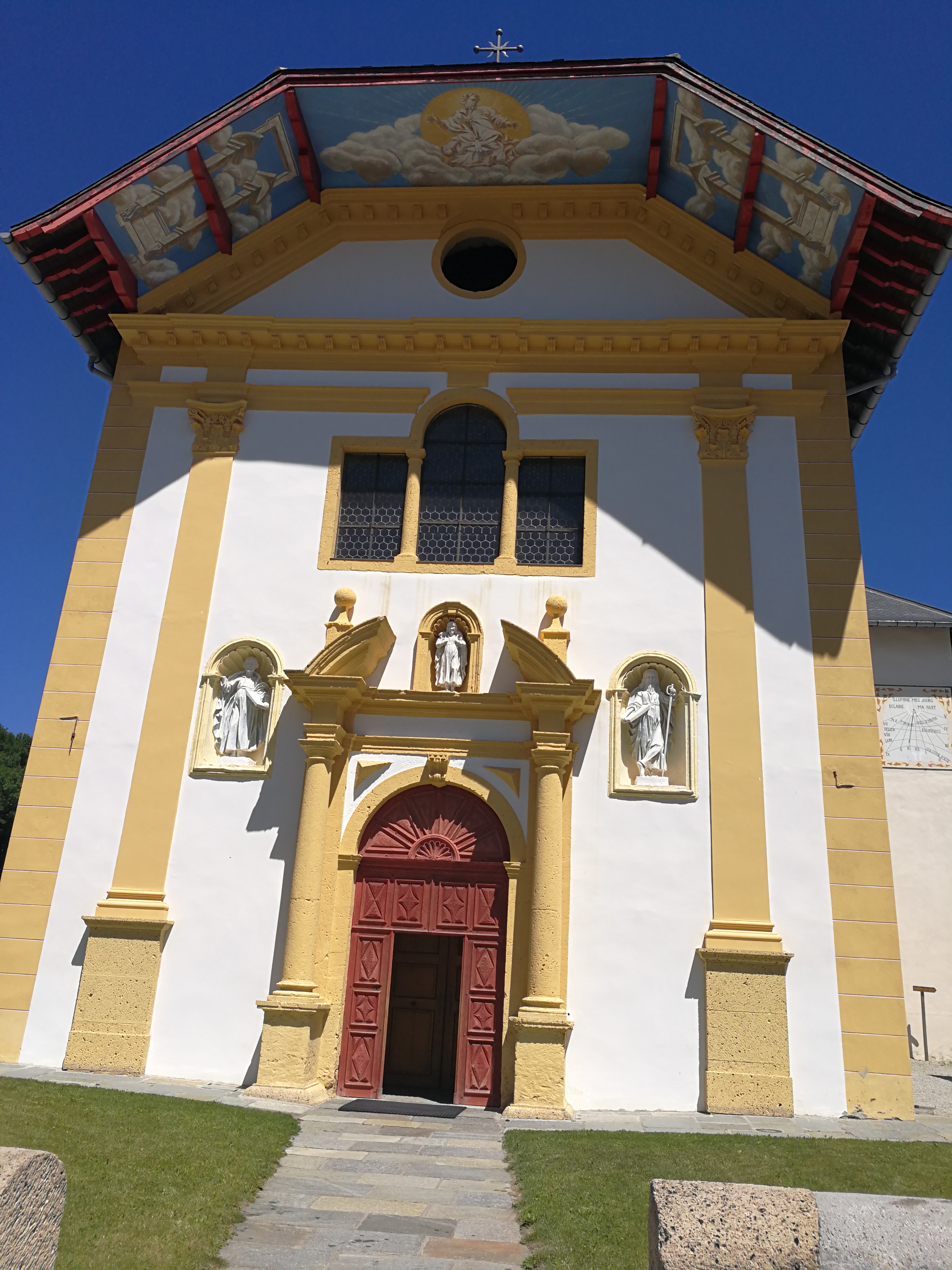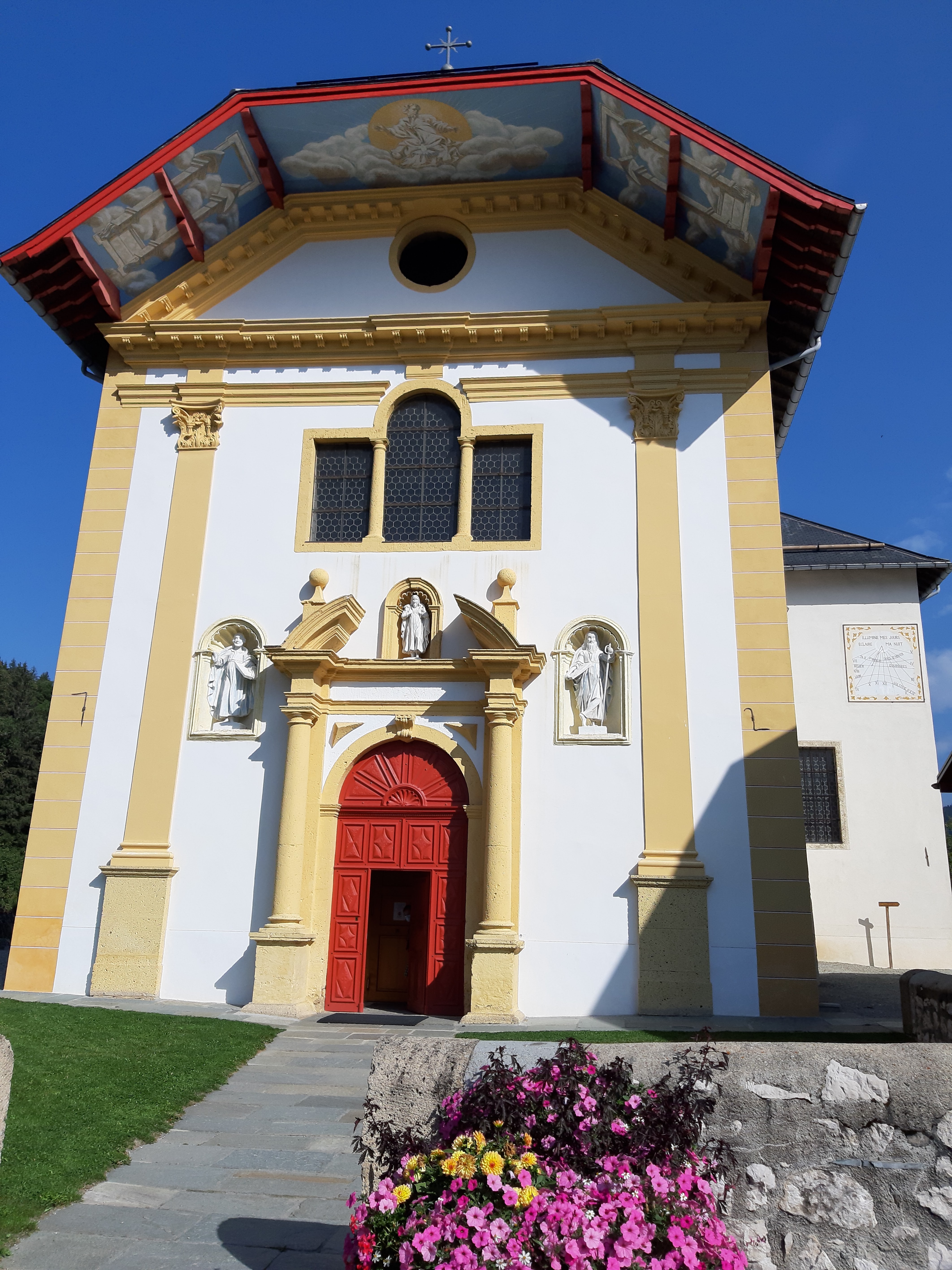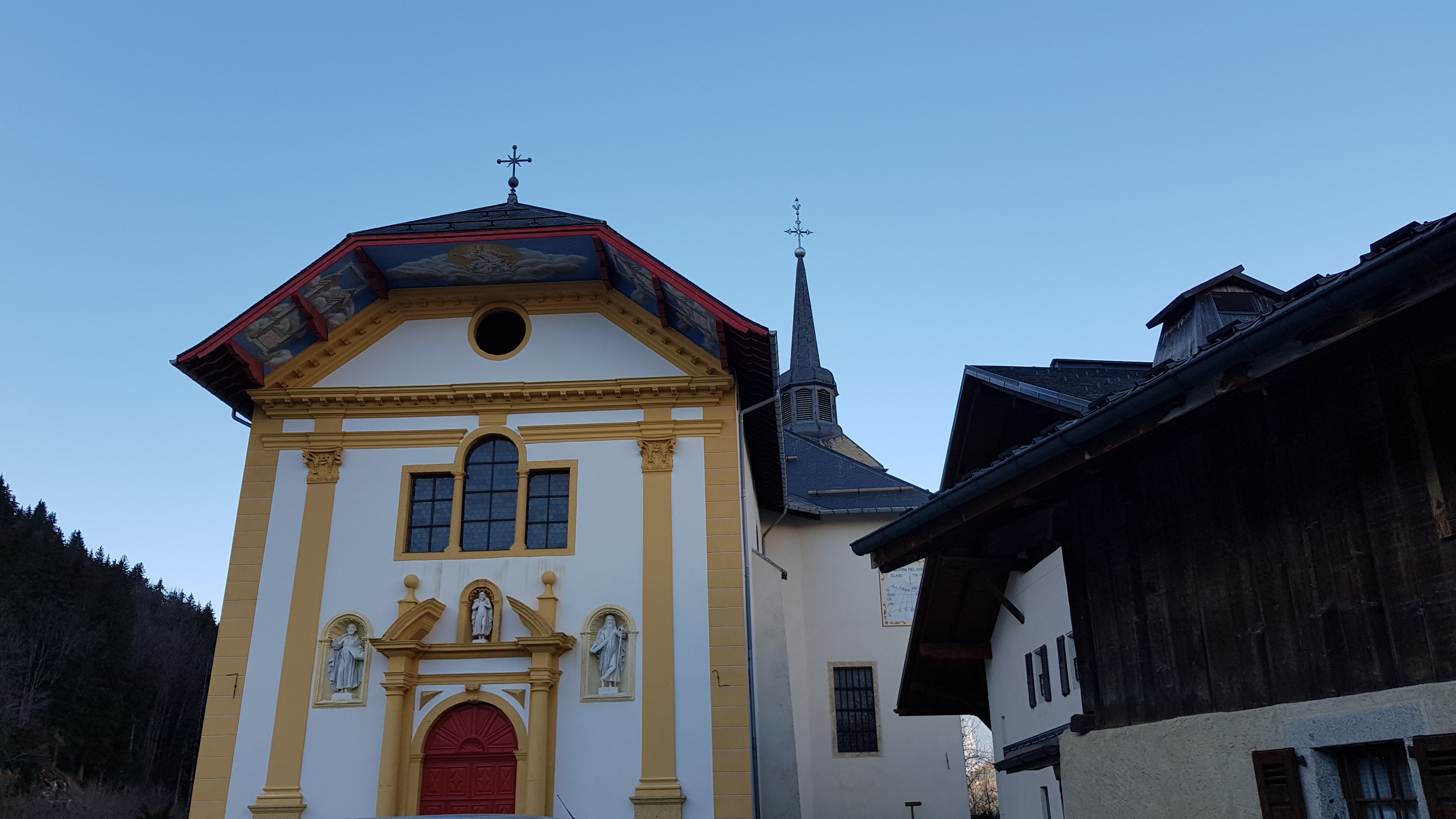 Eglise baroque alpin remarquable par son intérieur éclatant de couleur (belle restauration).