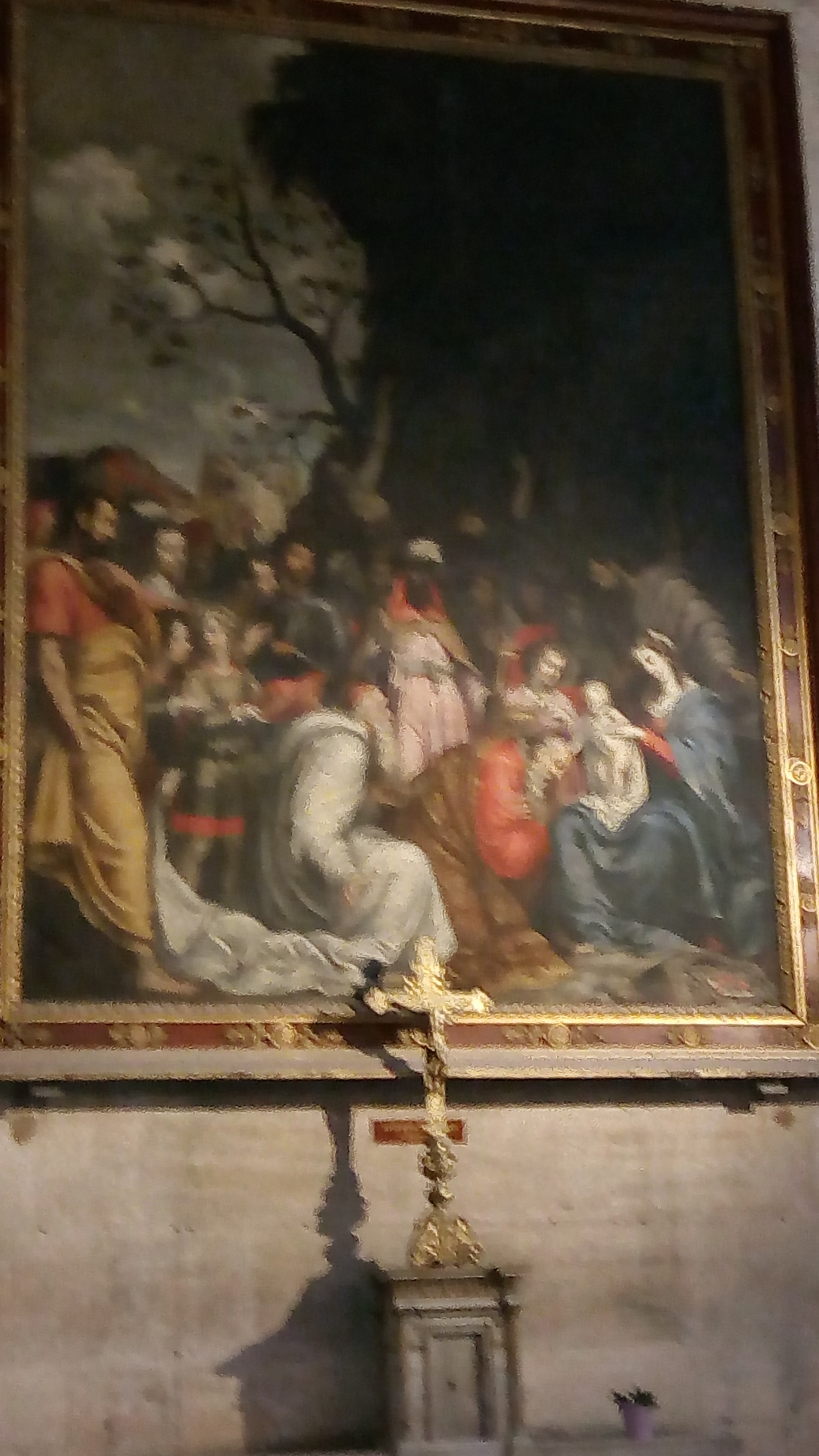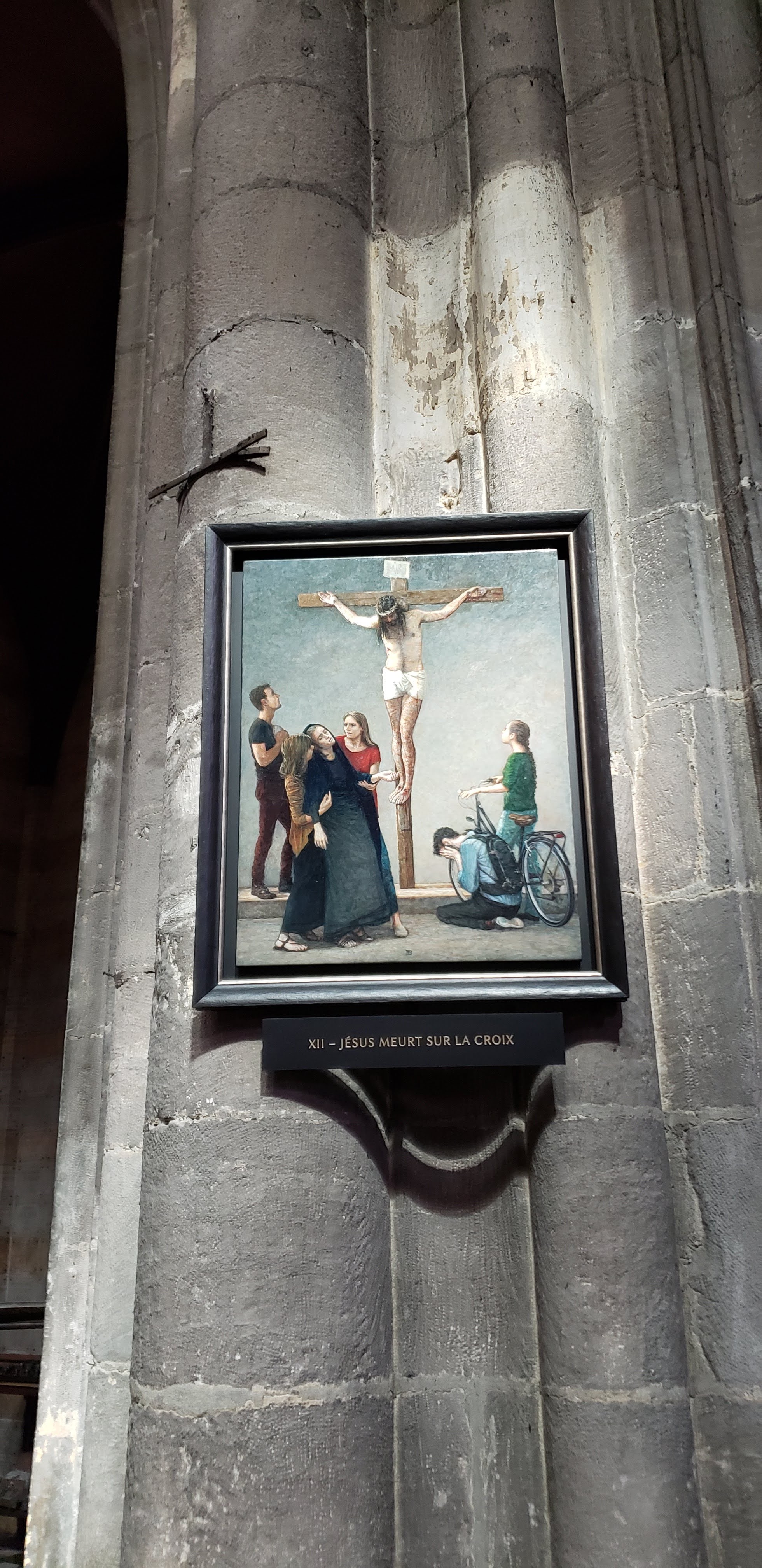 Cette église mérite le détour pour son incroyable chemin de croix. Les tableaux sont d'un style très réaliste, mais surtout ils sont très modernes. C'est assez classique de voir des chemins de croix anachroniques, comme pour le Christ lui-même, rarement représenté dans des tenues conformes au 1er siècle de notre ère. Mais là, on y voit des téléphones mobiles, des casques de moto, un vélo, des images qui font écho à l'actualité. Étonnant !