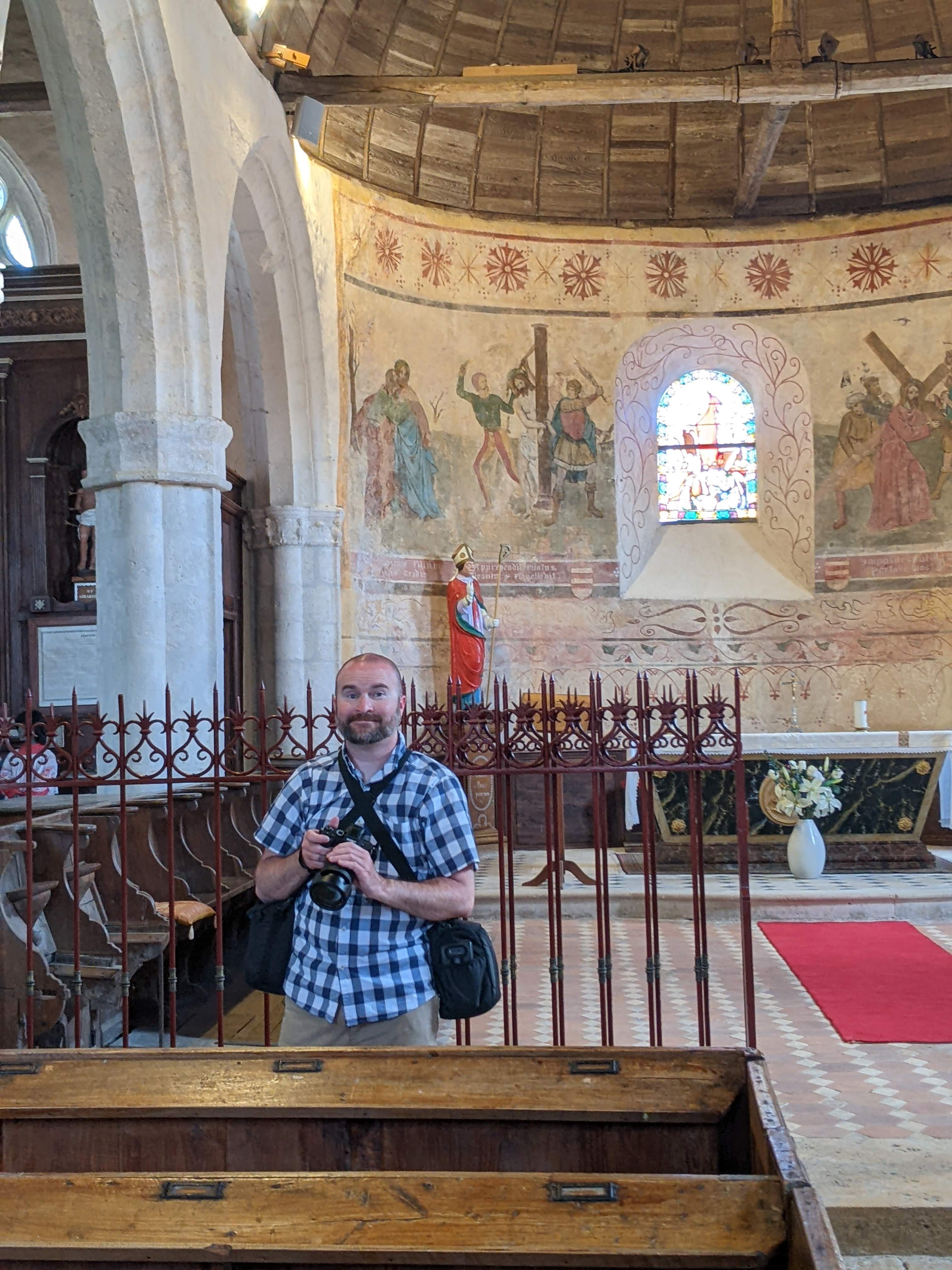 Nous avons loué des vélos électriques à Chartres et sommes allés à l'église pour une visite guidée. Bien que vous puissiez jeter un coup d'œil à l'intérieur pour voir les fresques, vous devez réserver à l'avance pour une visite guidée, qui est en français. Cependant, notre très aimable guide nous a imprimé quelques informations en anglais. Ce fut une visite fantastique !