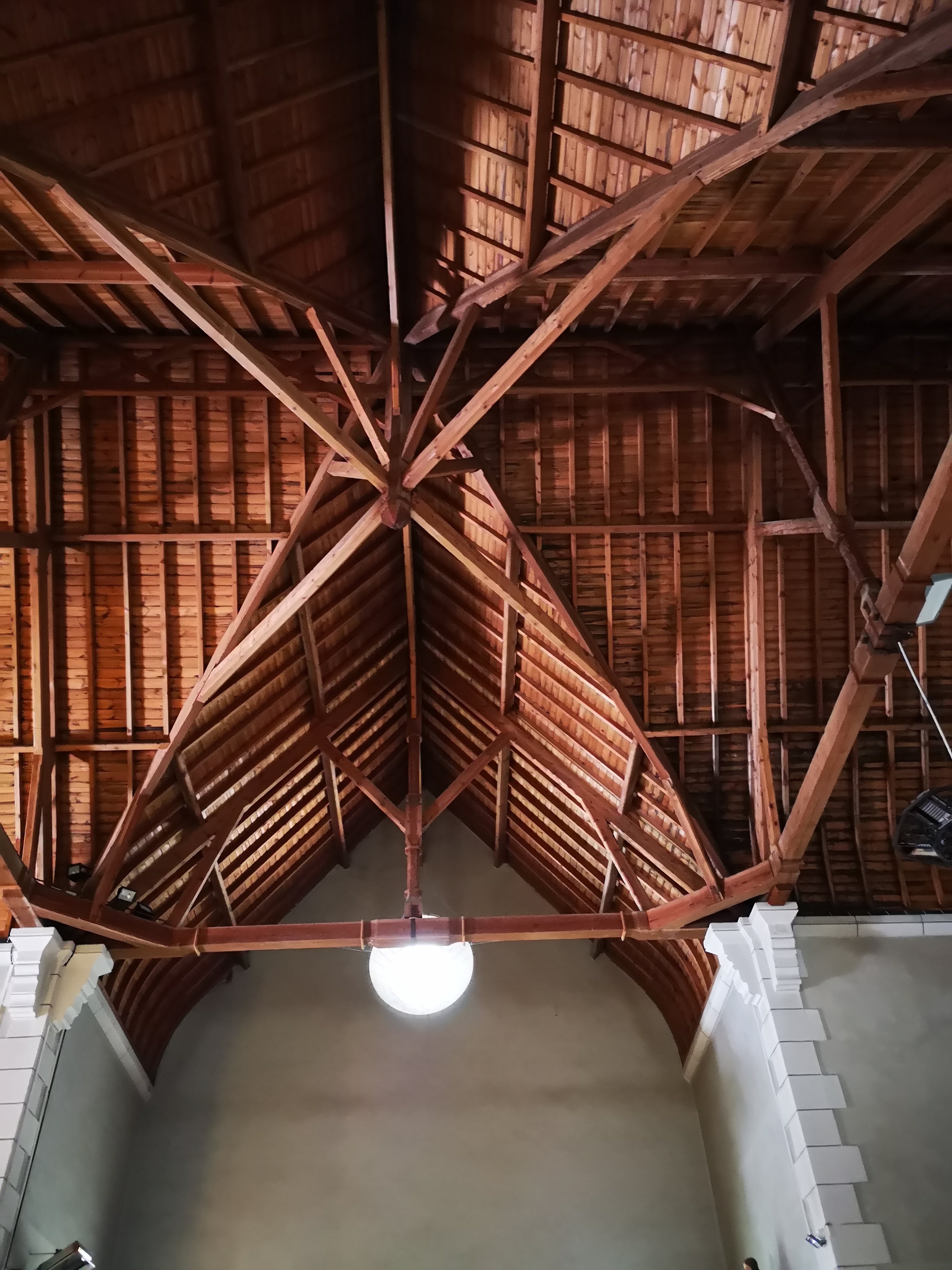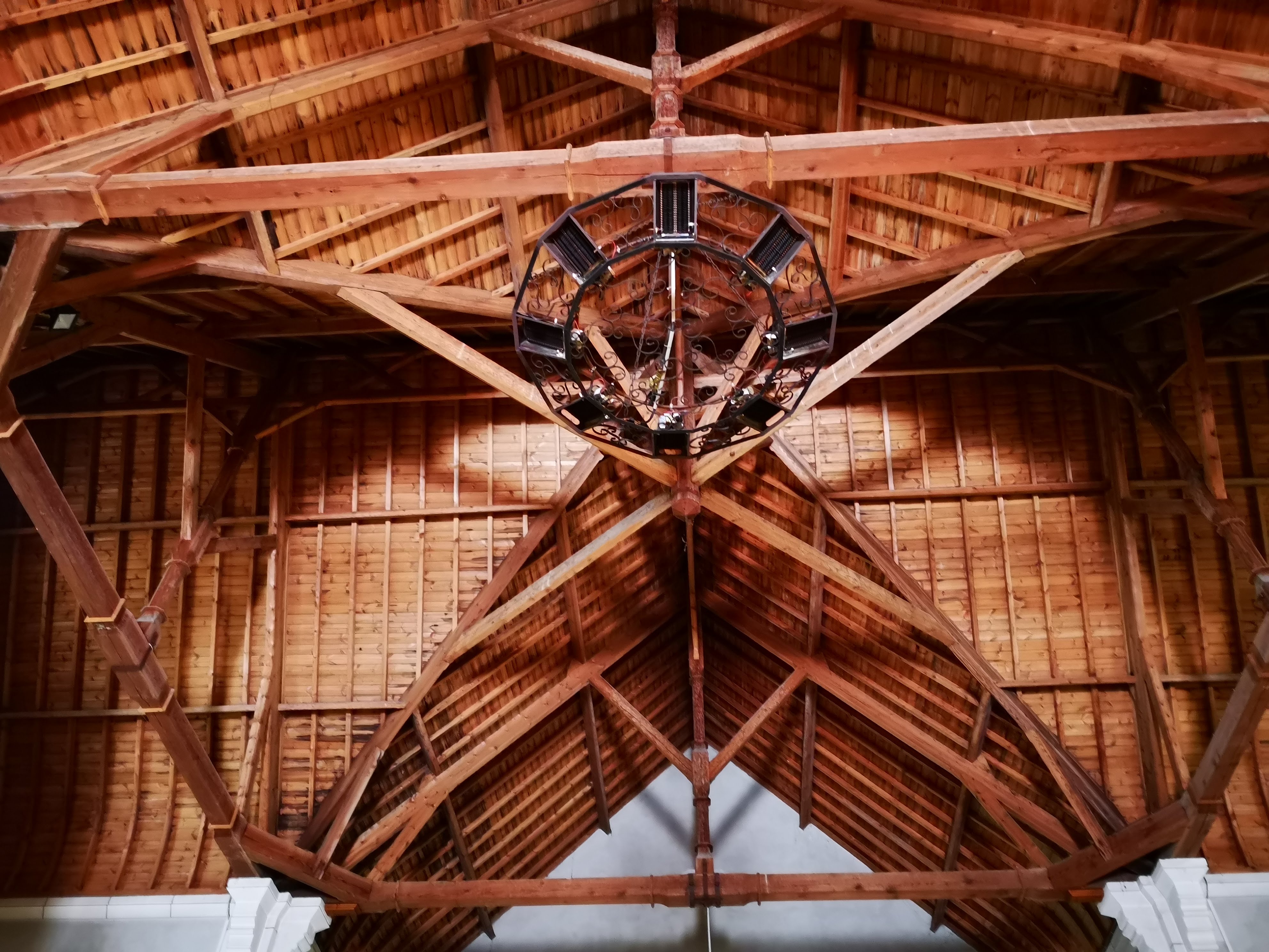 Très jolie église extérieure comme intérieure avec une jolie charpente visible et de beaux vitraux