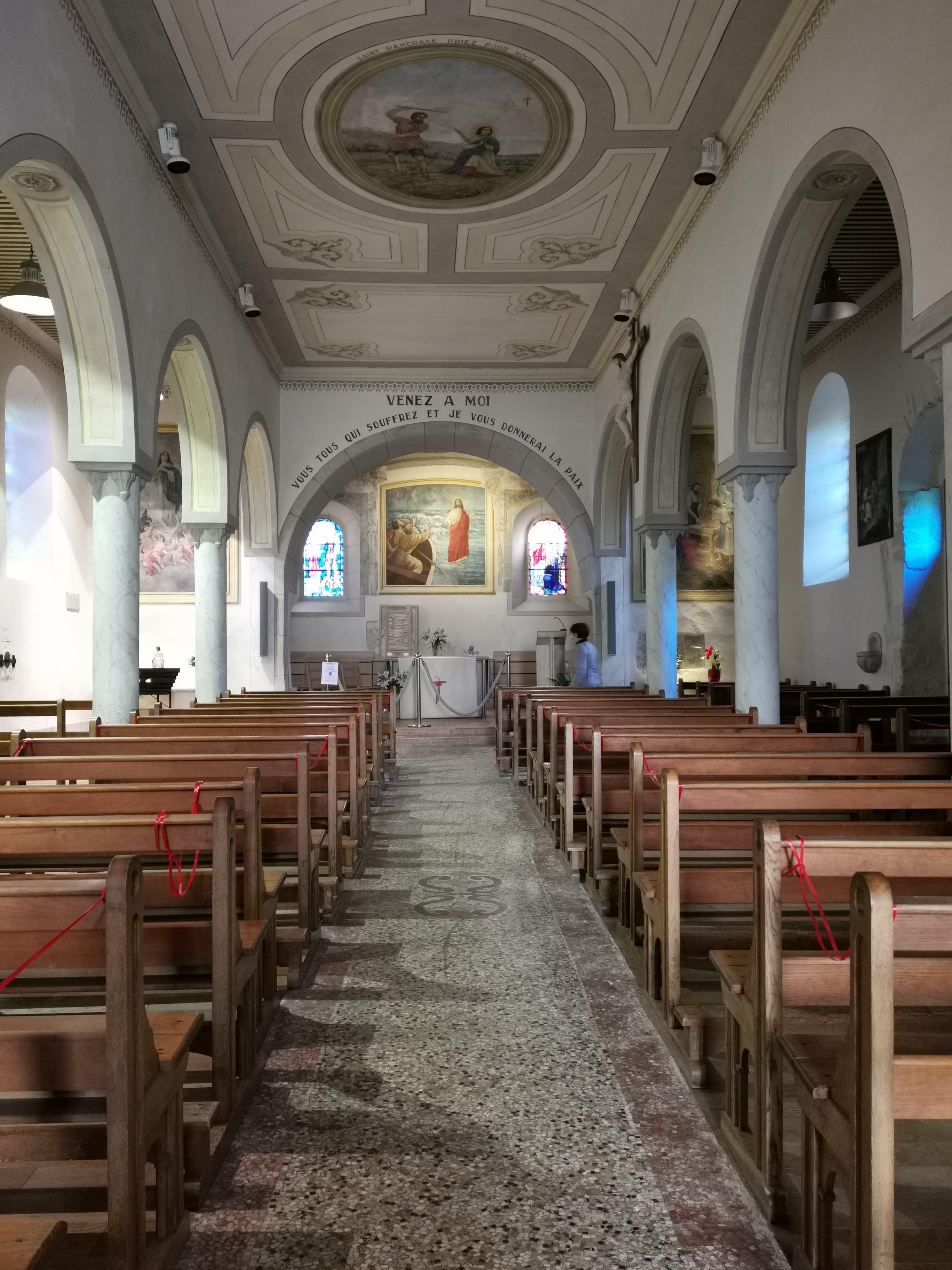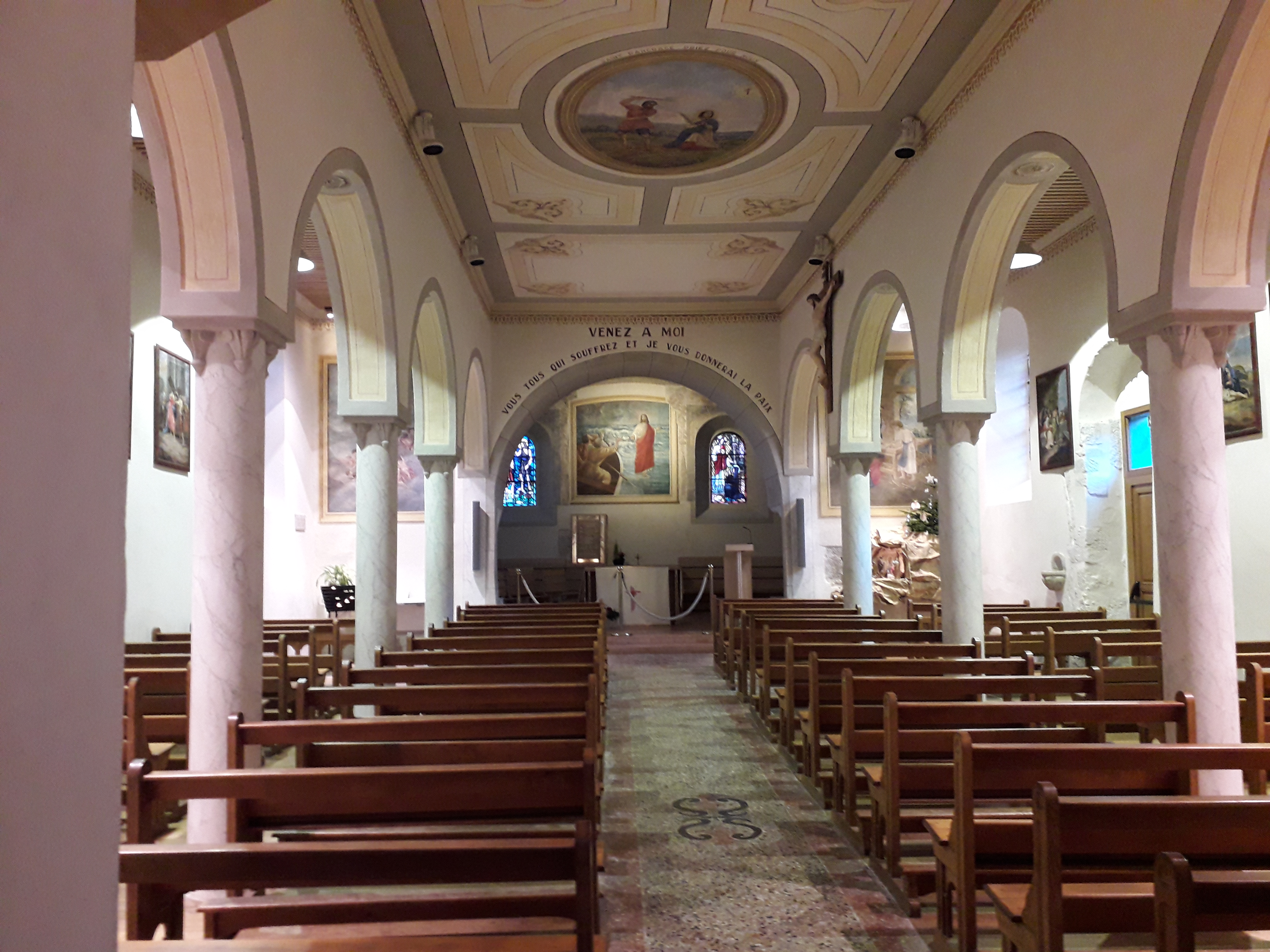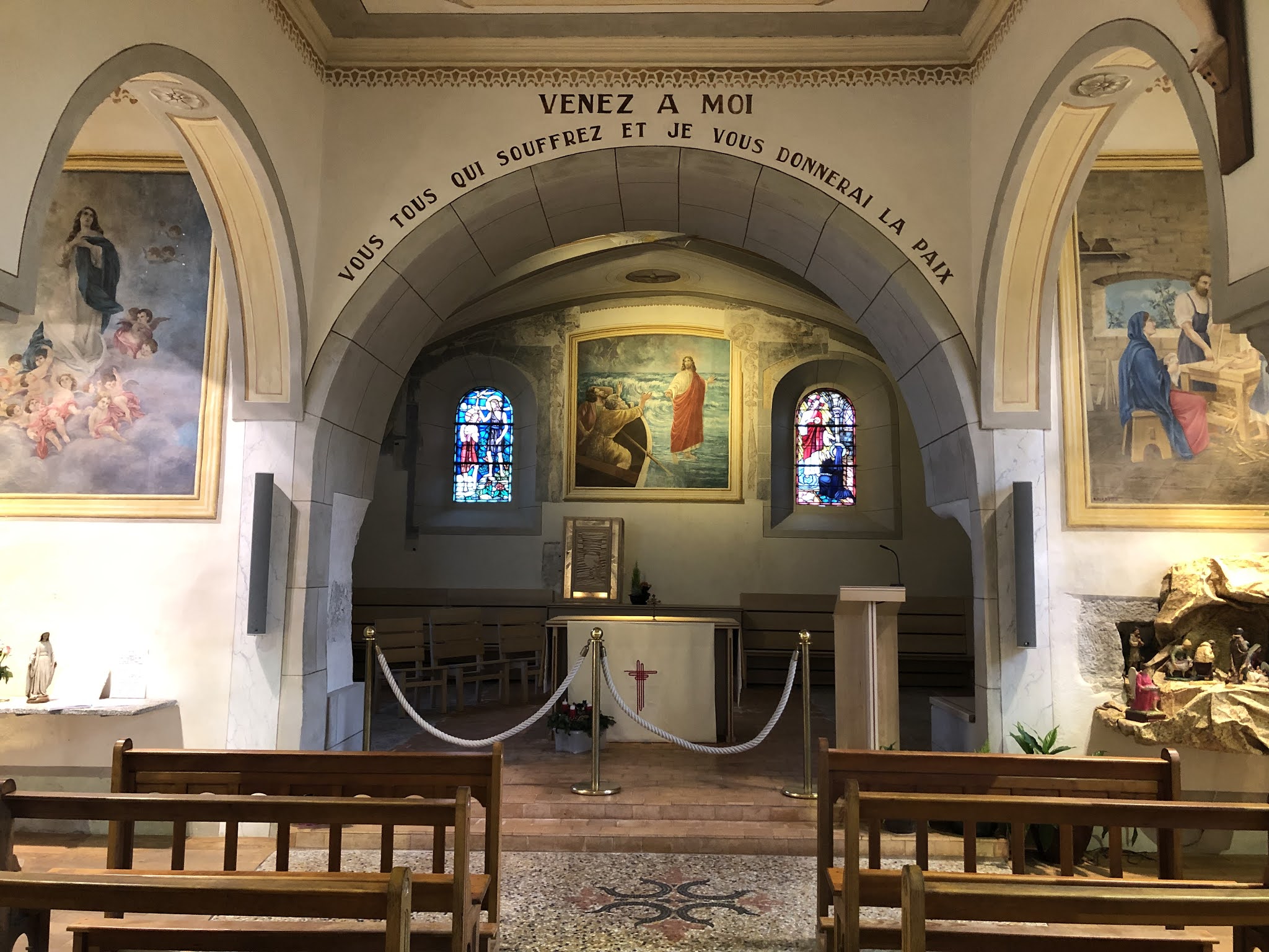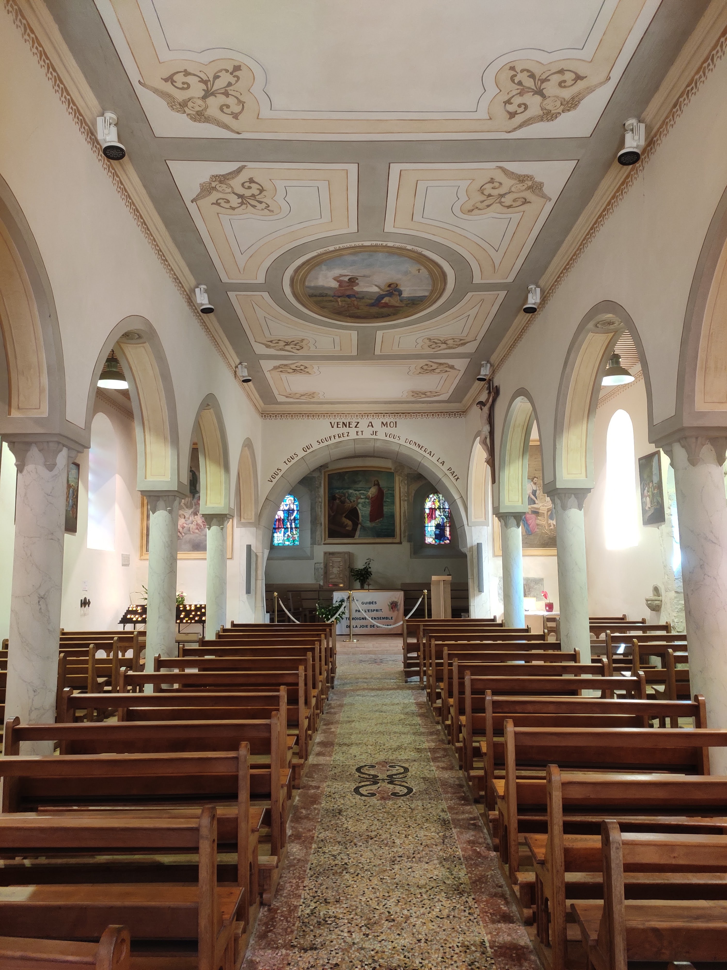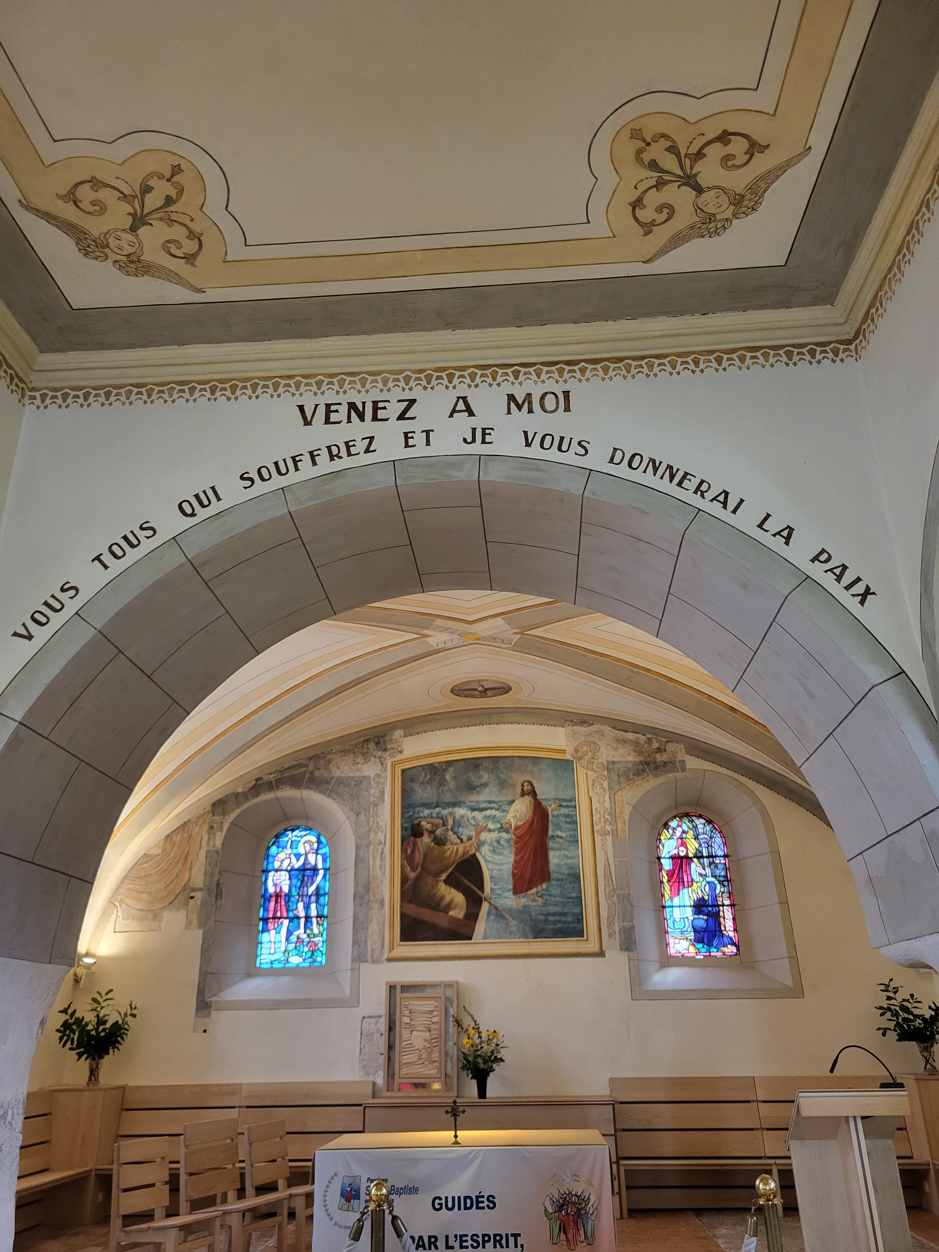 Église simple et lumineuse. Bien sûr, l'emplacement unique est magnifique : au-dessus du lac, avec vue sur les montagnes et dans la ville pittoresque d'Yvoire.
