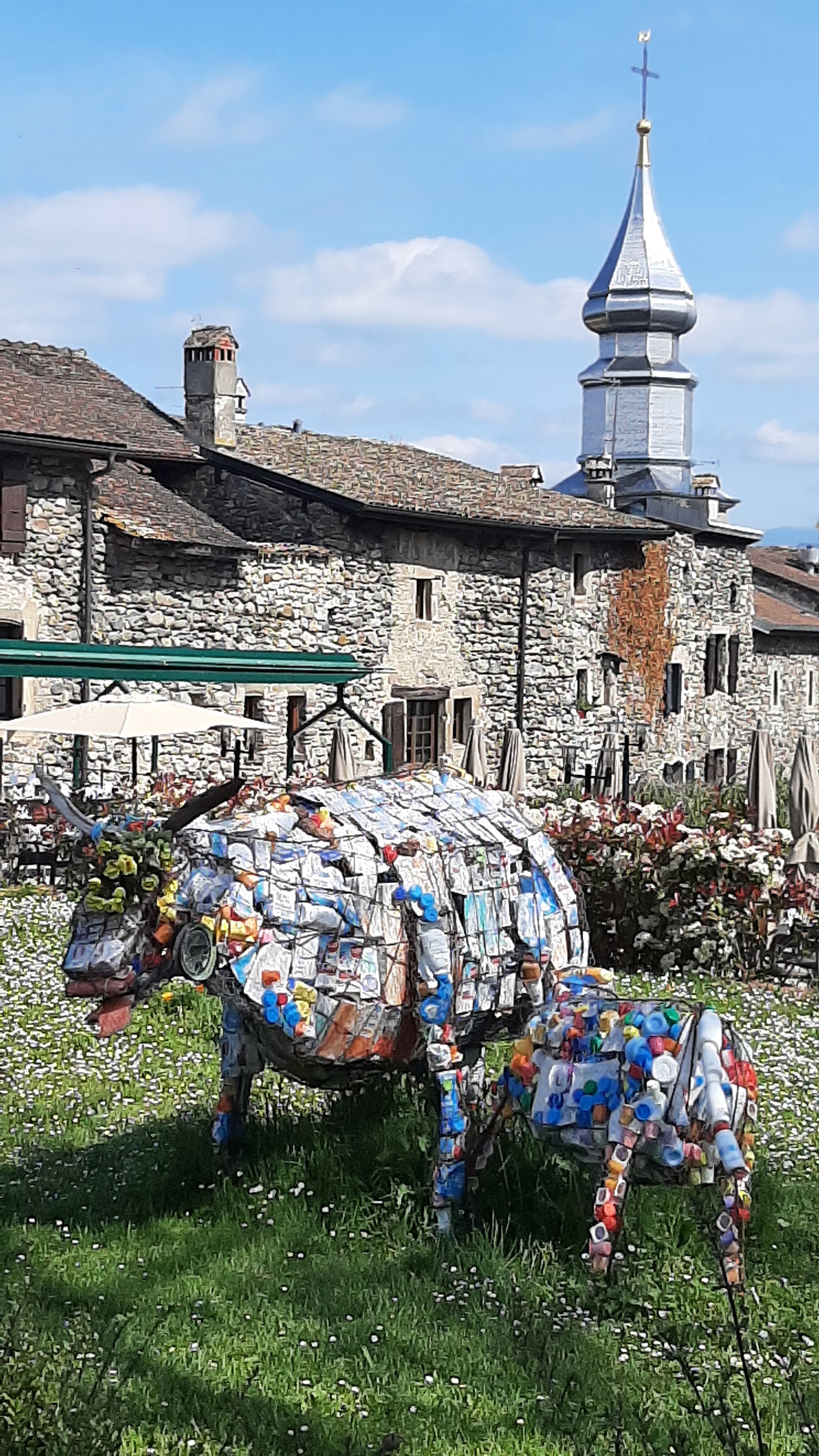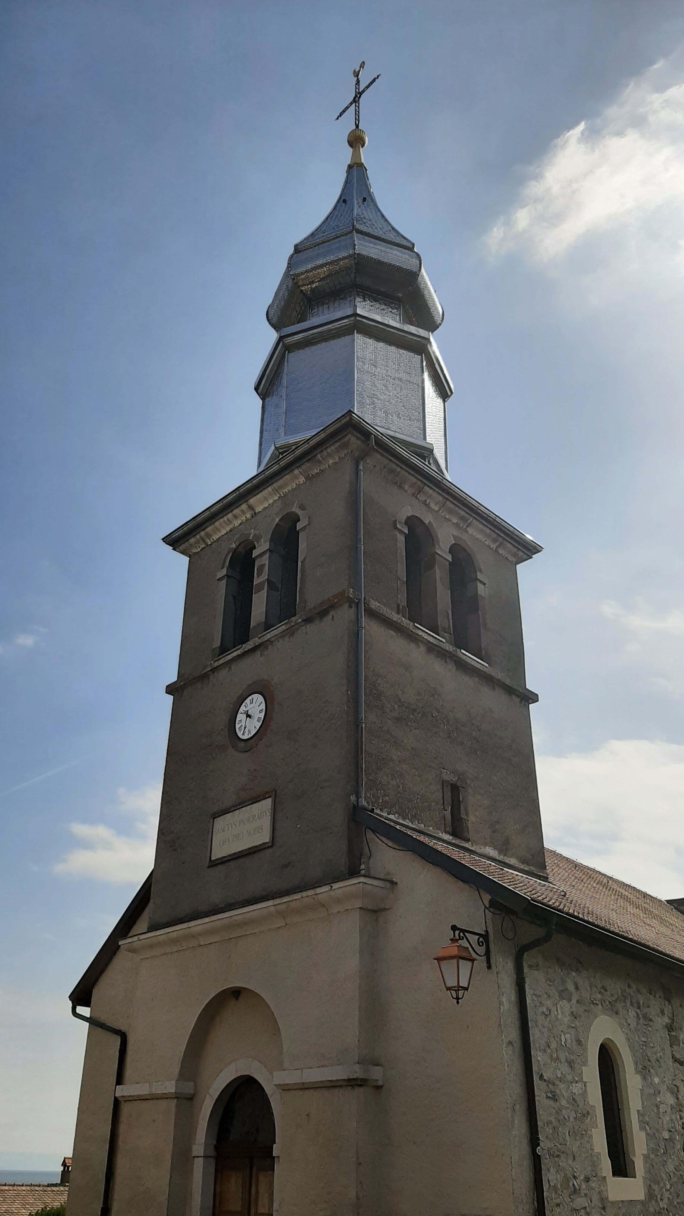 L’église d’Yvoire est simple et assez petite. Il y règne le calme comparé aux ruelles. Le clocher est assez impressionnant dans la lumière du soleil, qui le fait resplendir.