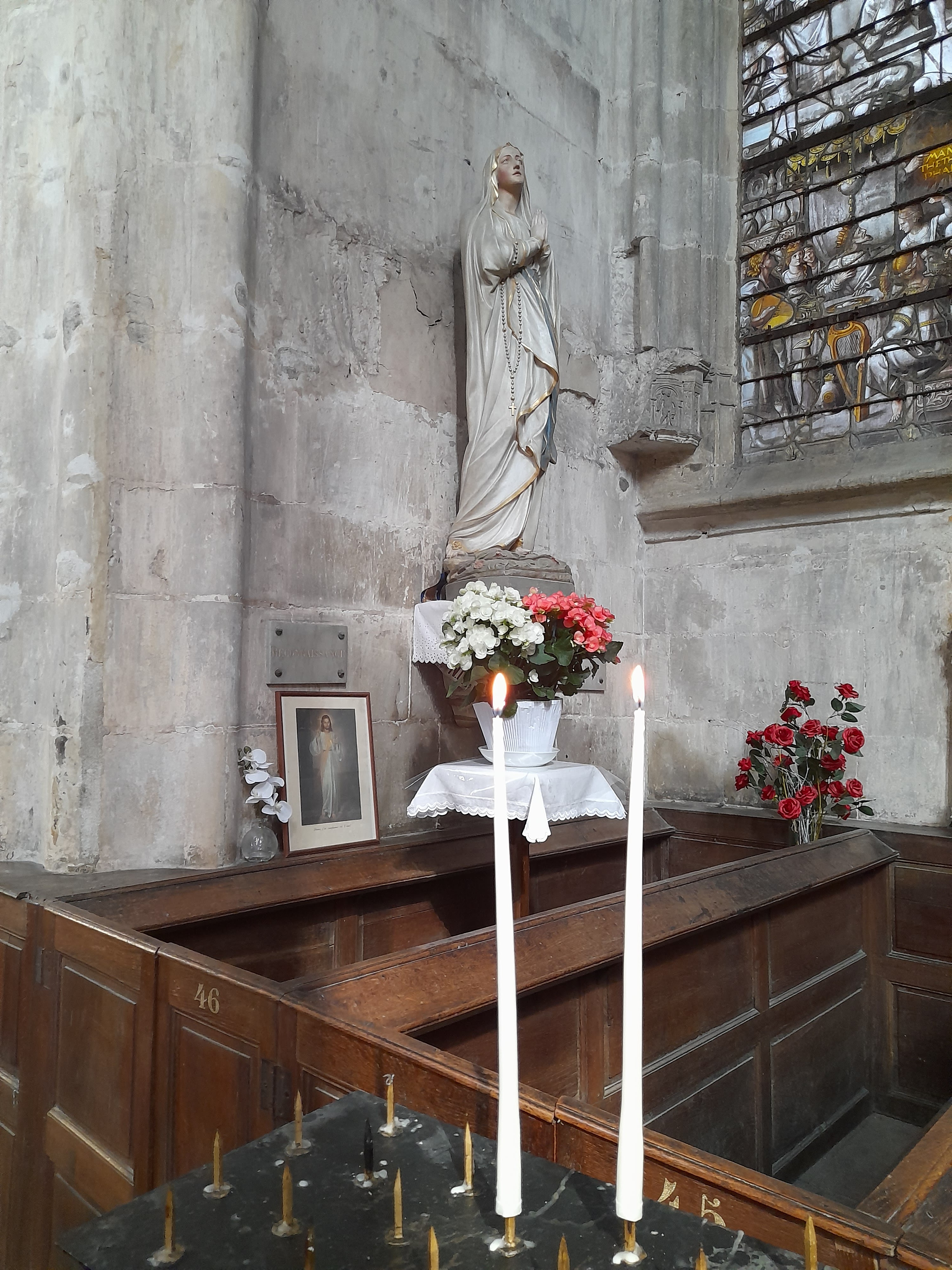 Lieu calme et reposant avec de jolies statues et de beaux vitraux.