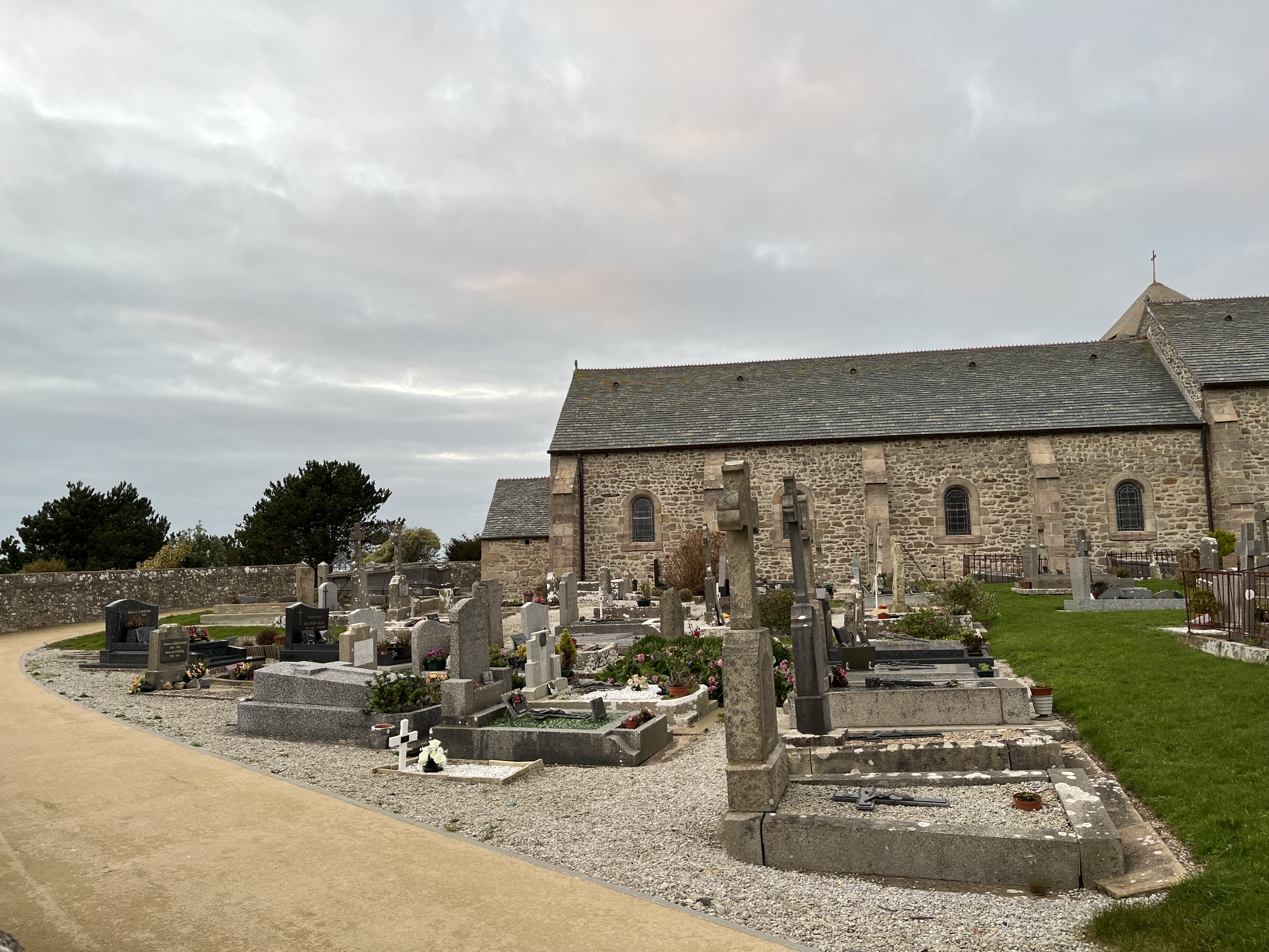 Une petite église de pierre au milieu d'un cimetière charmant, presque marin et couvert de gazon comme tous ceux de la région, du haut duquel on découvre une vue magnifique sur cette côte Nord du Cotentin. Quelle tranquillité !
