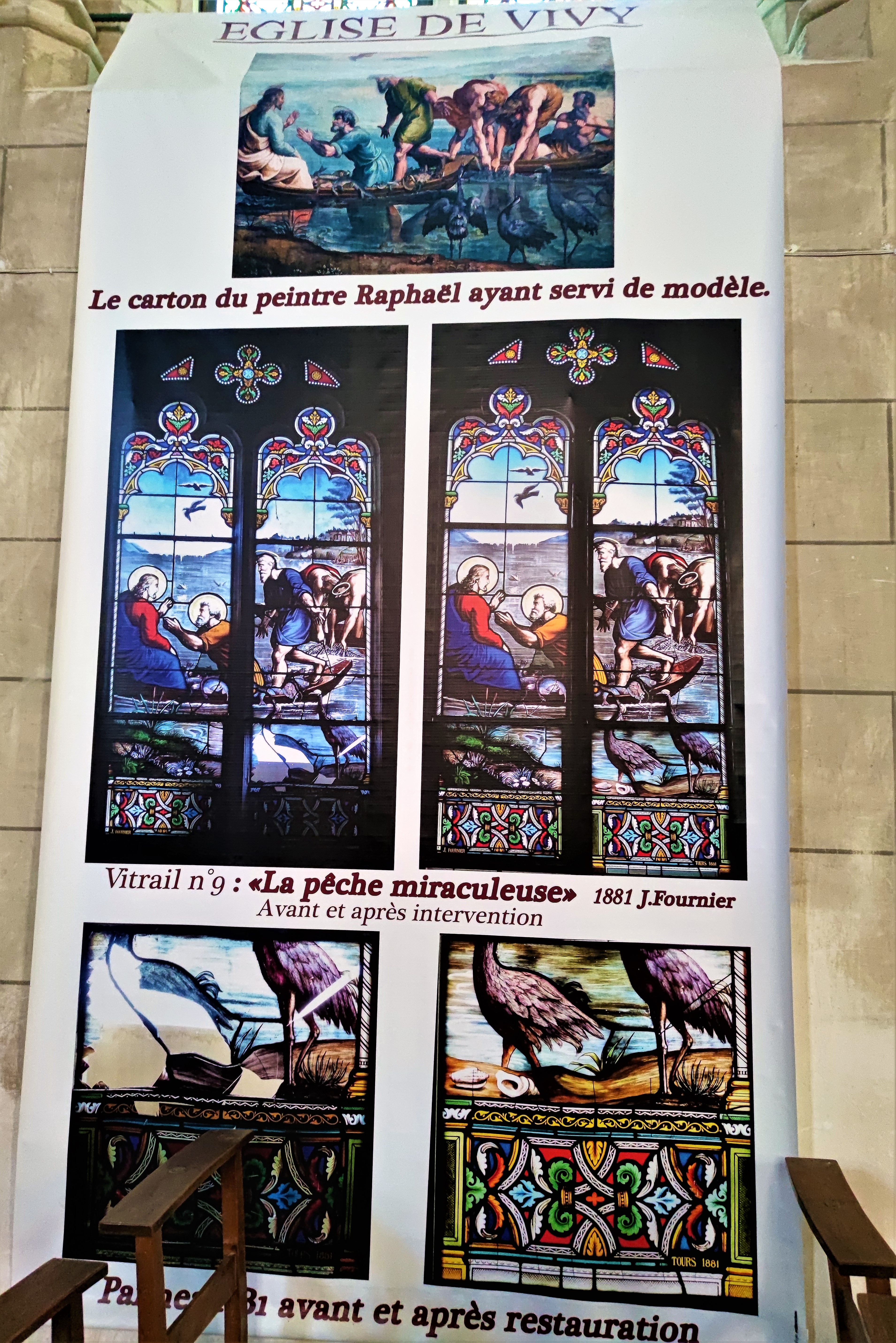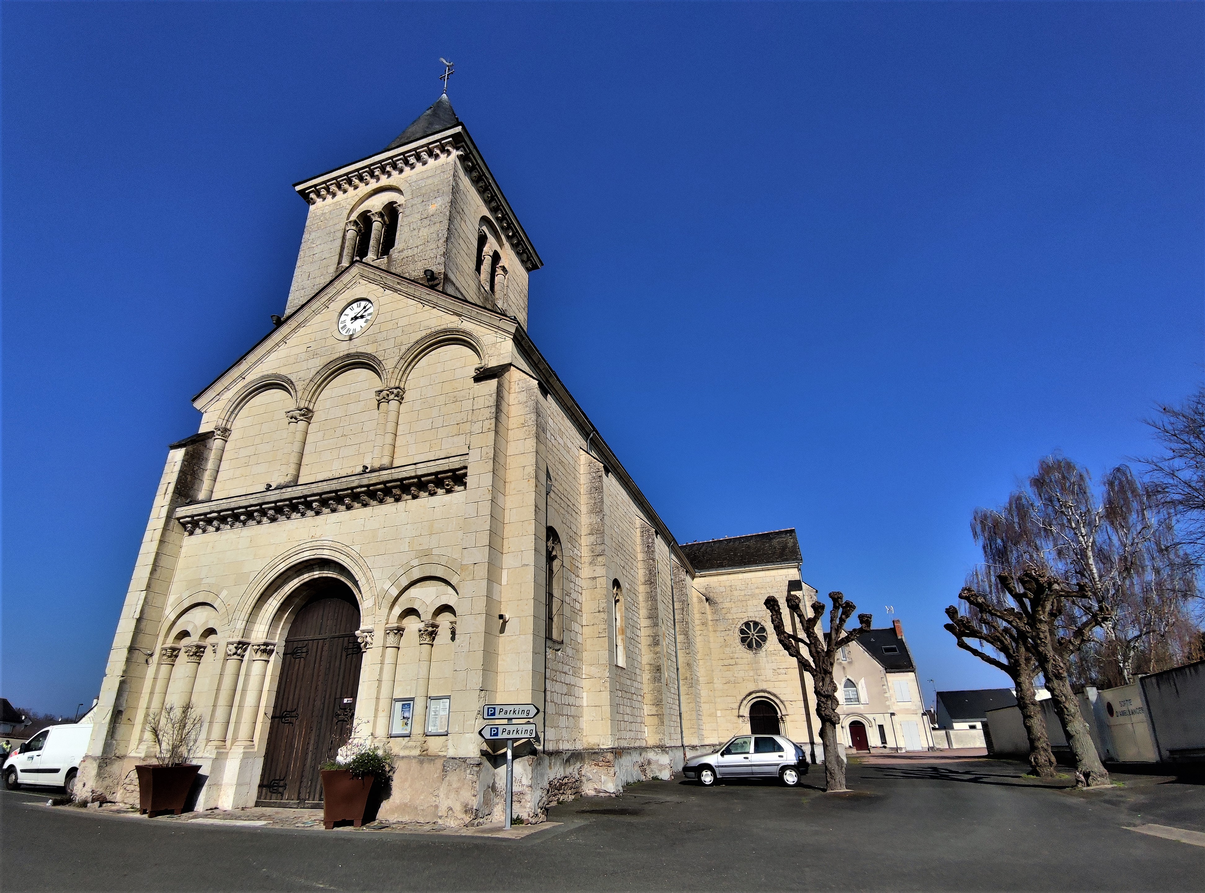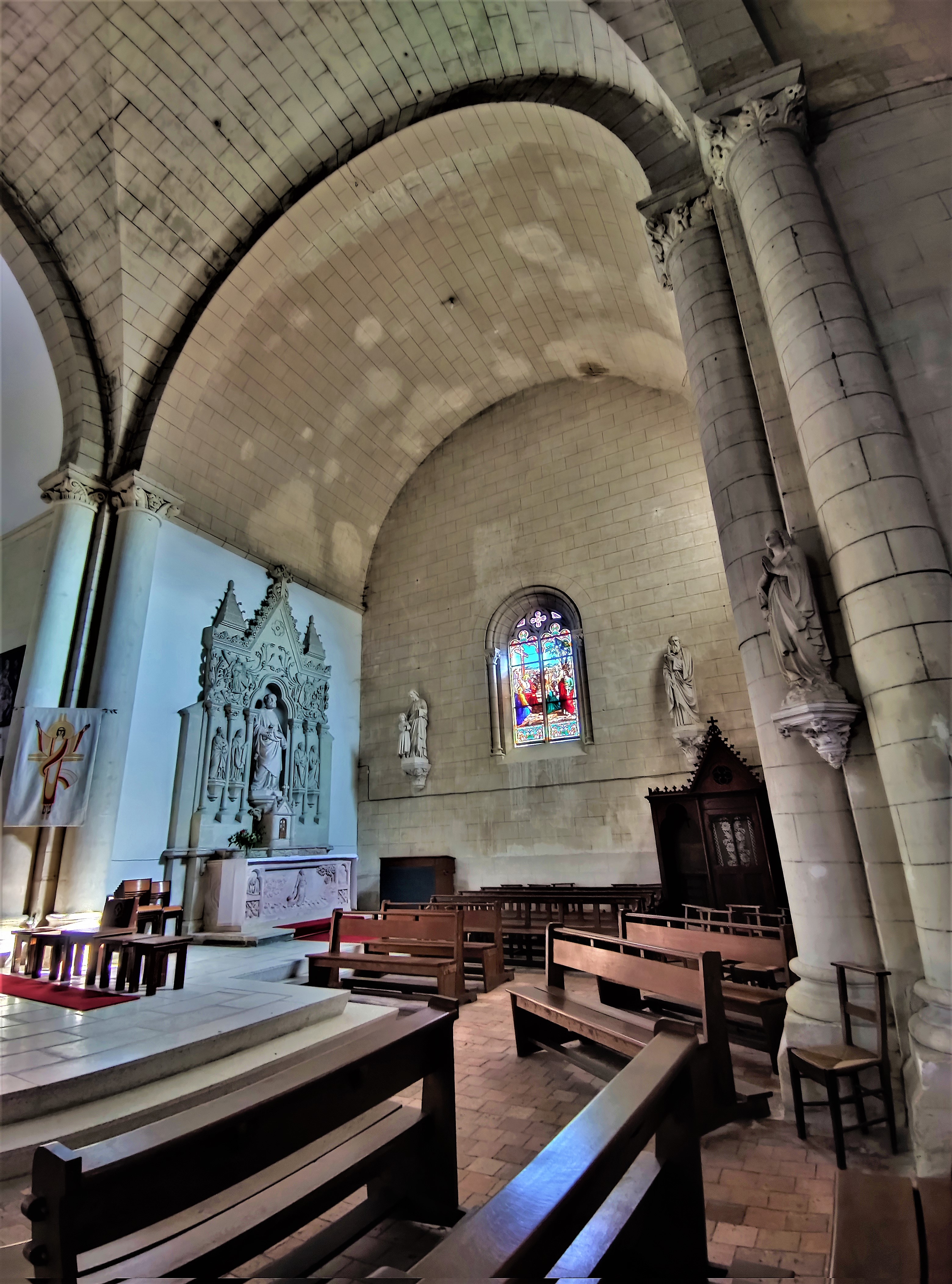 Cette église du 19ème, construite par nécessité, m'a séduit par son charme et son histoire. L'église Saint-Paul de Vivy, ouverte et accueillante, bien mise en valeur sur la place de la cité, fut construite en 1843 avec les matériaux de l'ancienne église. De ce fait, on retrouve en façade un ensemble de modillons supportant la corniche et d'autres supportant la partie haute du clocher. Ce village était autrefois situé sur les bords de l'Authion, à, Le Vieux Bourg, près du port. Les inondations fréquentes, causes de dégradations et d'insalubrité, ont incité les habitants à déménager le village et son église au milieu du 19ème siècle. La nef unique voûtée en berceau, le sanctuaire logé dans une abside semi-circulaire, ces touches romanes offrent à l'édifice un côté intimiste et chaleureux. Les ouvertures gothiques et leurs beaux vitraux apportent une lumière abondante et colorée.