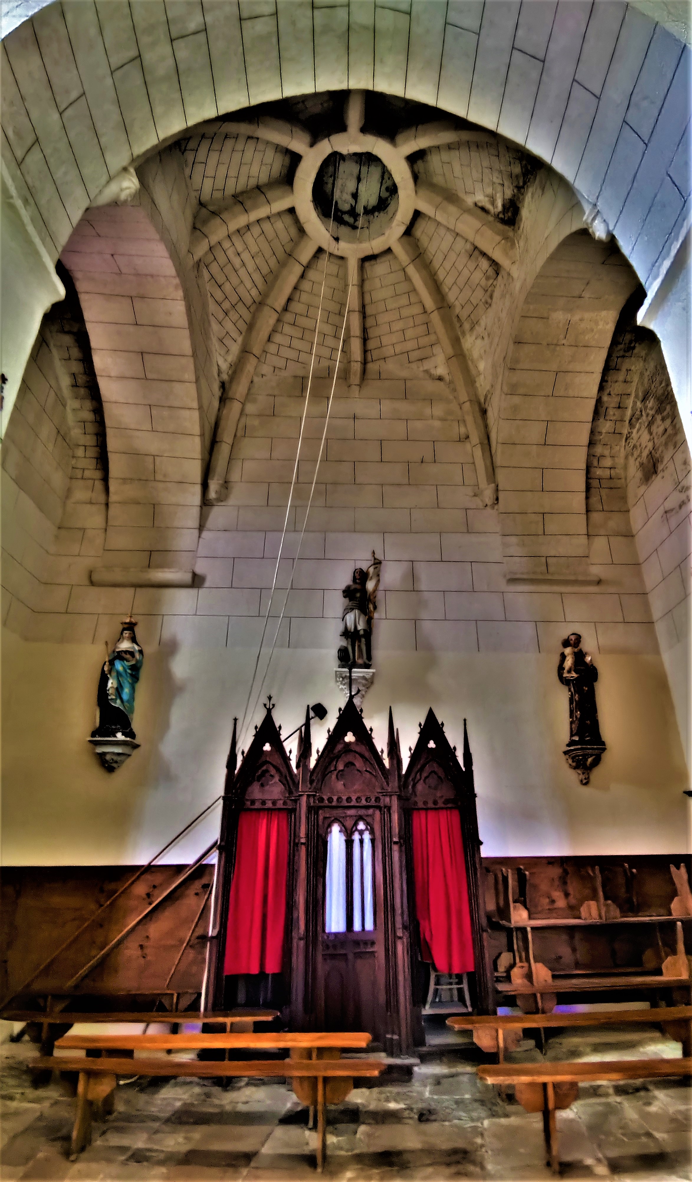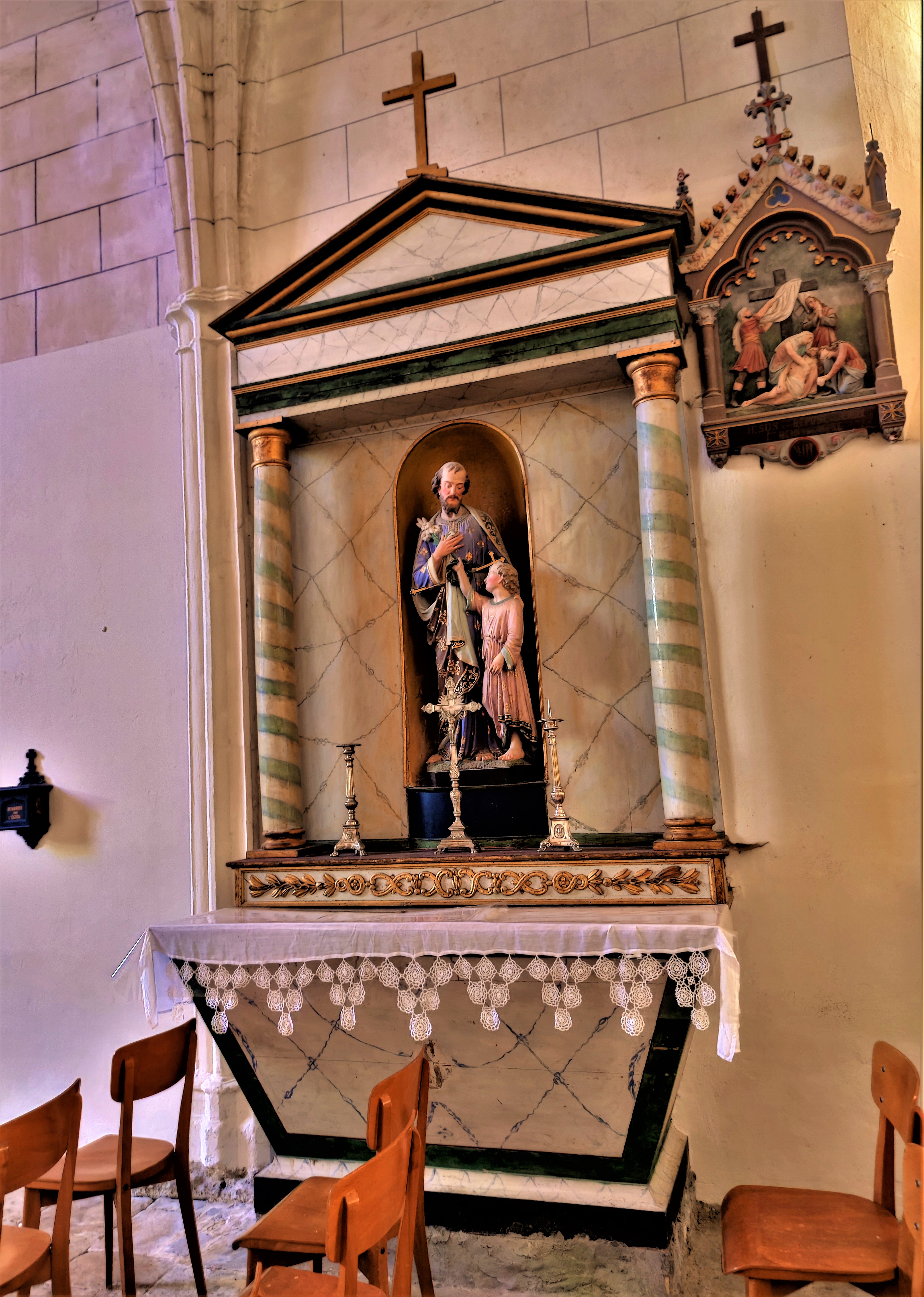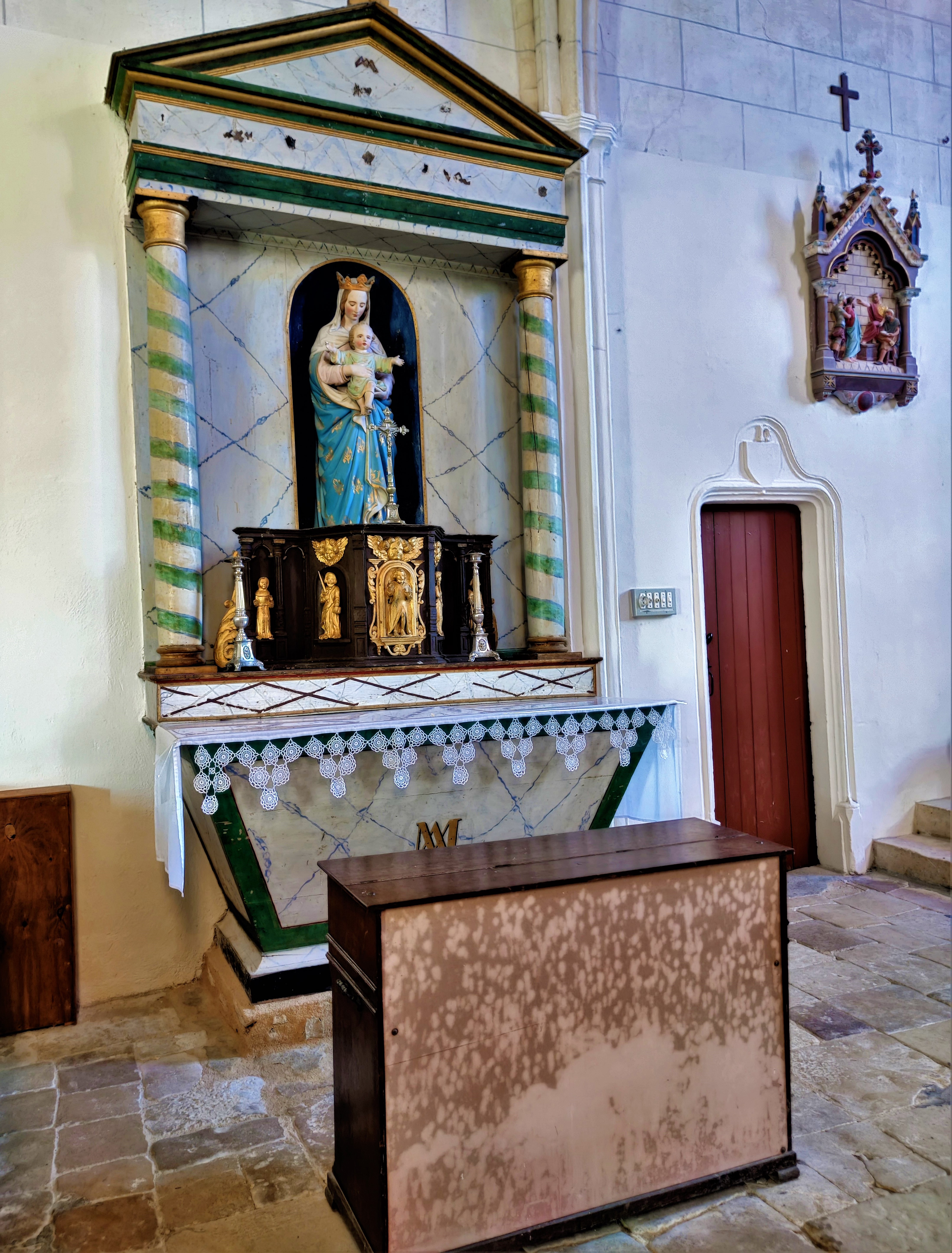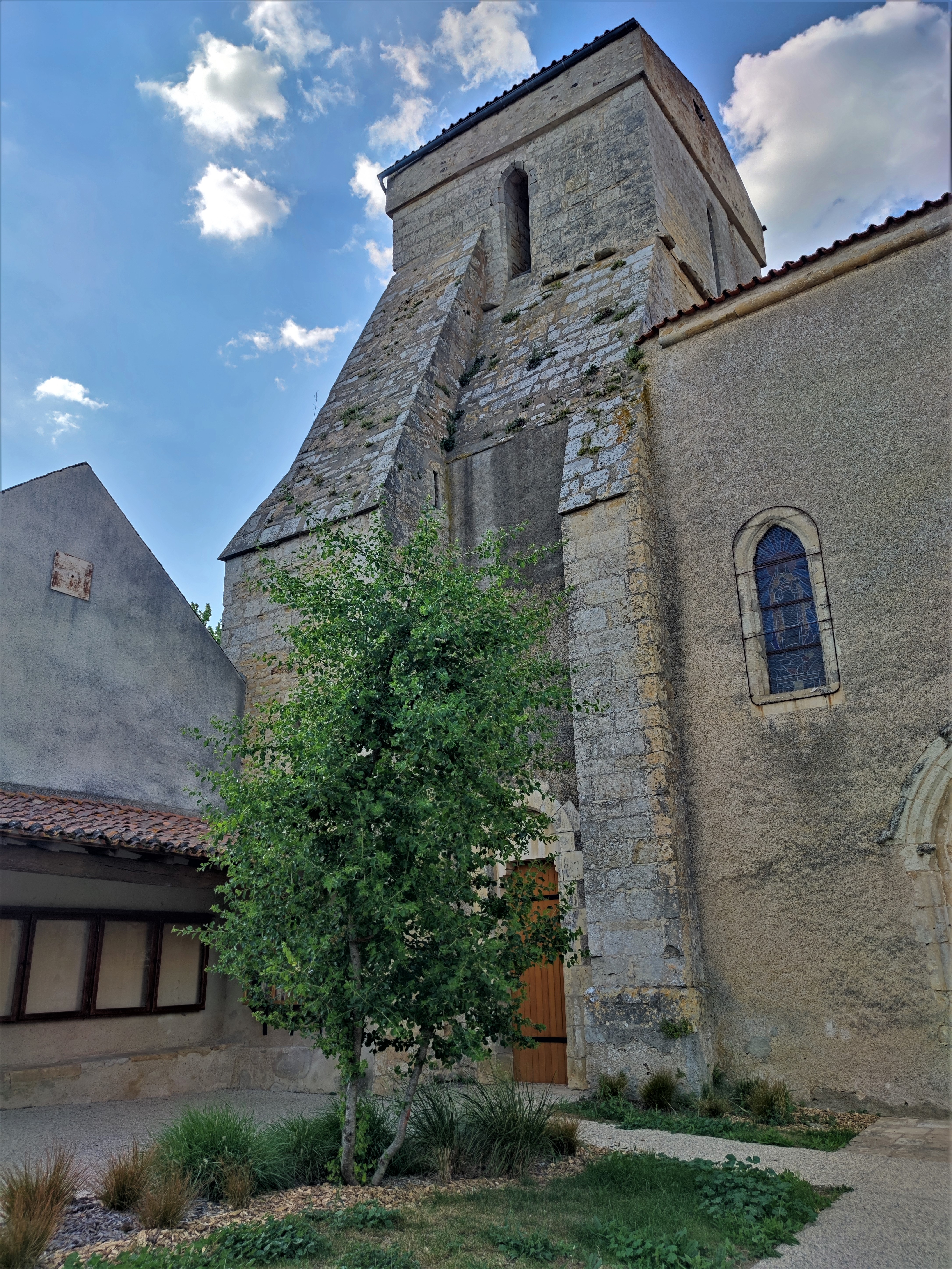 Son intérêt est dans sa simplicité, architecture, vitraux et mobilier sont à découvrir. Église du 11ème, fortifiée pendant la guerre de cent ans, reconstruite pour partie au 15ème, elle sera incendiée par les protestants au 16ème. L'imposant clocher sans flèche est un vestige de l'église primitive ainsi que les restes d'une échauguette au chevet. Pour y entrer, la mairie m'a redirigé vers un paroissien que je remercie pour sa disponibilité. Mémoire millénaire d'une communauté, cet édifice, placé au centre du village, est un point de repère. Son intérêt est dans sa simplicité, architecture, vitraux et mobilier sont à découvrir.