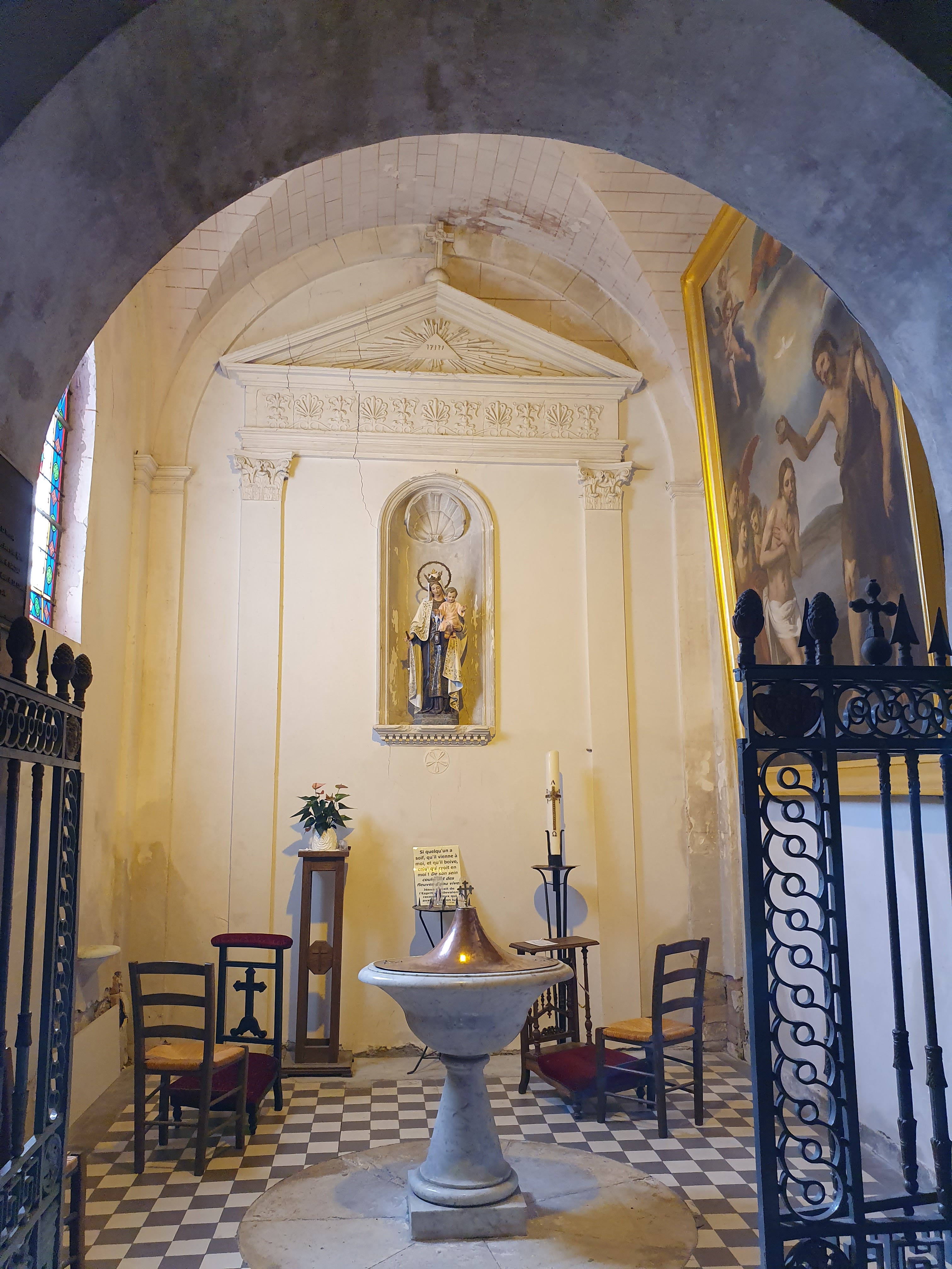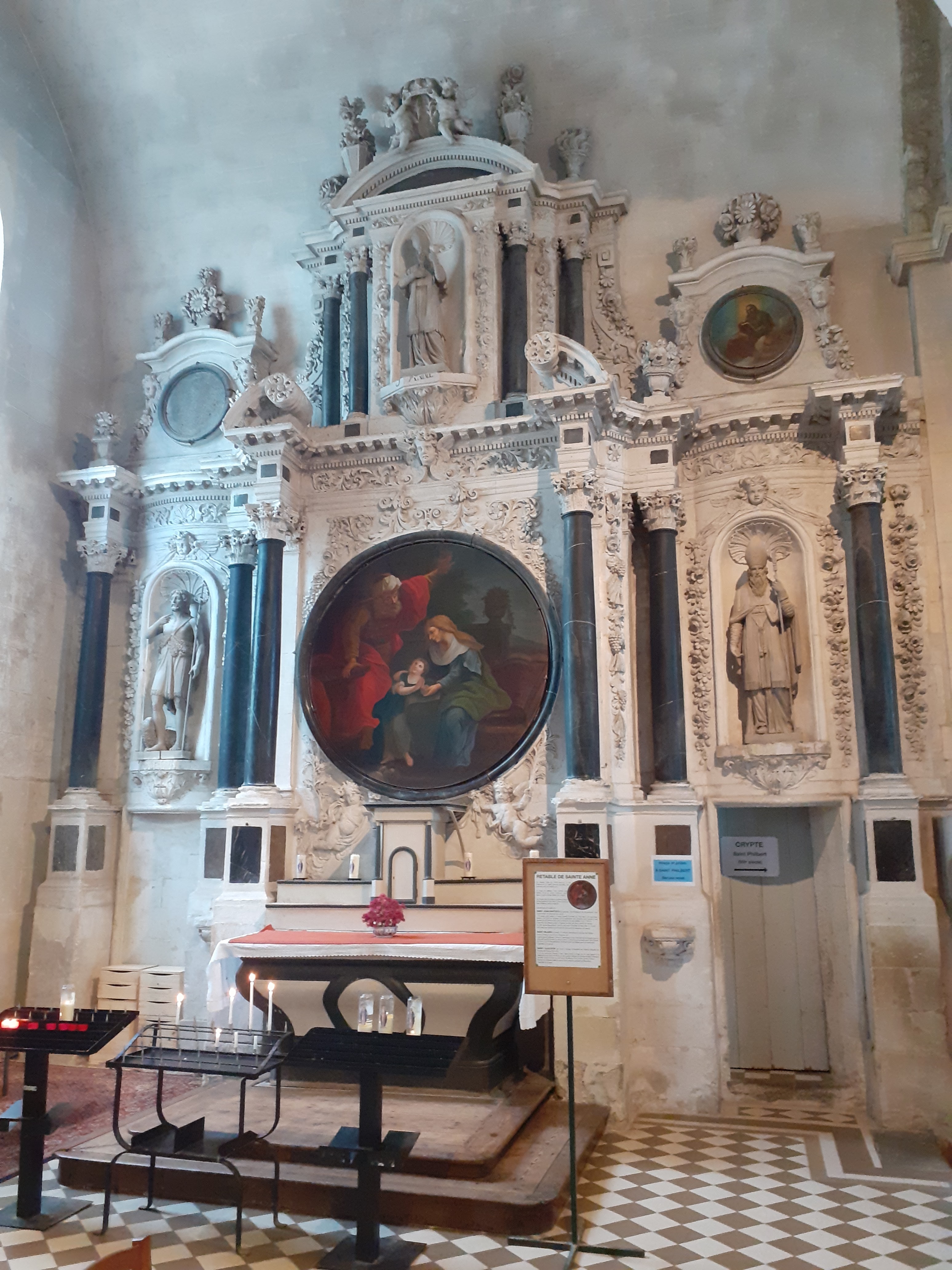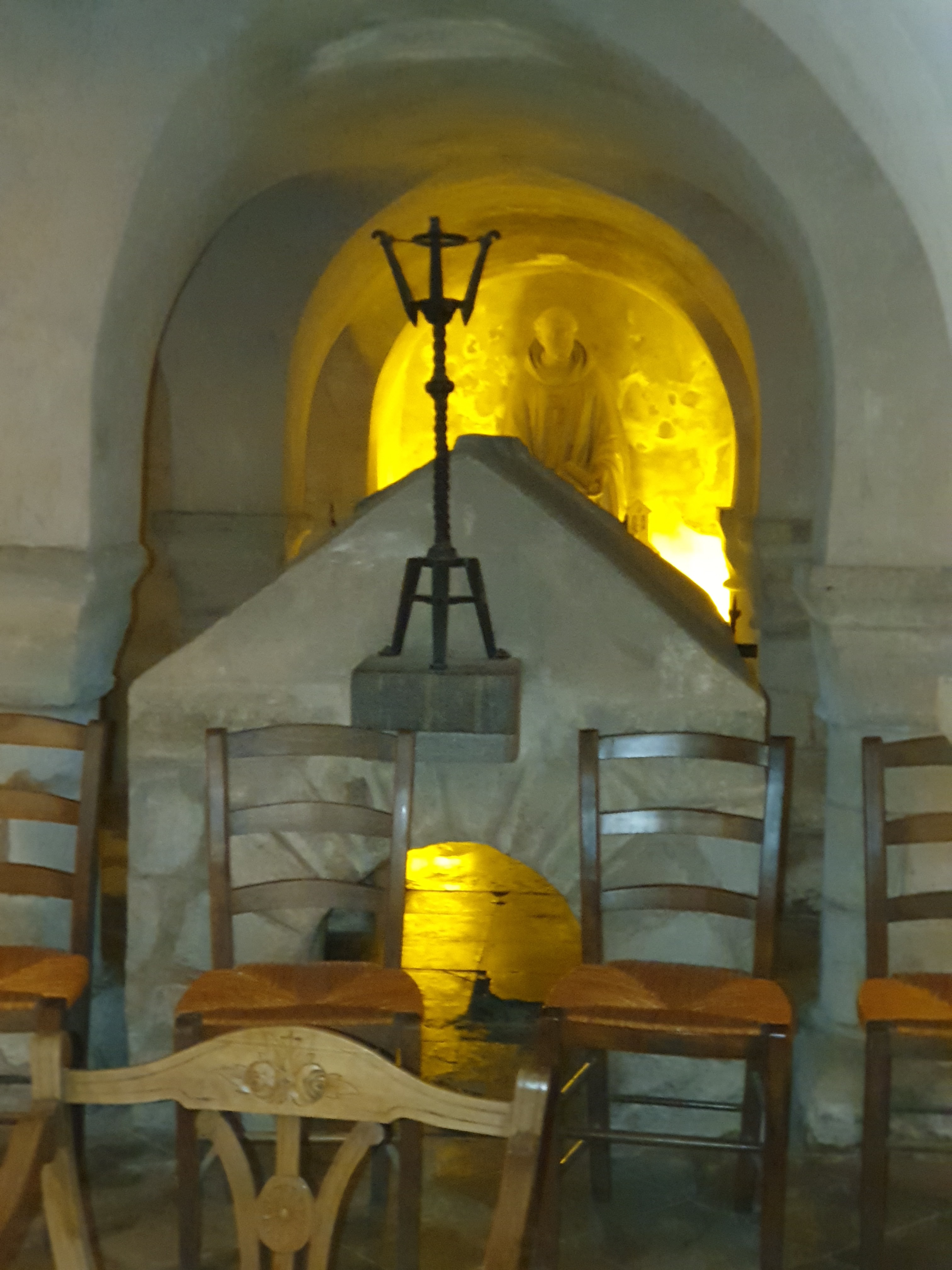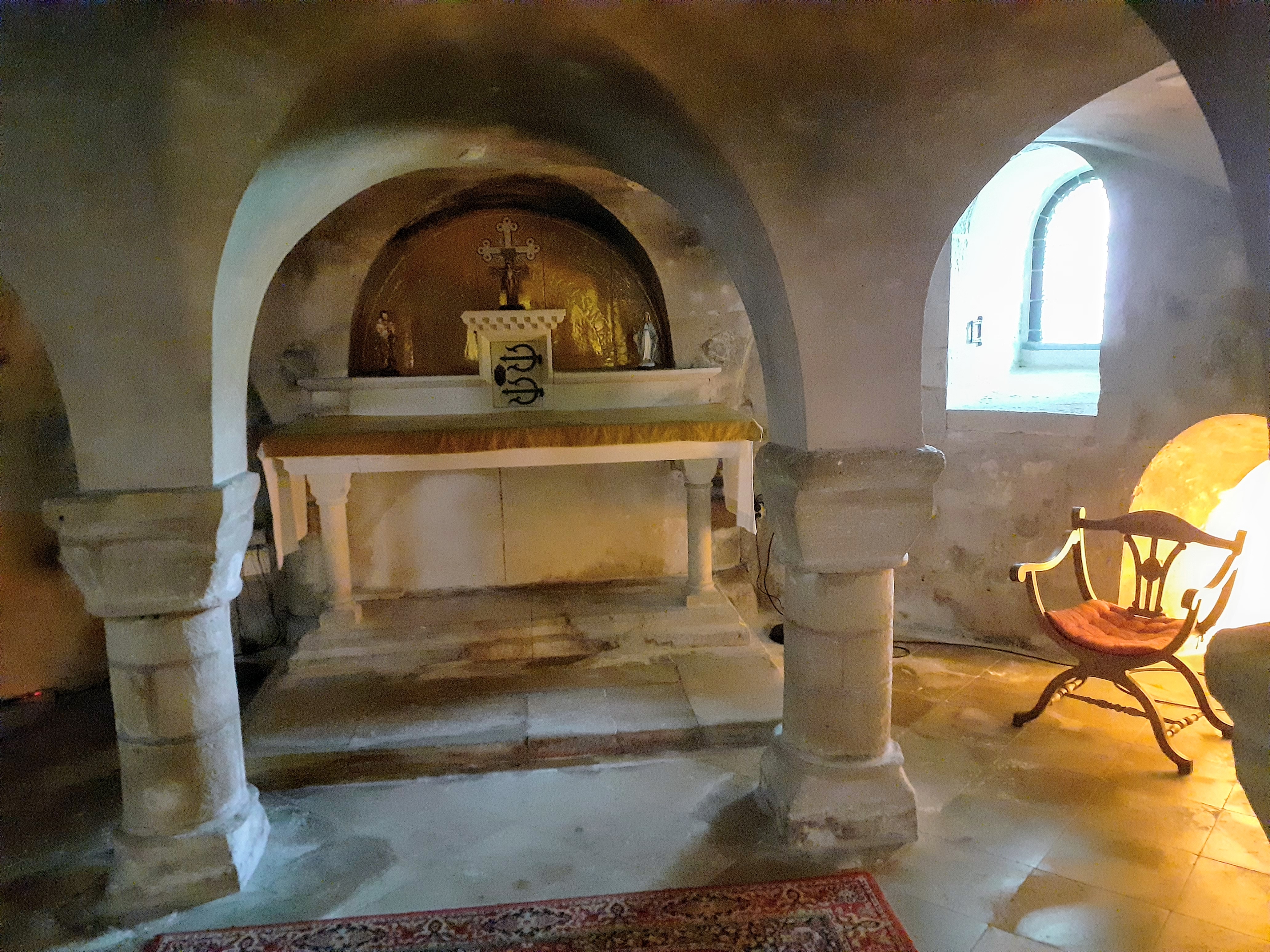 Jolie petite église avec une crypte à visiter au fond en dessous de l'autel