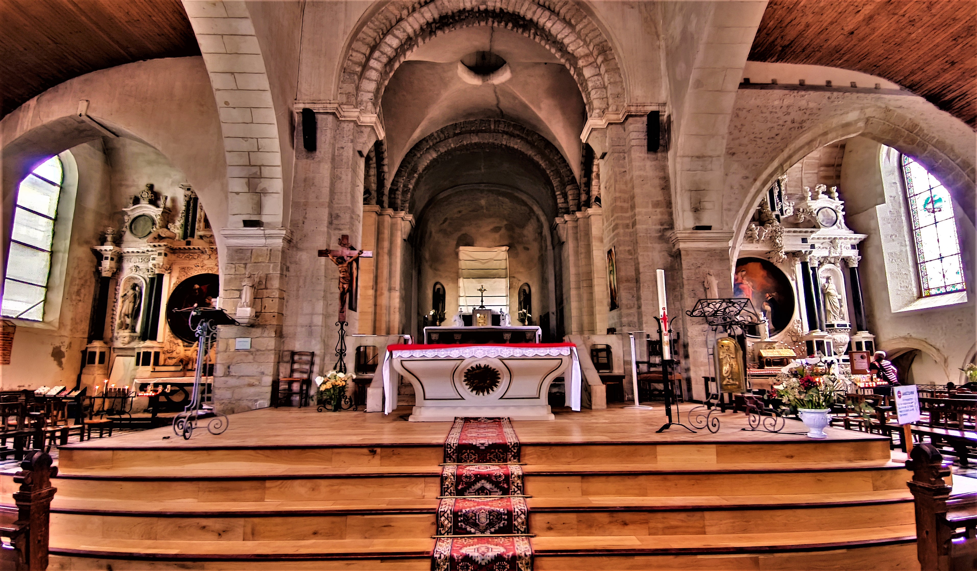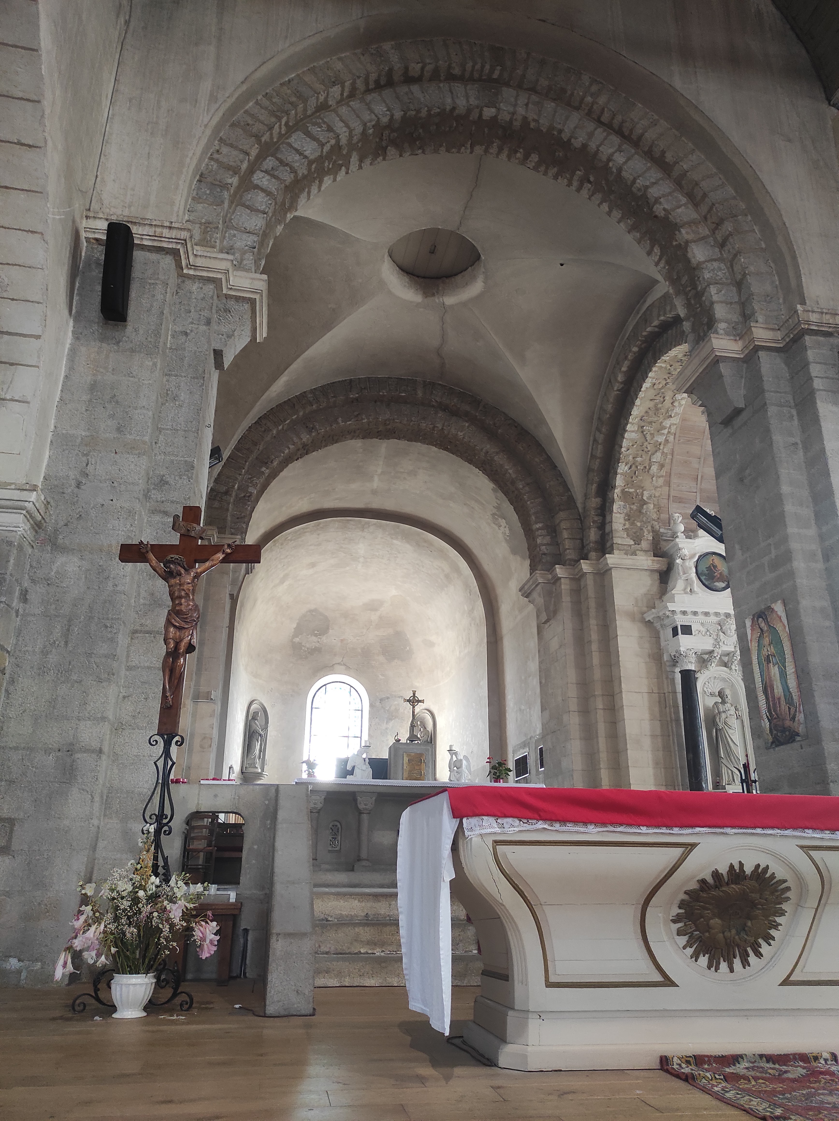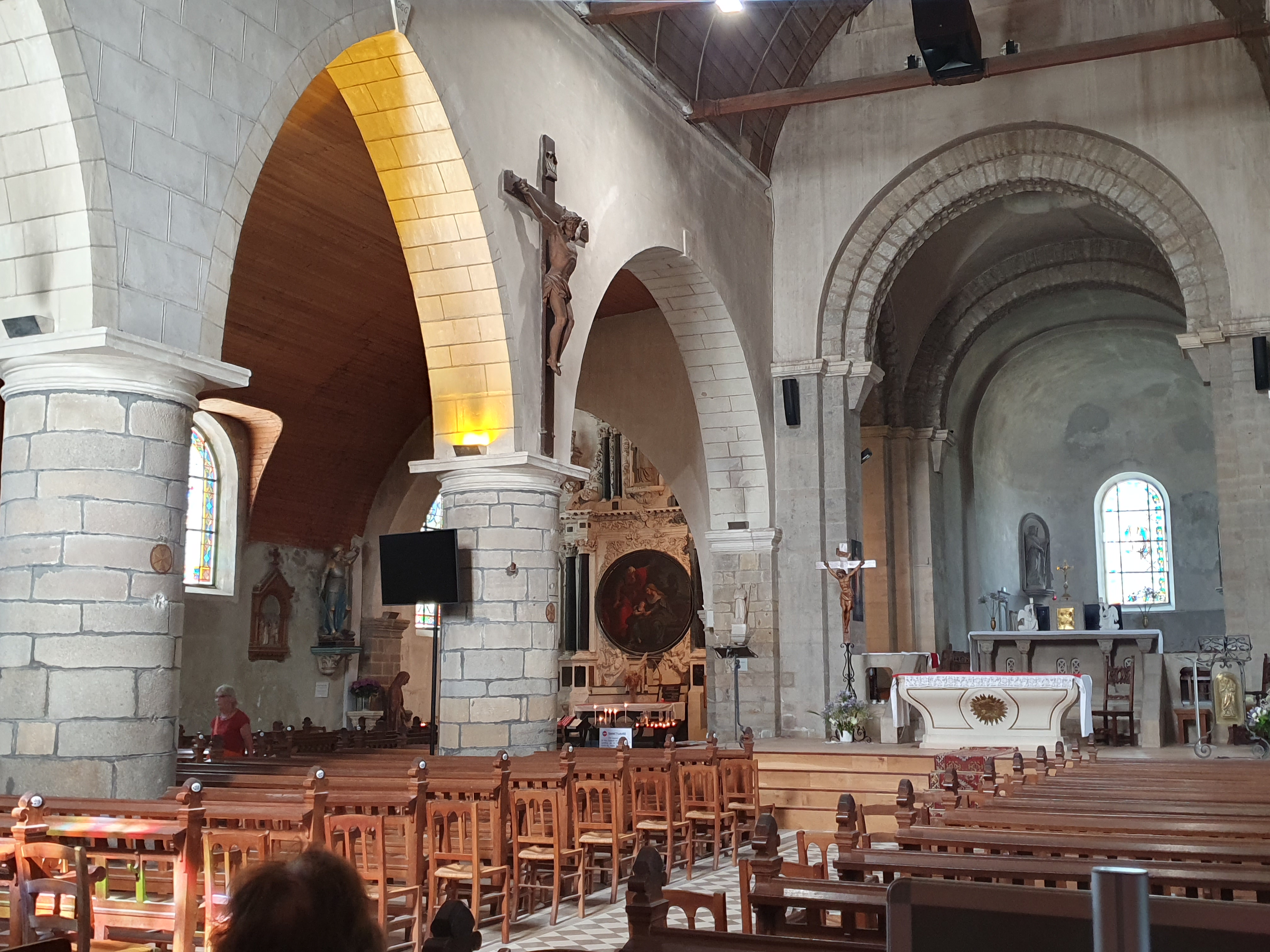 Une église chaleureuse, 2 superbes retables en pierre, une crypte mérovingienne, une visite émouvante. Sa façade Ouest annonce les 3 vaisseaux de la nef, le clocher est une belle élévation néo romane. Église du 11è qui a remplacé une église abbatiale du 7è, dévastée par les sarrasins au 8è et les viking au 9è, ce dernier événement provoqua son abandon par les moines. La crypte située sous le chœur est un vestige de l'abbatiale primitive. Le chœur et le transept romans datent du 11è, la nef a été agrandie au 14è du collatéral Sud et au 17è du collatéral Nord. Le clocher est une reconstruction du 19è, le clocher du 11è ayant été détruit par un incendie. Église ouverte et accueillante, les ouvertures sont en plein cintre, la nef axiale est plafonnée de lambris en berceau, les bas-côtés en demi-berceaux, ces espaces sont séparés par des arcs en plein cintre ou brisés. La croisée sous clocher est voûtée d'arêtes, les croisillons sont plafonnés en bois.