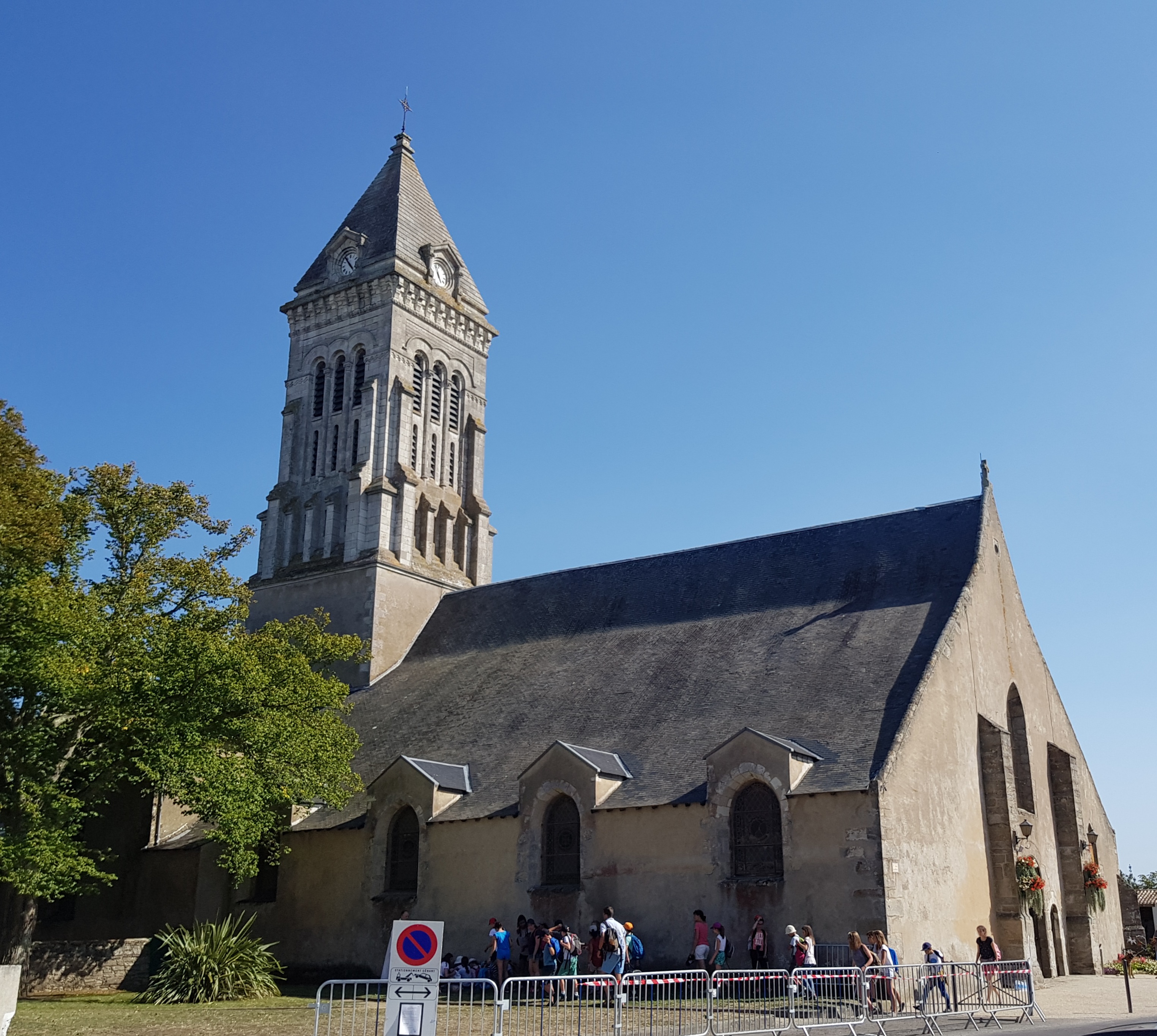 L’actuelle église paroissiale s’élève à l’emplacement de l’église de l’abbaye fondée par st Philibert vers 677. L’abbaye est pillée par les Sarrazins au VIIIe siècle, incendiée en 752, reconstruite en 804, saccagée plusieurs fois par les Vikings (ou Normands, “hommes du nord”) entre 825 et 834, abandonnée par les moines en 836. À la fin du XIe siècle, des moines bénédictins édifient un prieuré sur les ruines. Au début du siècle suivant, la chapelle primitive qui avait contenu le tombeau du saint est transformée en crypte et consolidée par de lourds piliers. Un cénotaphe fait mémoire du saint. Le choeur actuel date de cette époque ainsi que le plan de la nef principale. À la fin du XIVe siècle, l’église est agrandie (nef sud) pour pallier à la destruction par les Anglais de l’église voisine saint-Michel. Presque trois siècles après, en 1666, le curé de l’époque élargit encore l’espace en faisant construire la nef nord. Les trois nefs sont restaurées en 1674 suite à une incursion des Hollandais, donnant l’aspect actuel. Le clocher, néo-roman, inspiré de celui de Tournus où repose le corps de saint Philbert, est édifié en 1875 pour remplacer l’ancien clocher détruit par un incendie en 1843. À l’intérieur de l’église on peut admirer une maquette de frégate à 50 canons, réalisée en 1802 par un artisan horloger pour le lieutenant de vaisseau Auguste Jacobsen. La crypte, située sous le chœur, a accueilli le corps de Saint Philbert entre 690 et 836, date à laquelle il est transféré, d’abord à Déas (Saint-Philbert-de-Grand-Lieu), puis à Cunault et enfin à Tournus où les moines se réfugient en 875. Elle est classée Monument Historique depuis 1898. Une châsse qui contient quelques reliques du saint a été donnée par les moines de Tournus en 1863, lors de la restauration de la crypte.