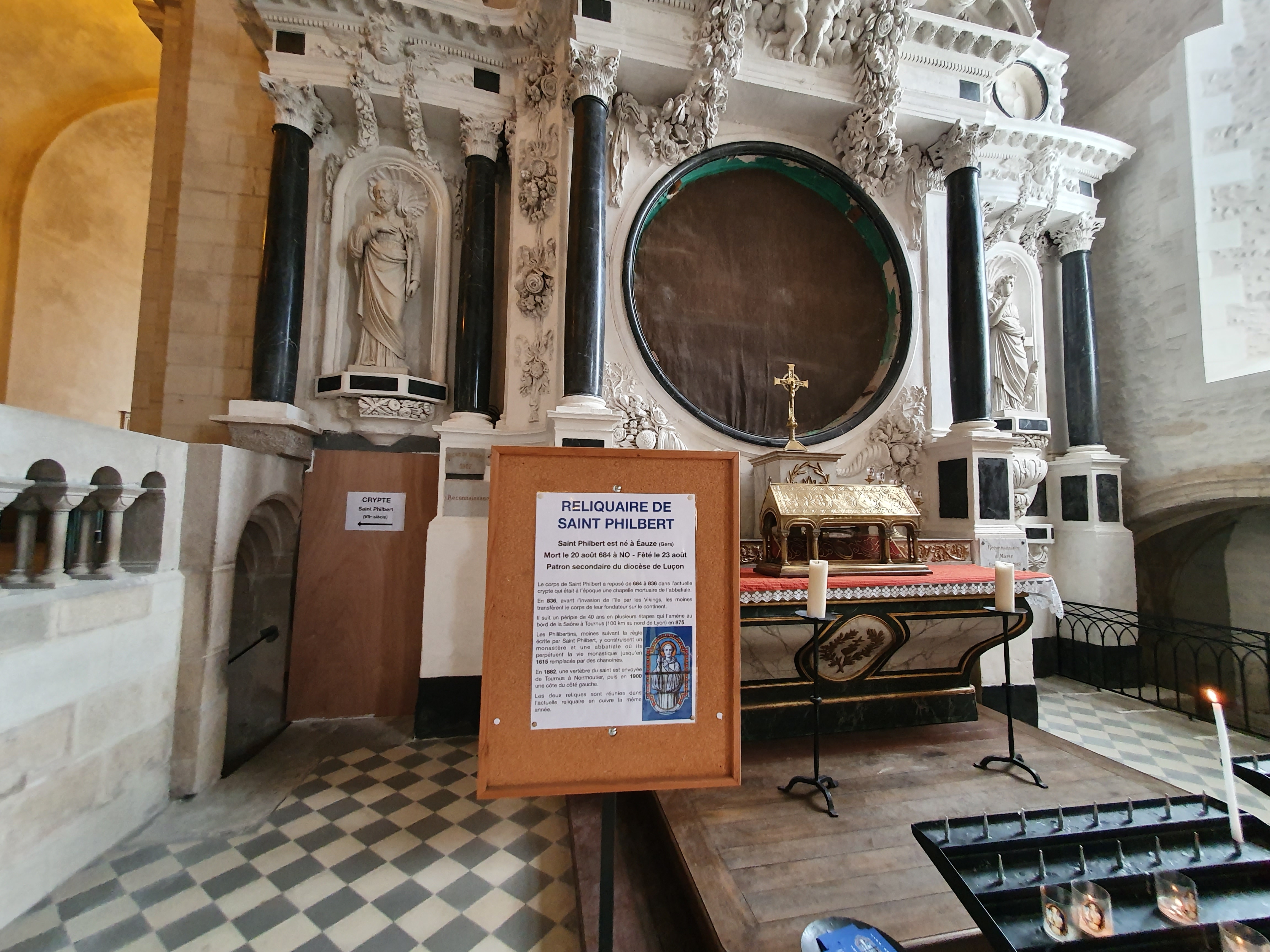 Église calme et lumineuse qui contient le reliquaire (vertèbre et côte du côté gauche) de Saint Philbert, moine, apôtre et bâtisseur qui transforma l'île de Noirmoutier au 7ème siècle et qui est mort à Noirmoutier en 684. Dans la crypte qui est aussi une chapelle se trouve le tombeau du saint.