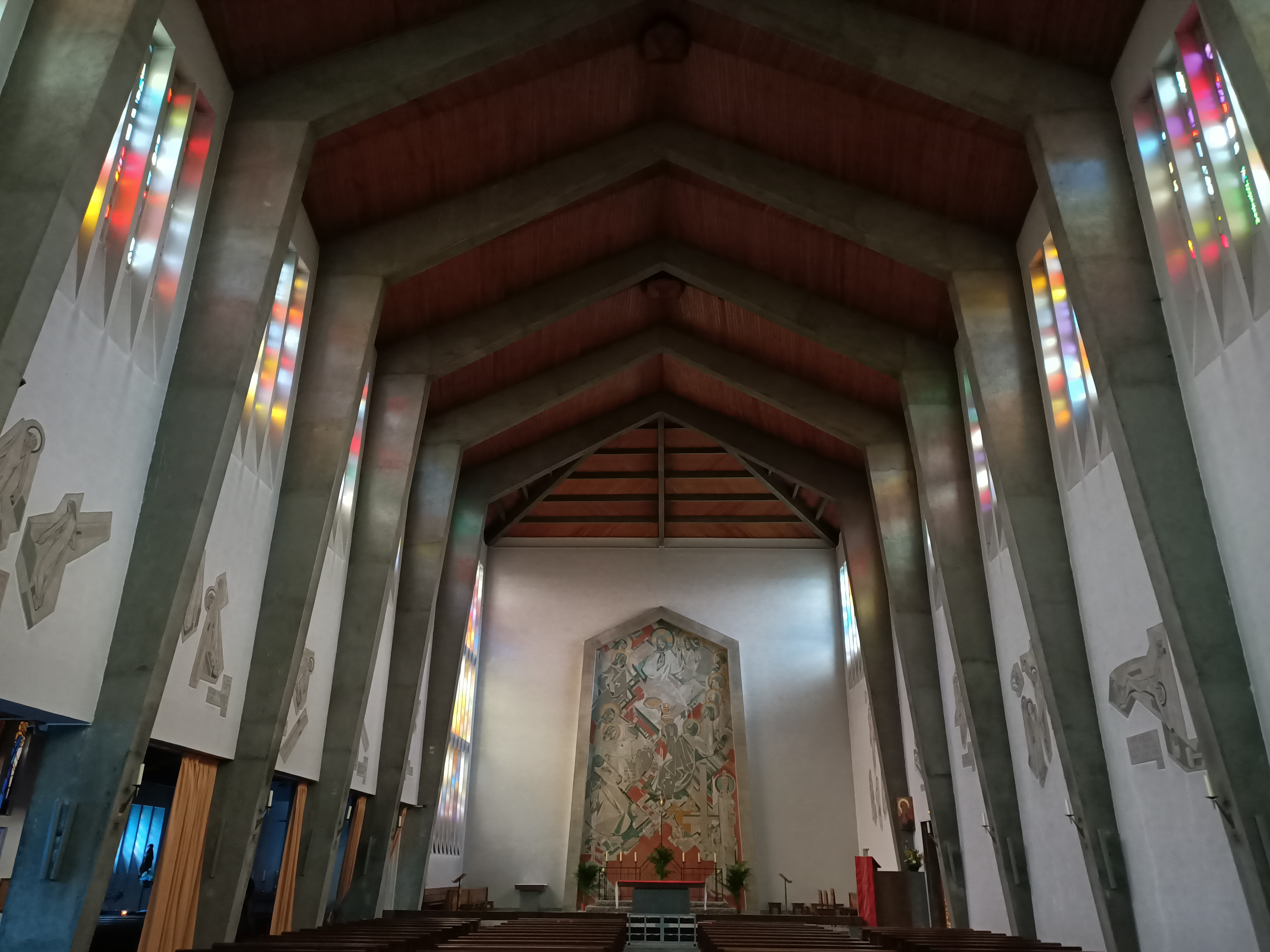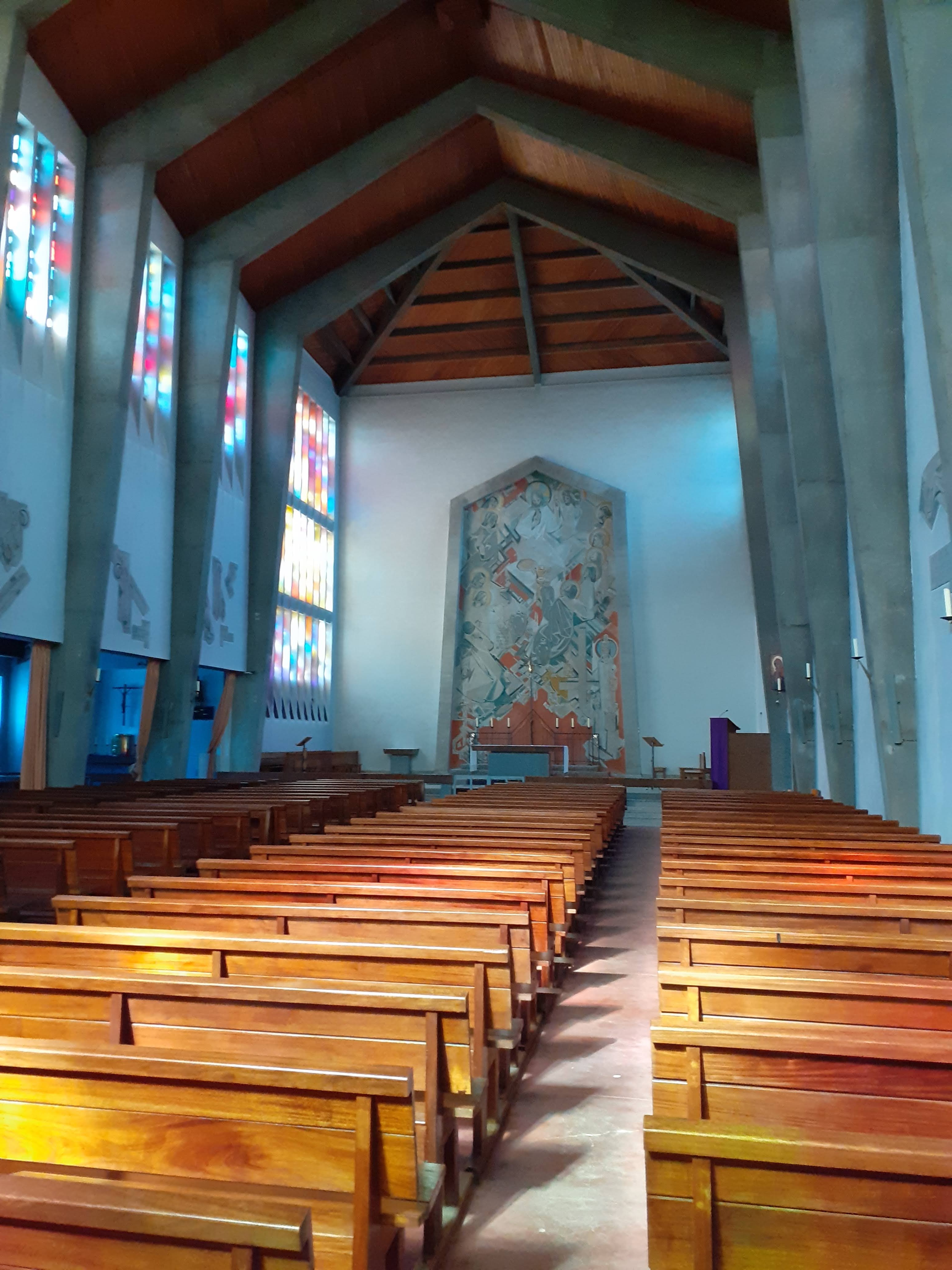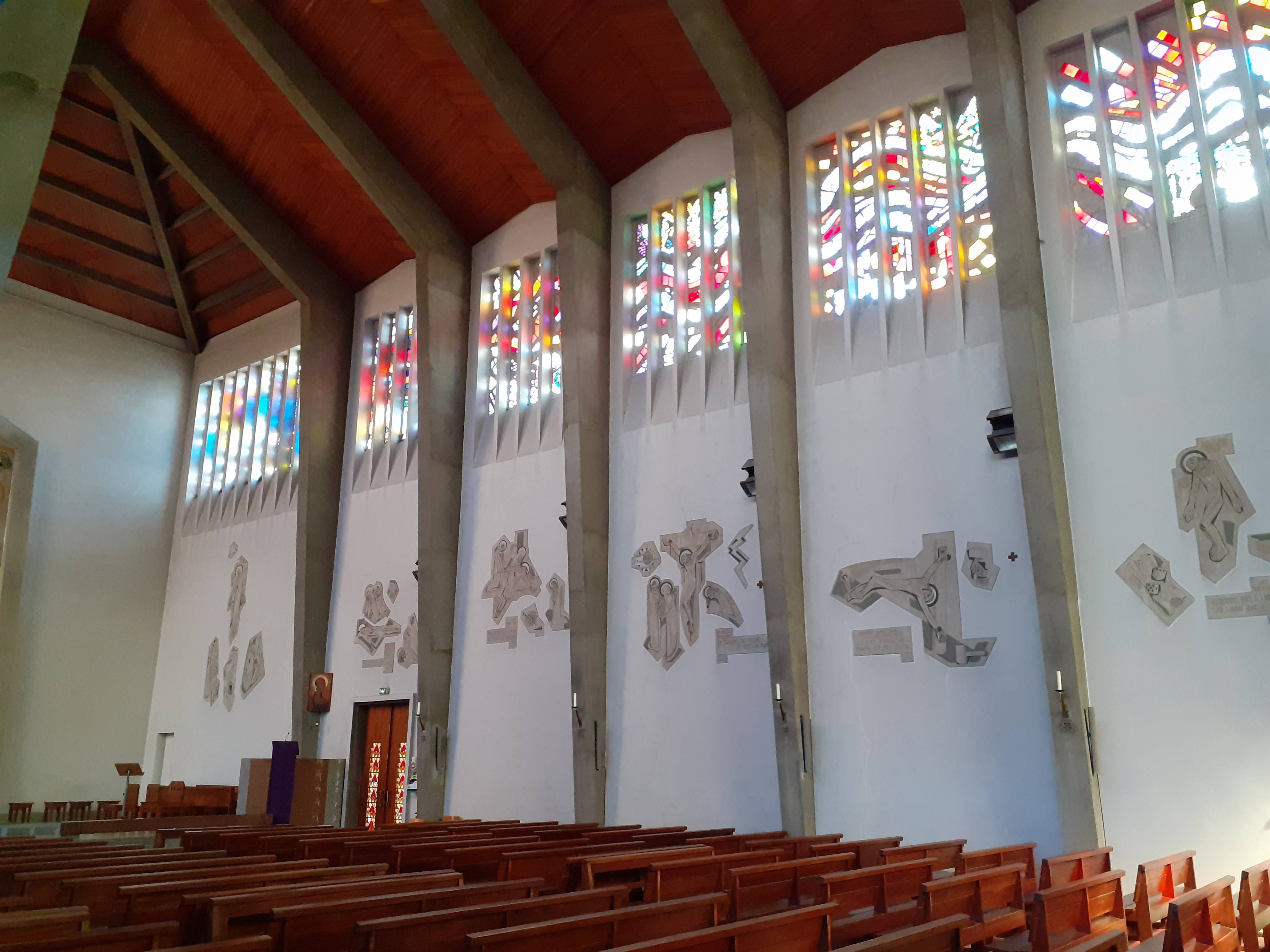 De conception moderne en extérieur comme en intérieur. De très beaux vitraux et un chemin de croix original.