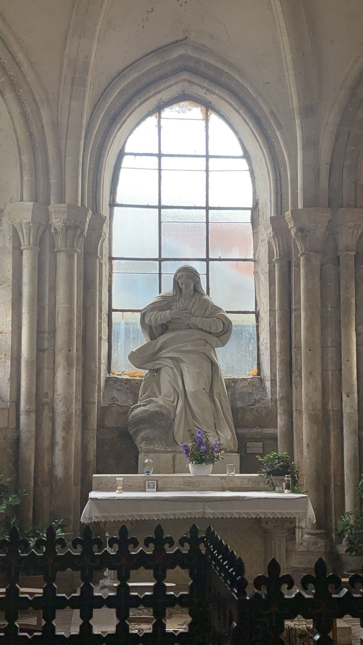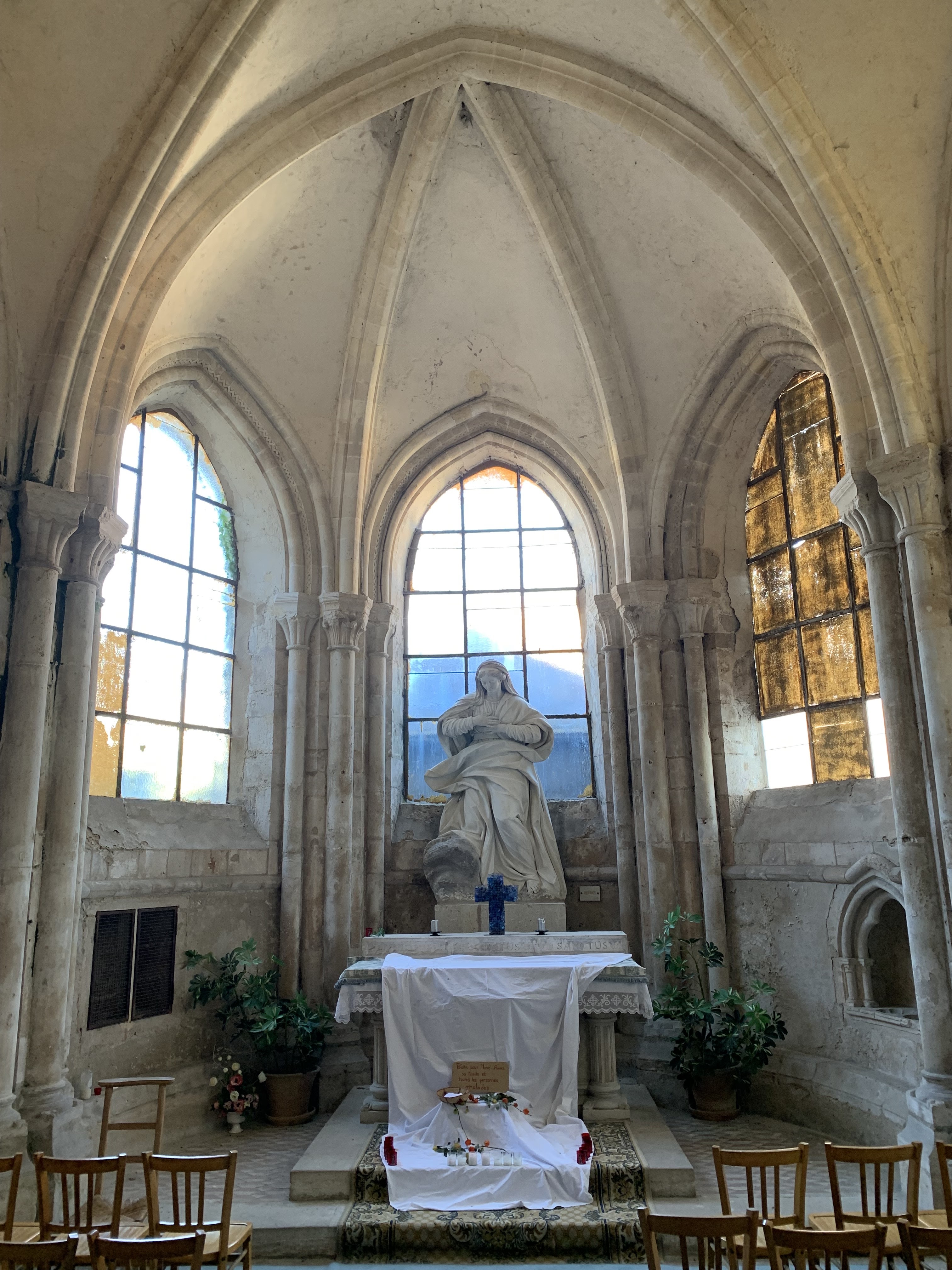 Après avoir passé plusieurs jours à la cathédrale de Chartres, j'ai eu l'honneur d'entrer dans cette cathédrale par la porte gothique rouge symbolisant le ventre de la Grande Mère. Dans cette solitude et ce délabrement, j'ai été transporté à des époques antérieures de l'histoire. Un respect pour l’histoire est descendu, non pas doré mais pur. Les sols pavés inclinés étaient plus faciles à entretenir lorsque les chevaux entraient dans l'environnement. Les couches de motifs peints et écaillés exposent l'art des âges. La statue en treillis de bois et en marbre blanc de l'abside, une version plus petite de la cathédrale de Chartres, était magnifique sous la lumière naturelle, même entrelacée de toiles d'araignées. La lumière naturelle intérieure était exquise à travers les vitraux. Il y a une Vierge noire assise près de l'entrée du transcept avec des lys frais posés à elle et à ses pieds. Une juxtaposion du monde physique à un temps vieilli capturé et suspendu.