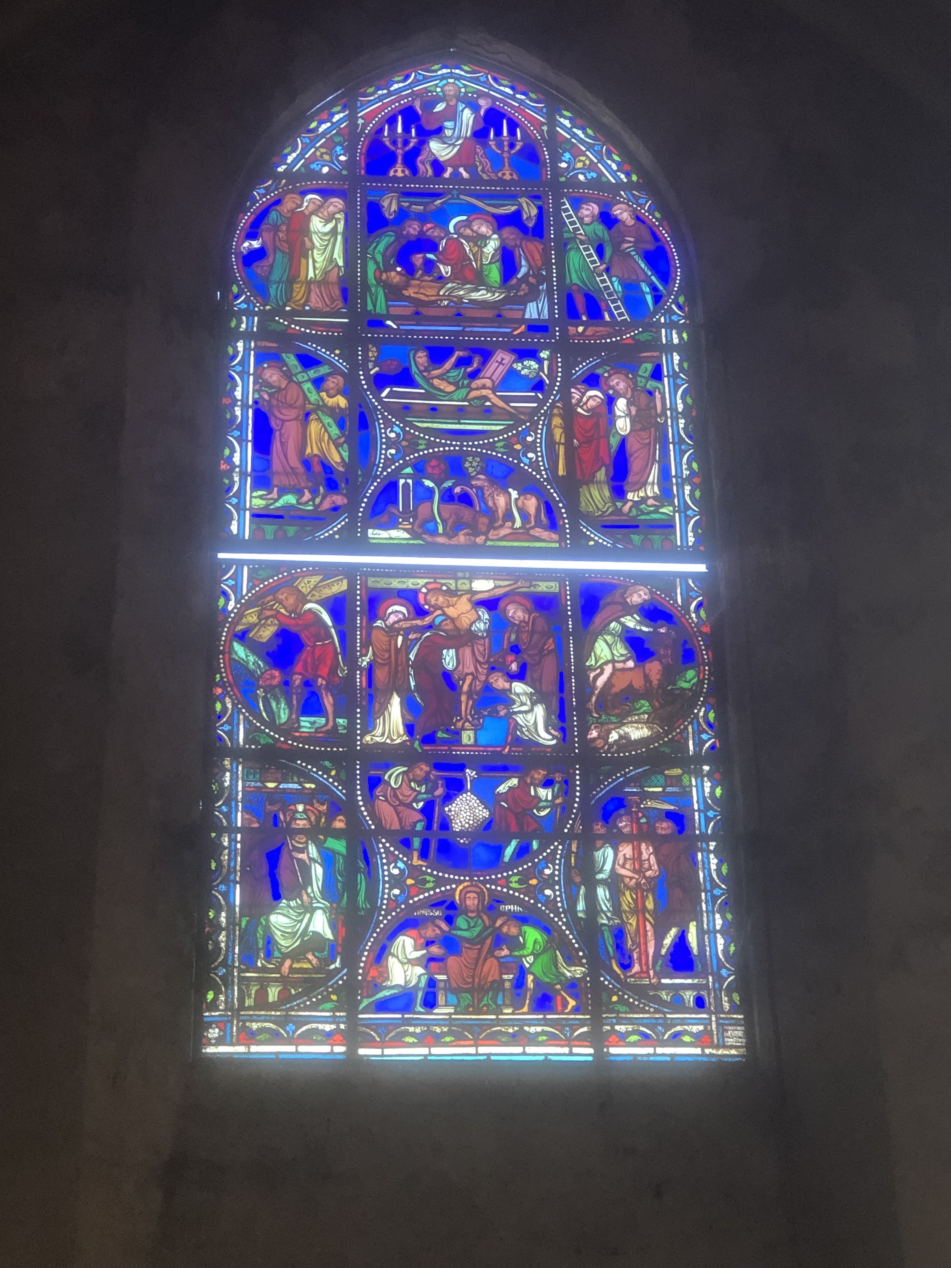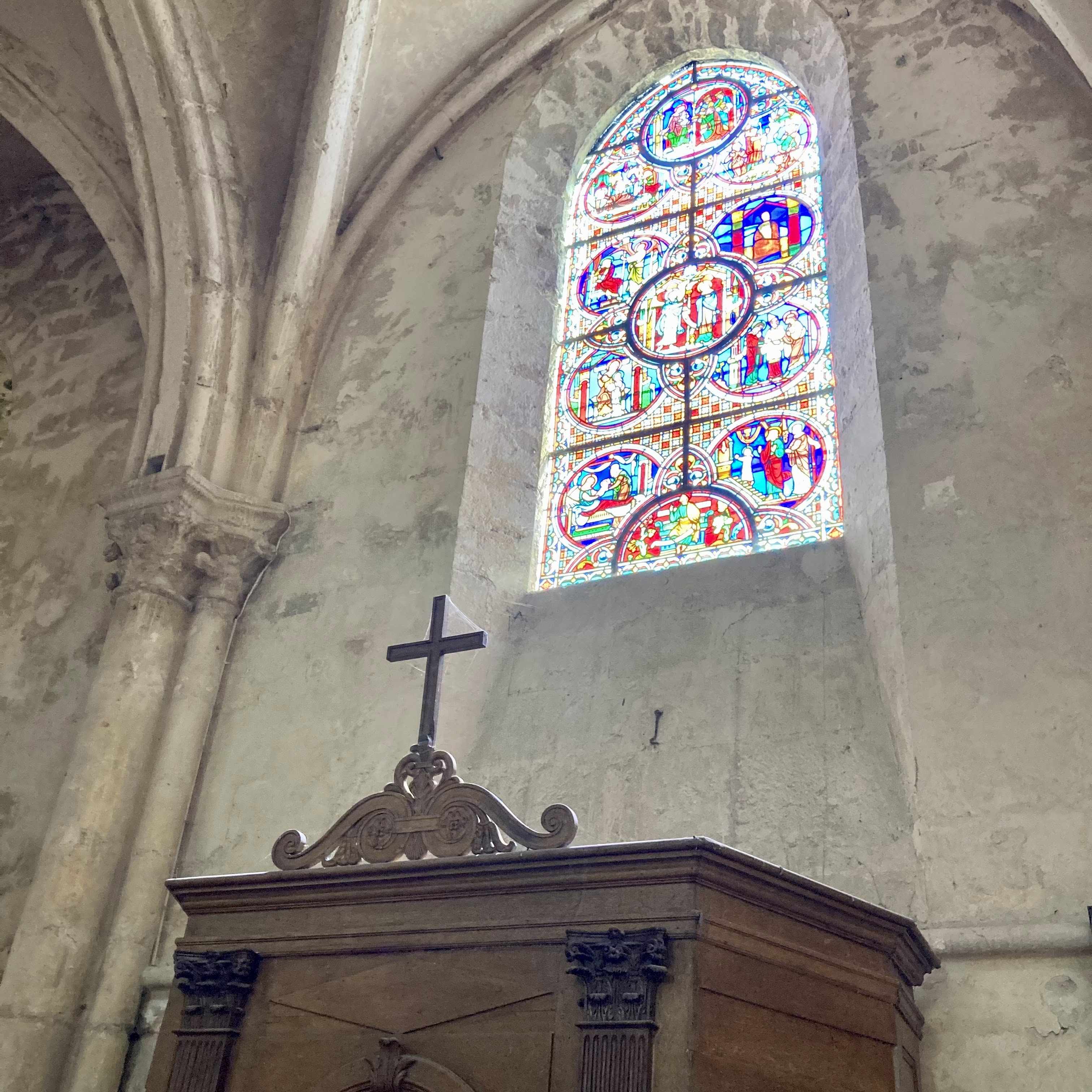 Beau vitraux mais le filet avec des crottes au dessus de l'autel pas très joli