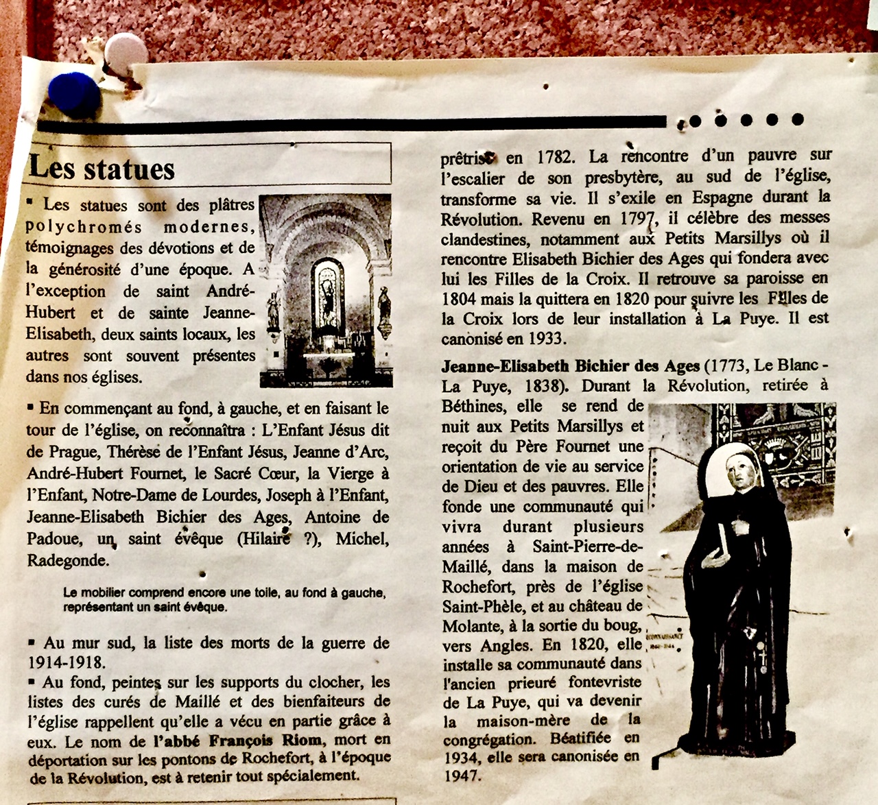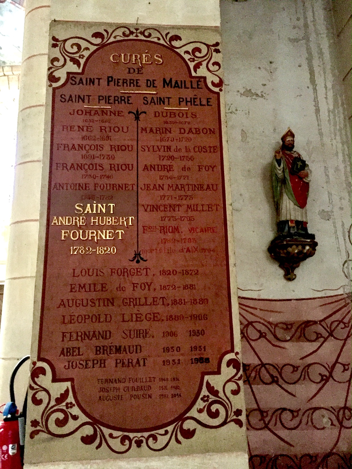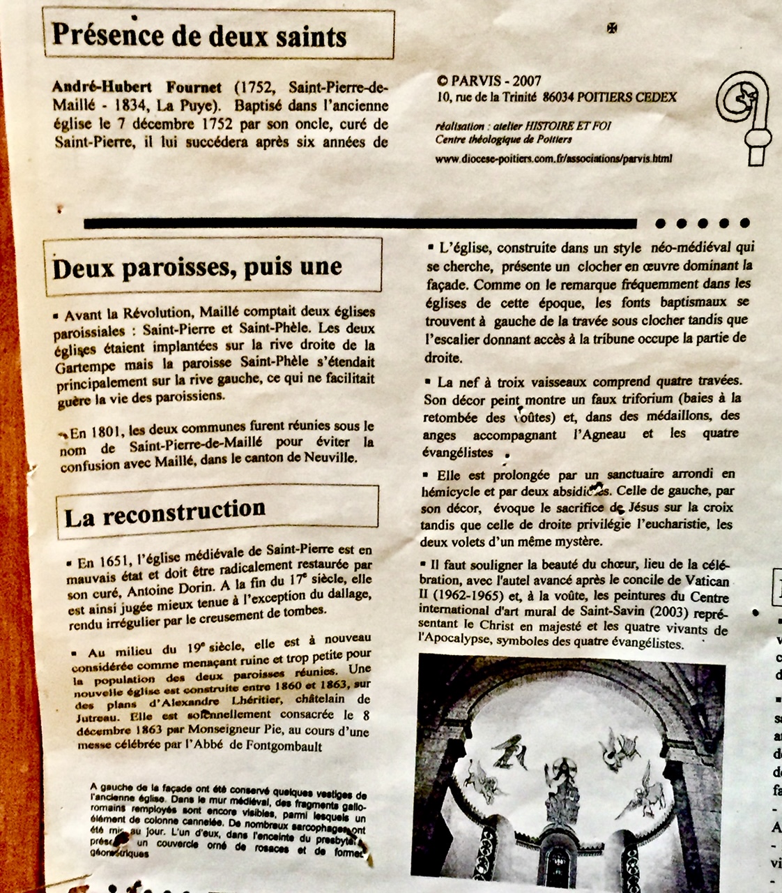 L’Eglise Saint-Pierre à Saint-Pierre de Maillé fut reconstruite plusieurs fois, au 17ème puis au 19ème mais garde les traces de son riche passé. Un jour, à l'heure du repas, la table étant mise, un mendiant vint à la cure pour demander un peu d'argent. Le père André-Hubert Fournet lui offrit du pain, suggérant qu'il n'avait pas d'argent. Le mendiant lui répondit : Comment ? Vous n'avez pas d'argent et votre table en est couverte ! La conscience du Père en fut retournée, et dès lors, il axa sa vie sur la prière, le souci des pauvres et des malades. Il fonda avec Jeanne-Élisabeth Bichier des Ages la Congrégation des Filles de la C