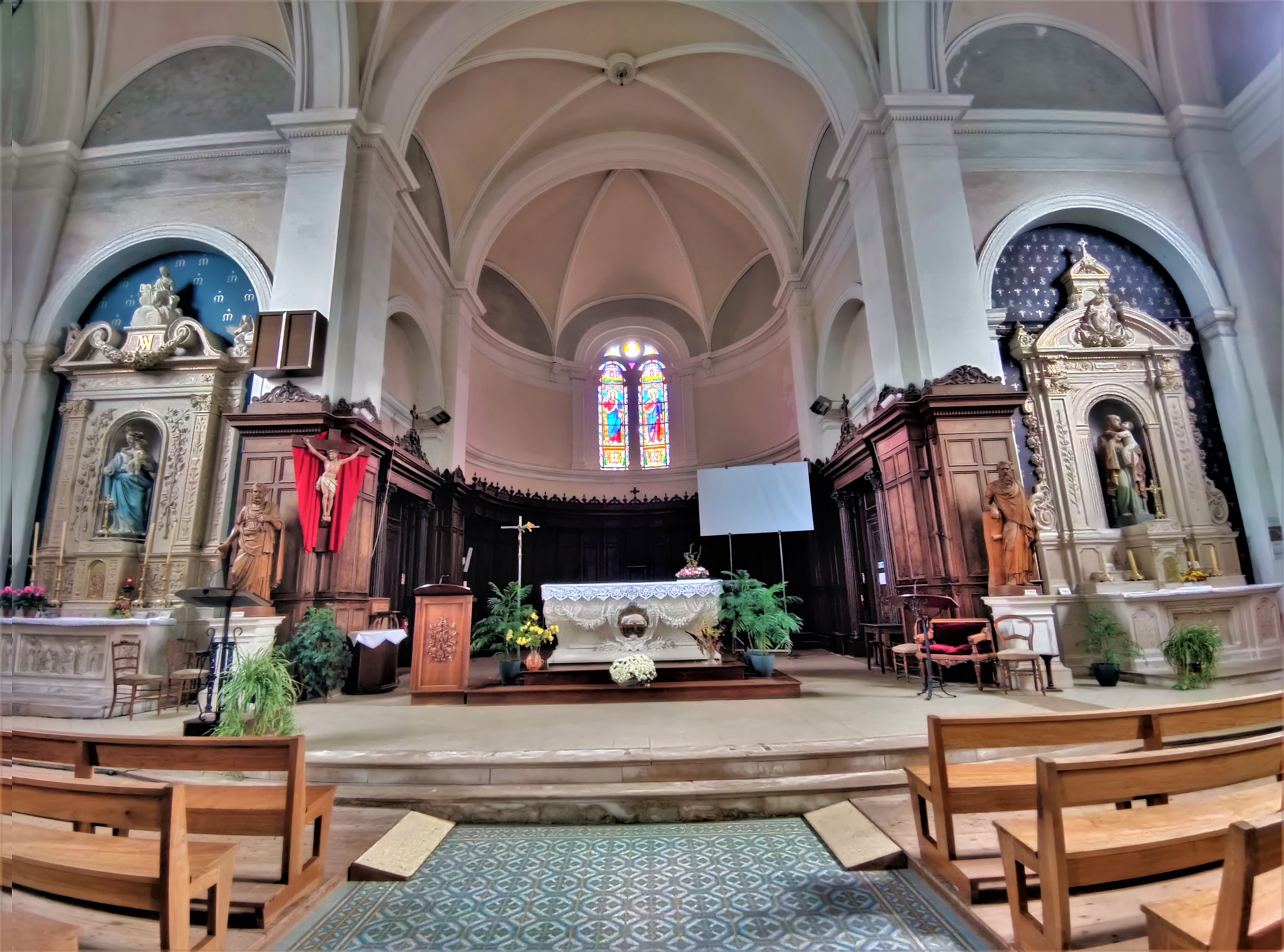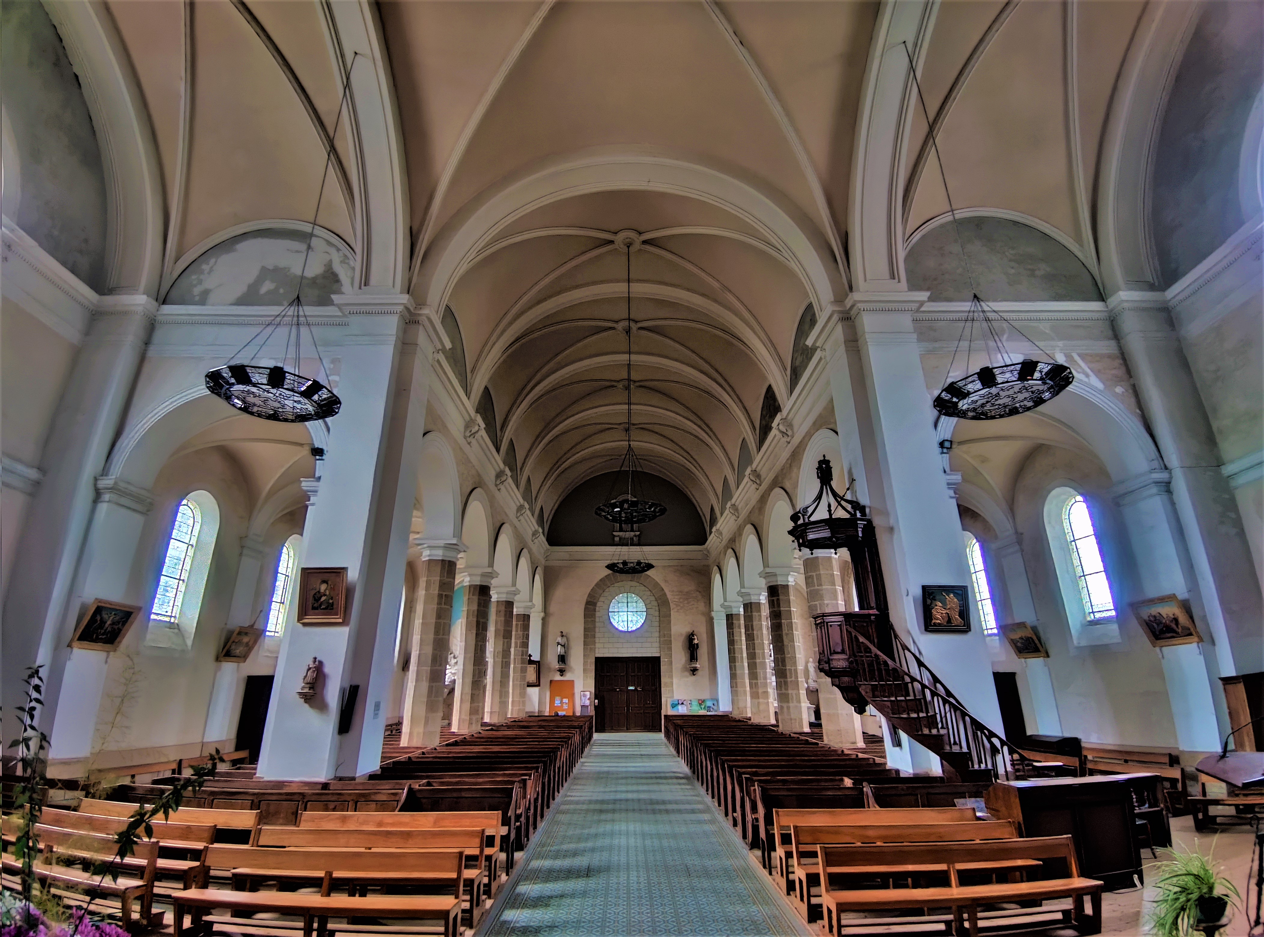 Une église du 19è ouverte et accueillante, un lieu de célébration reposant à visiter. L'église primitive, logée dans l'enceinte du château, reconstruite début 18è, fut brûlée en même temps que le château en 1794. Elle fut plus ou moins réparée, mais était devenue trop petite au 19è pour le nombre croissant de paroissiens. L'église actuelle fut alors construite, quelques originalités donnent un certain charme à cet édifice lumineux abritant quatre autels secondaires. Une église du 19è ouverte et accueillante, un lieu de célébration reposant, à visiter.