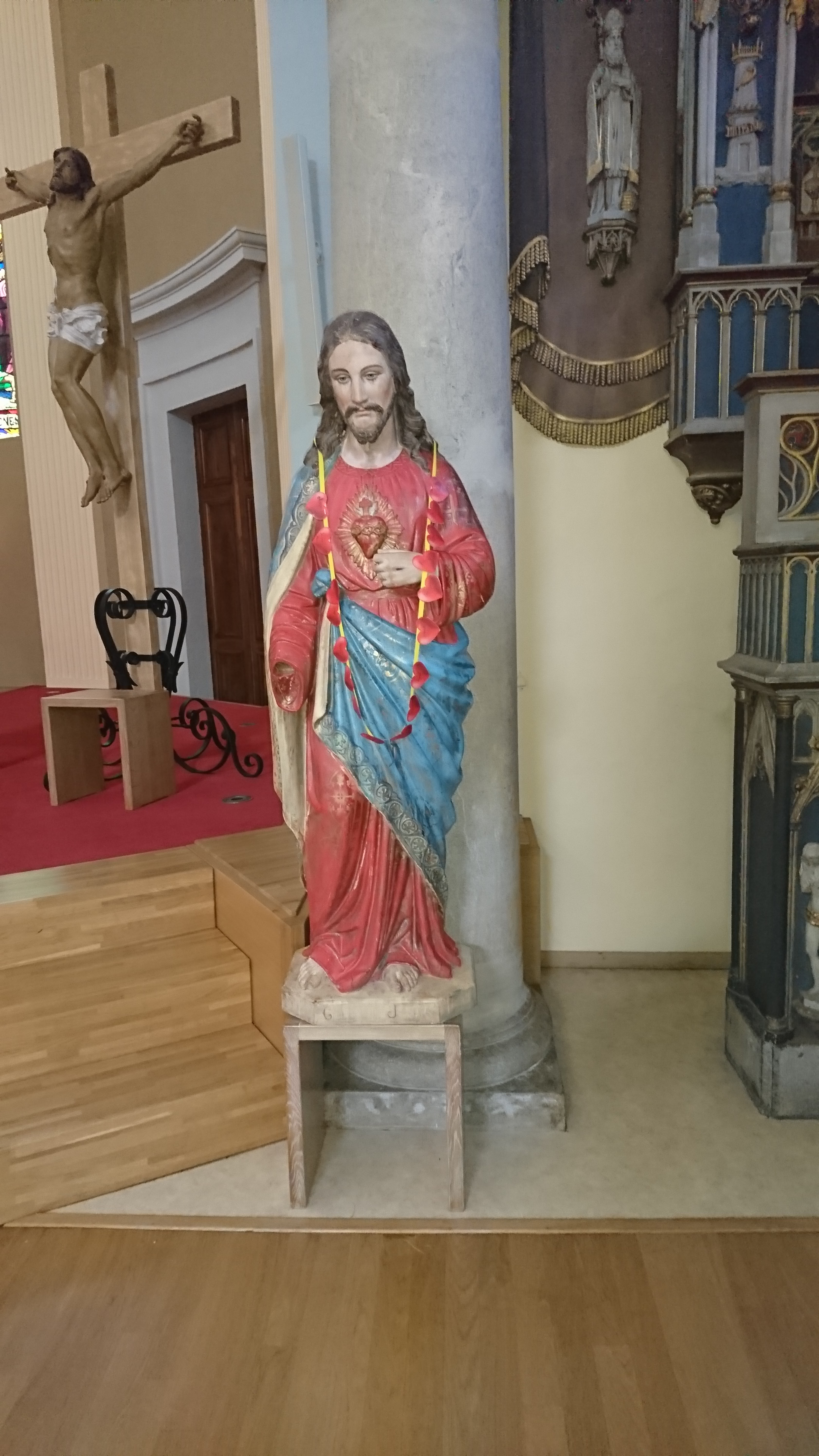 Petite église, bien entretenue. Elle a dû être rénovée récemment. Original, un chemin de croix peint. Plusieurs statues, autels...