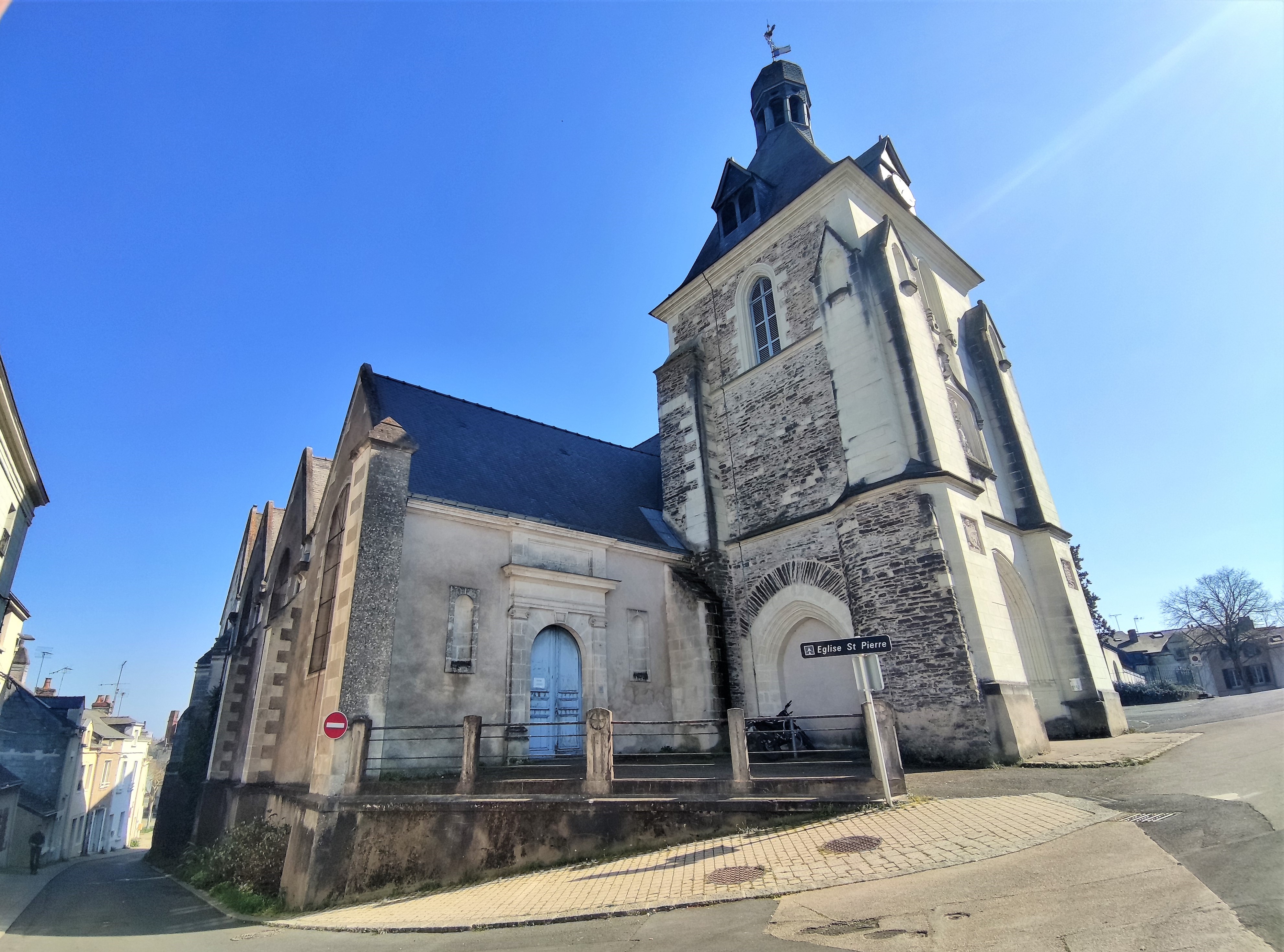 Les vitraux de Raphaël Lardeur (1890-1967) installés en 1946 justifient à eux-seuls un détour. En plus des vitraux, une vingtaine d'objets classés sont à découvrir dans cet édifice étonnant, inscrit depuis 1926 par les M.H. En contrebas de l'église, la fontaine de la barrière Saint Pierre témoigne de l'histoire de cet ancien quartier. Côté Ouest, la chronologie des périodes de construction du donjon-clocher-porche-narthex, en proéminence de la façade, décrit à elle-seule l'histoire de cet édifice aux origines gallo-romaines et modifié jusqu'aux périodes contemporaines. Cette tour, par laquelle on entre, repose sur une assise du 5ème siècle. L'élévation se poursuit avec une construction du 15ème siècle, puis la partie haute serait du 19ème siècle, un lanternon culmine et agrémente la sommité. Église gothique, les voûtes de la nef, des collatéraux et du chœur sont en berceau brisé composés de lambris. Les chapelles au Nord et au Sud du chœur, faisant croisillons, sont voûtées de pierres en croisées d'ogives. La chapelle Notre-Dame de la Délivrance, située à côté, mérite aussi une visite.