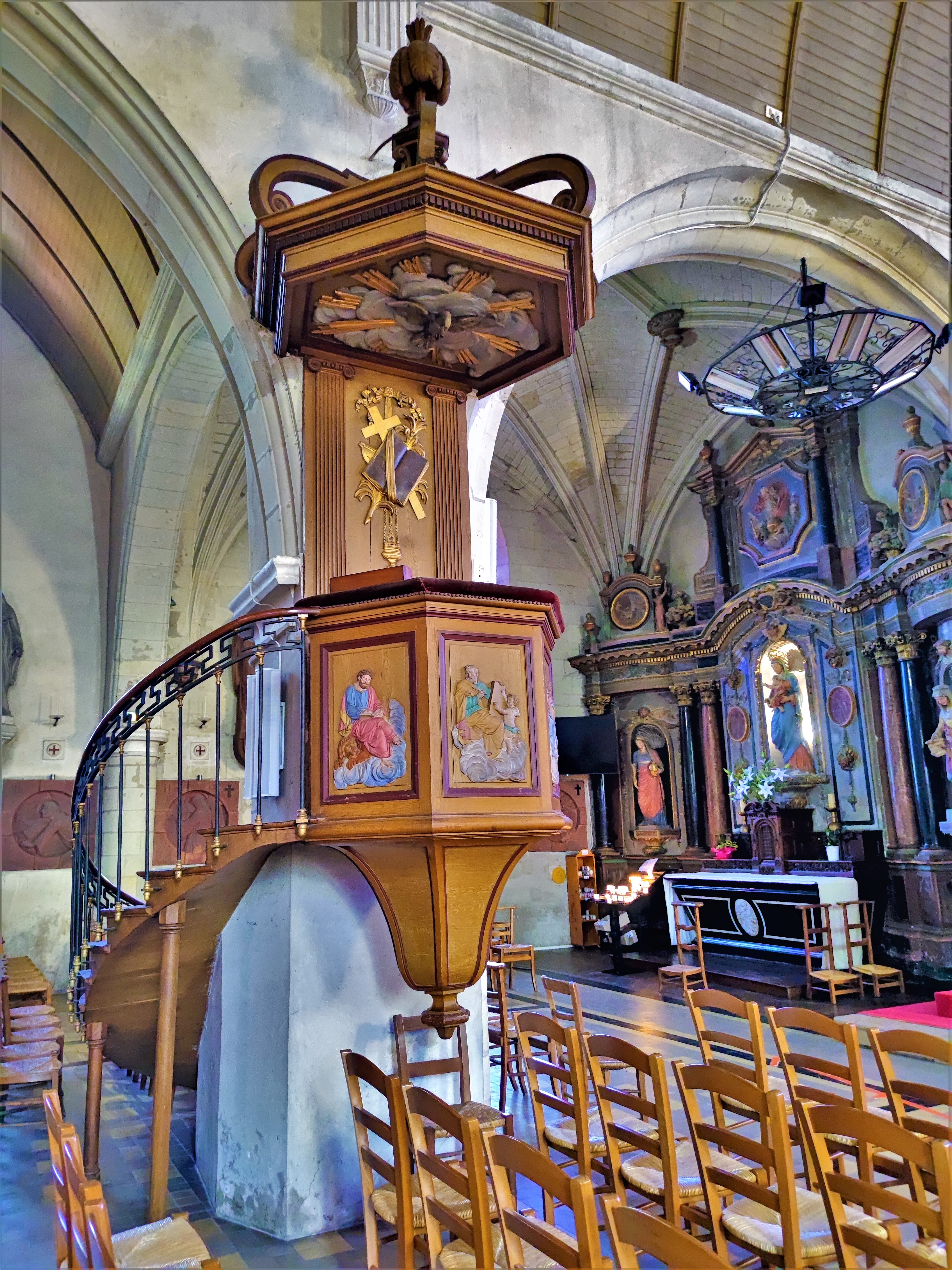 À voir ...!! L'église est de style gothique. Les vitraux sont de Raphaël Lardeur et datent de 1946. La tour clocher constitue l'entrée principale, la base est gallo-romaine et supporte un narthex avec contreforts du XVe siècle. Le donjon horloge est daté du XIXe siècle. La nef et l'abside datent respectivement des XVIe et XVIIe siècles. La nef est constituée de murs découpés en arcs romans sur piliers massifs, le transept est la seule partie voutée de pierres avec clés pendantes de style Plantagenet (fin XVe siècle). Le monument est inscrit au titre des monuments historiques en 1926 ☺
