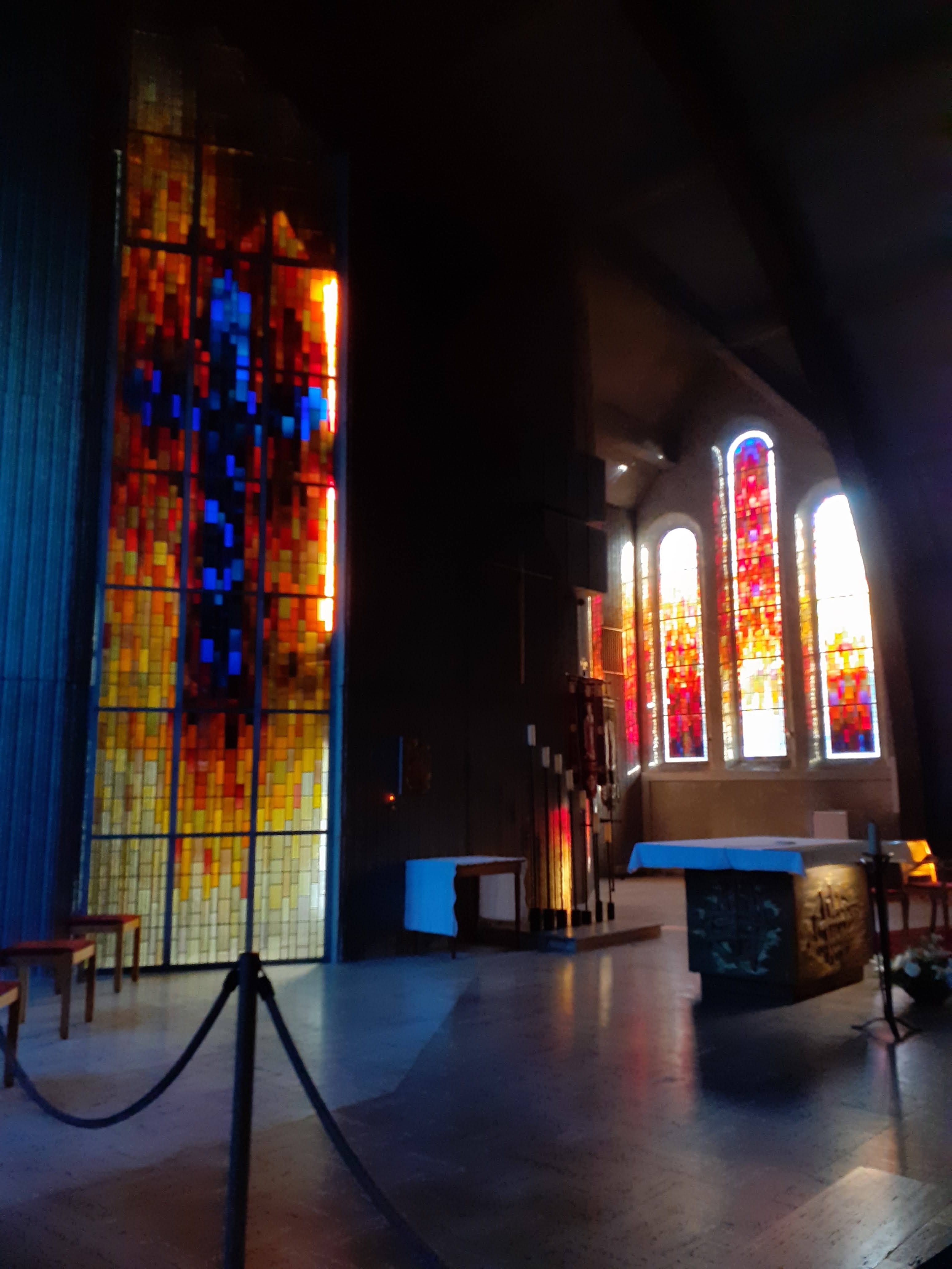 D'extérieur l'église est très jolie et s'accorde parfaitement avec le reste. Mais à l'intérieur je l'ai trouvé vraiment moche. C'est beaucoup trop moderne, des hauts parleurs de partout, des lampes peu élégantes, des vitraux inexistants, pleins de chaises en plastique. Pas ouf du tout quoi.