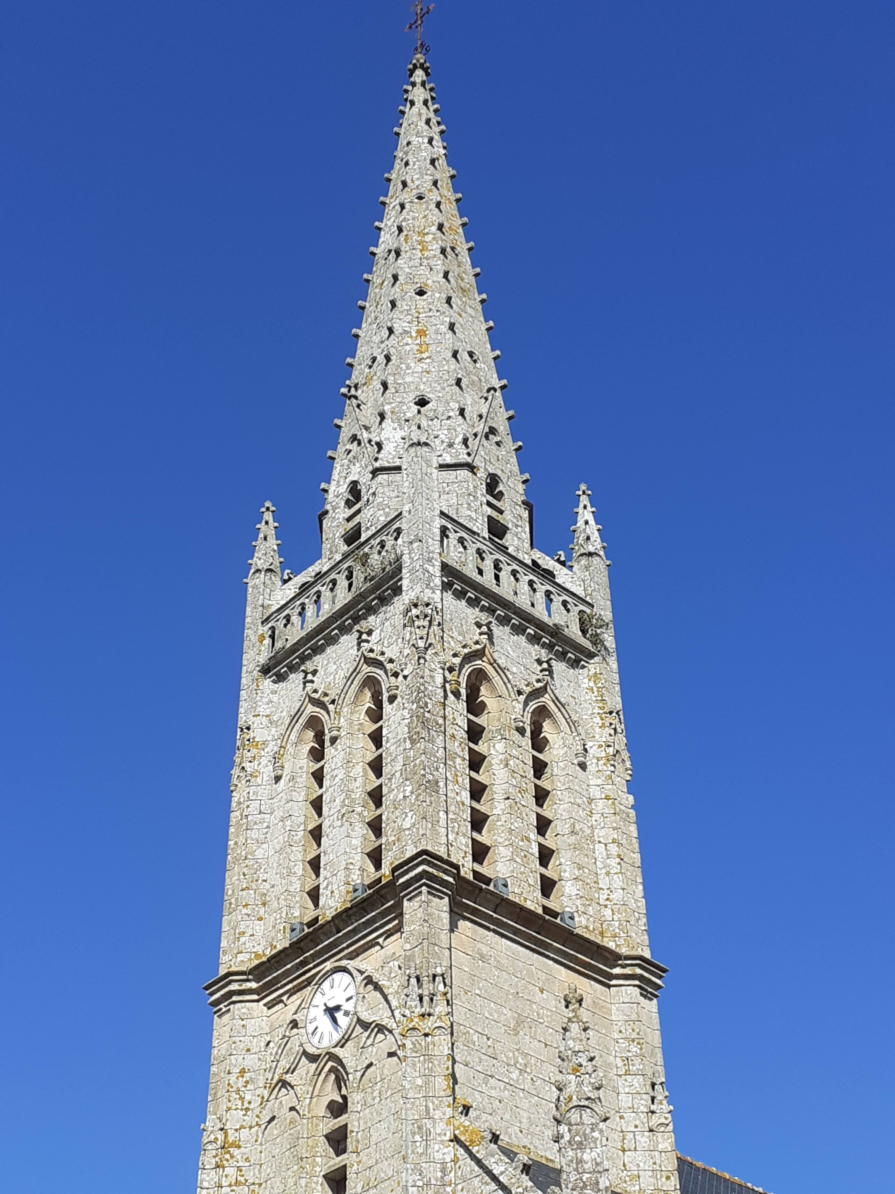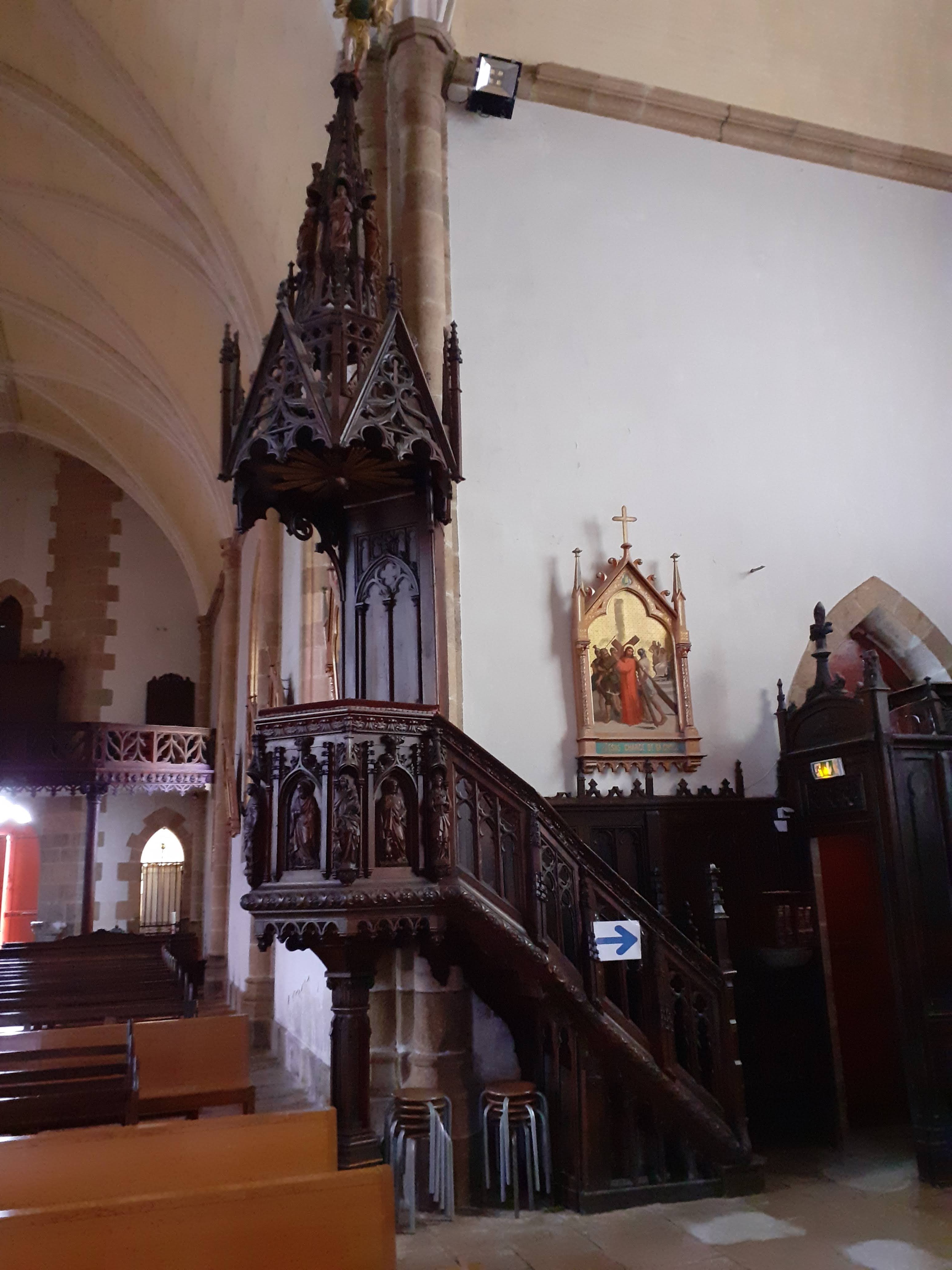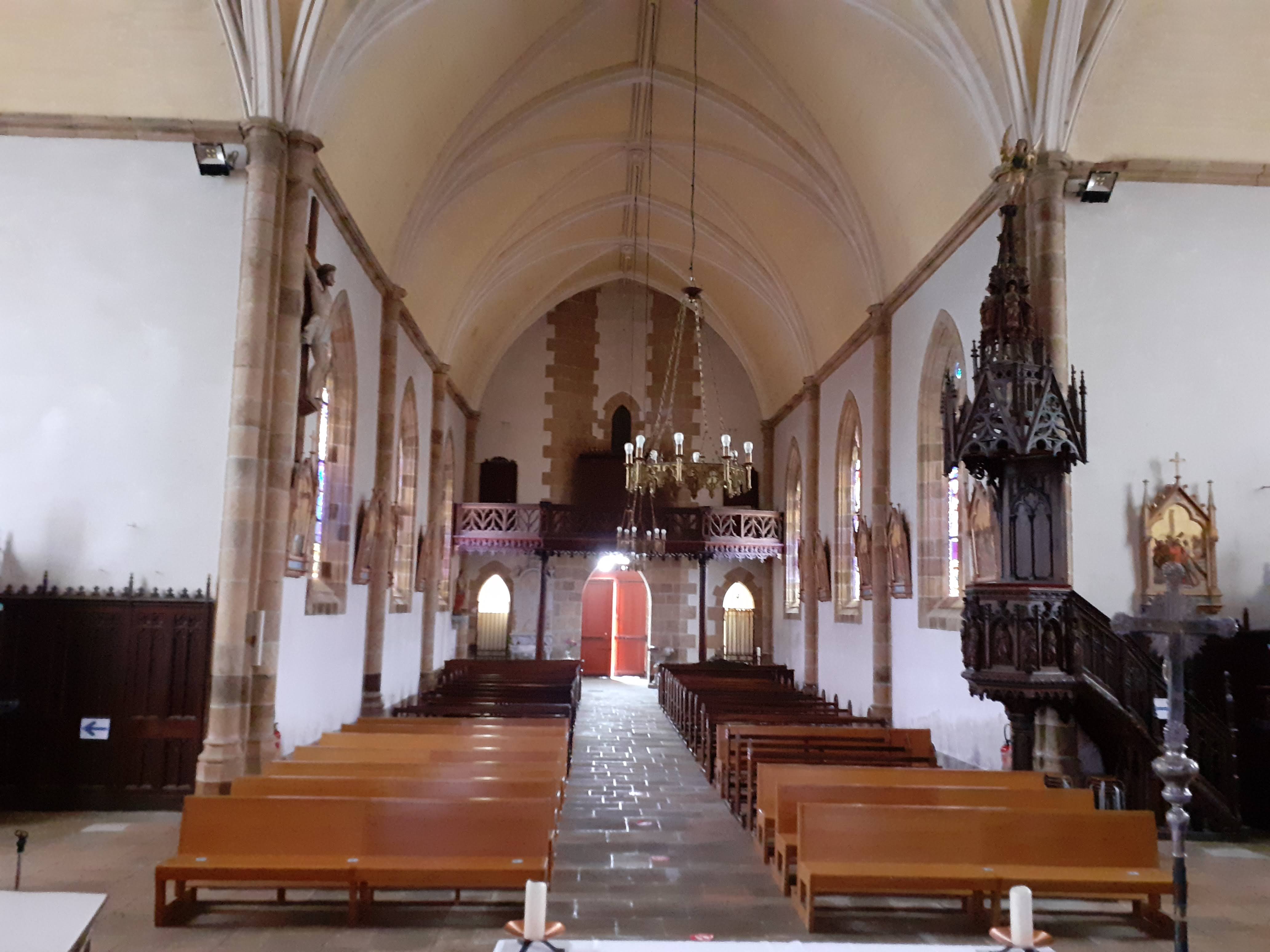 Joli clocher flèche. Église fermée. Ouvrez vos églises braves gens. 07/2021 - Voilà qui est bien, une église ouverte, enfin, avec de très beaux vitraux anciens. Nombreuses statuettes de différents saints.