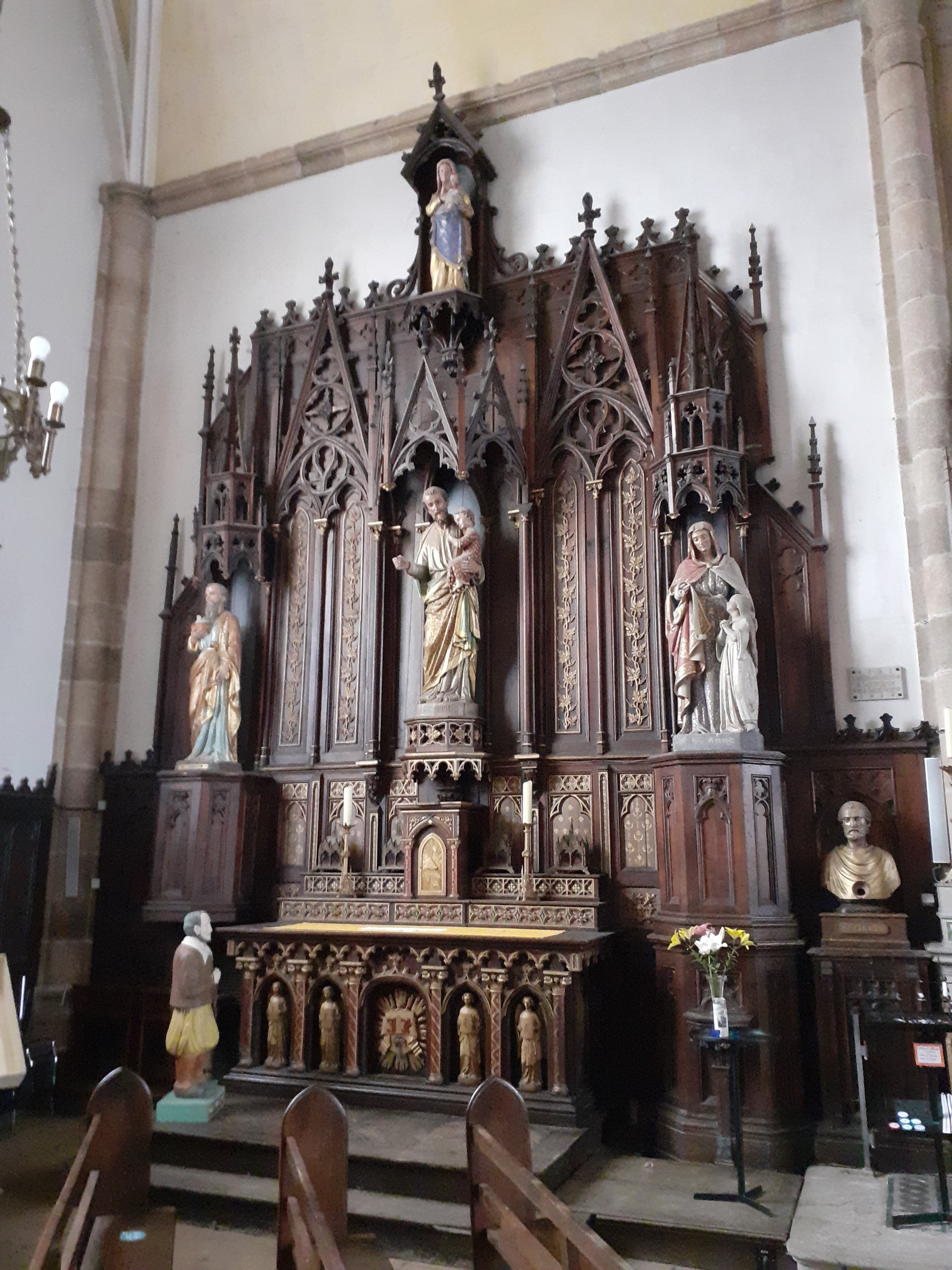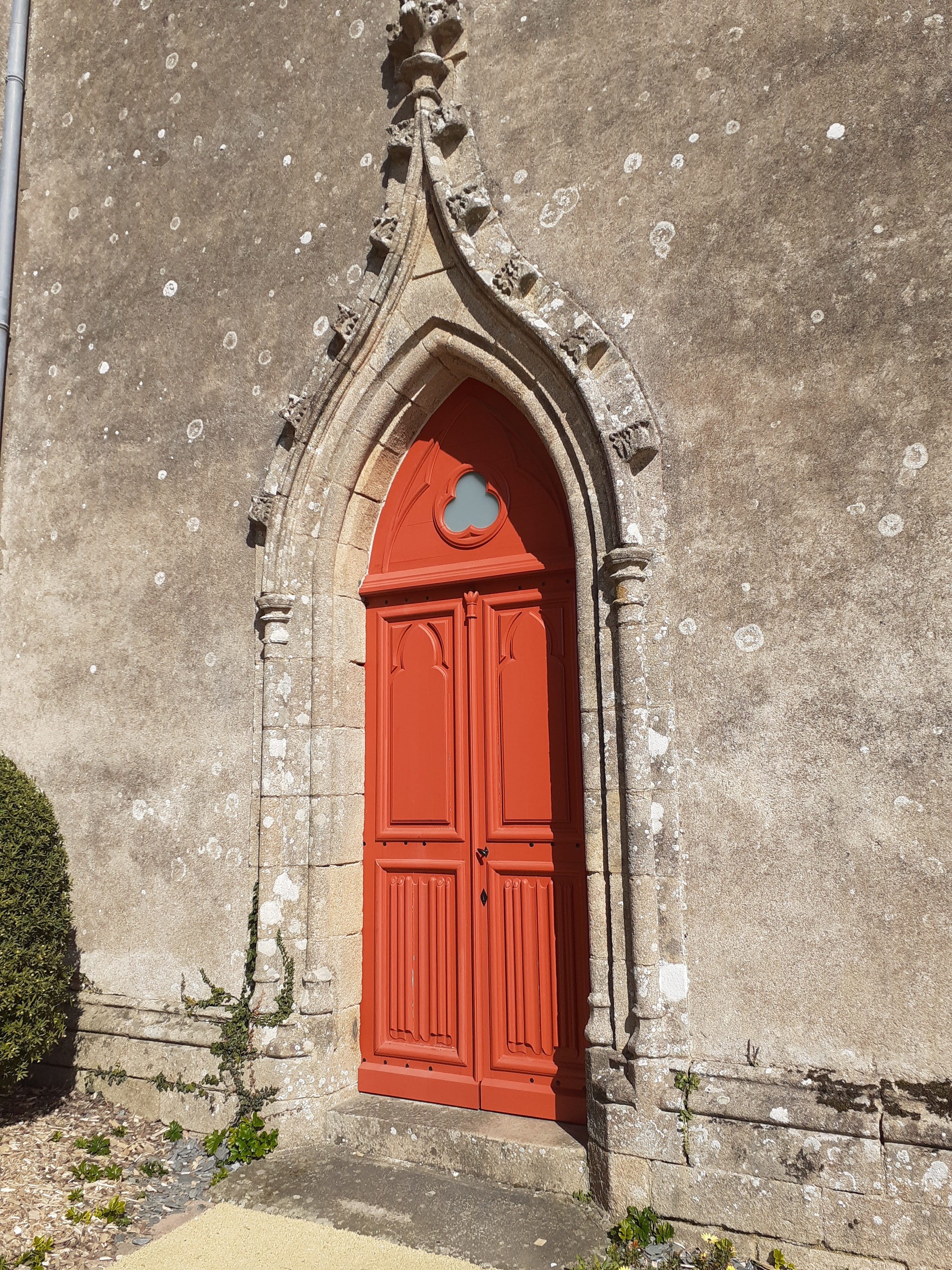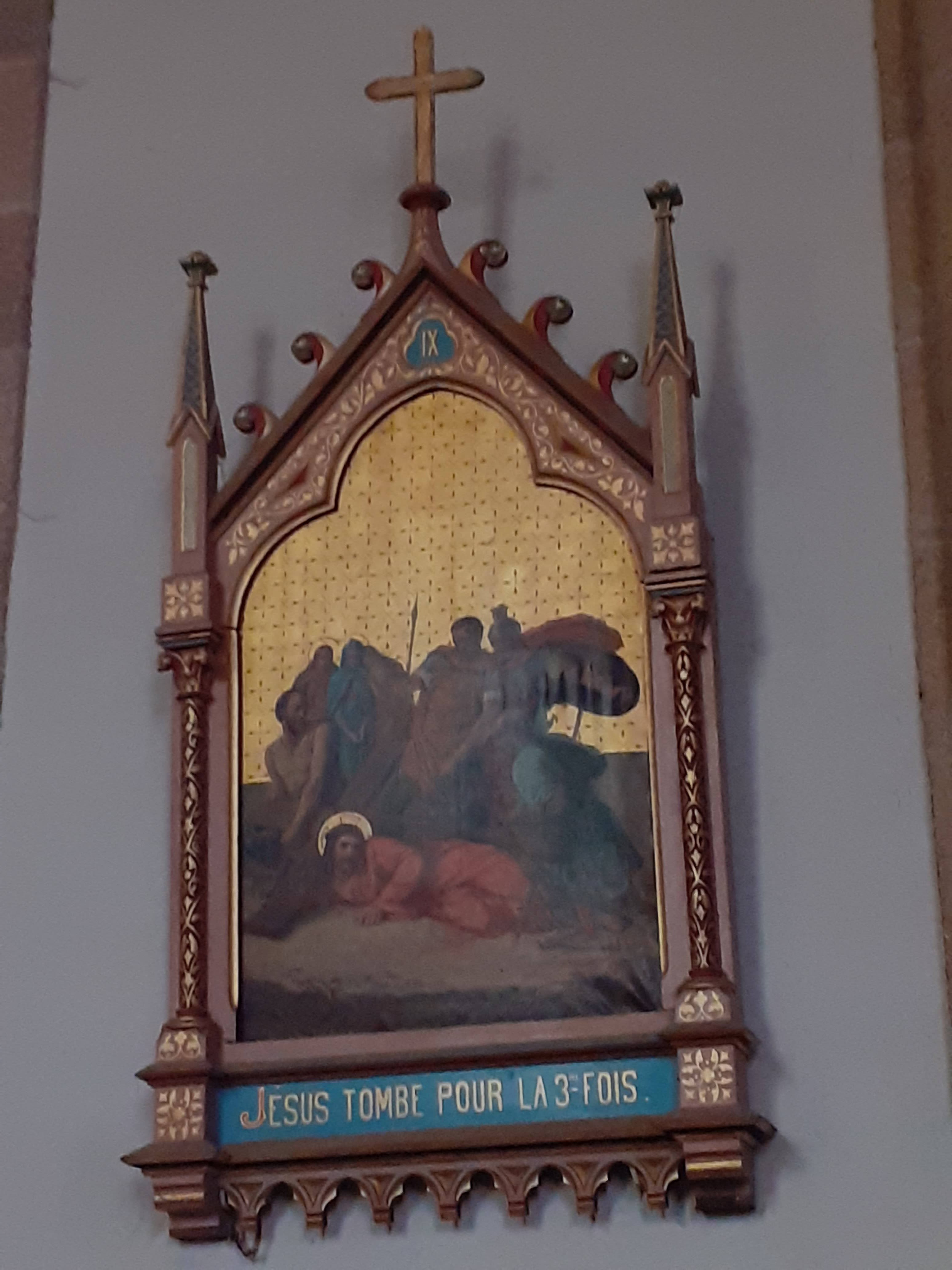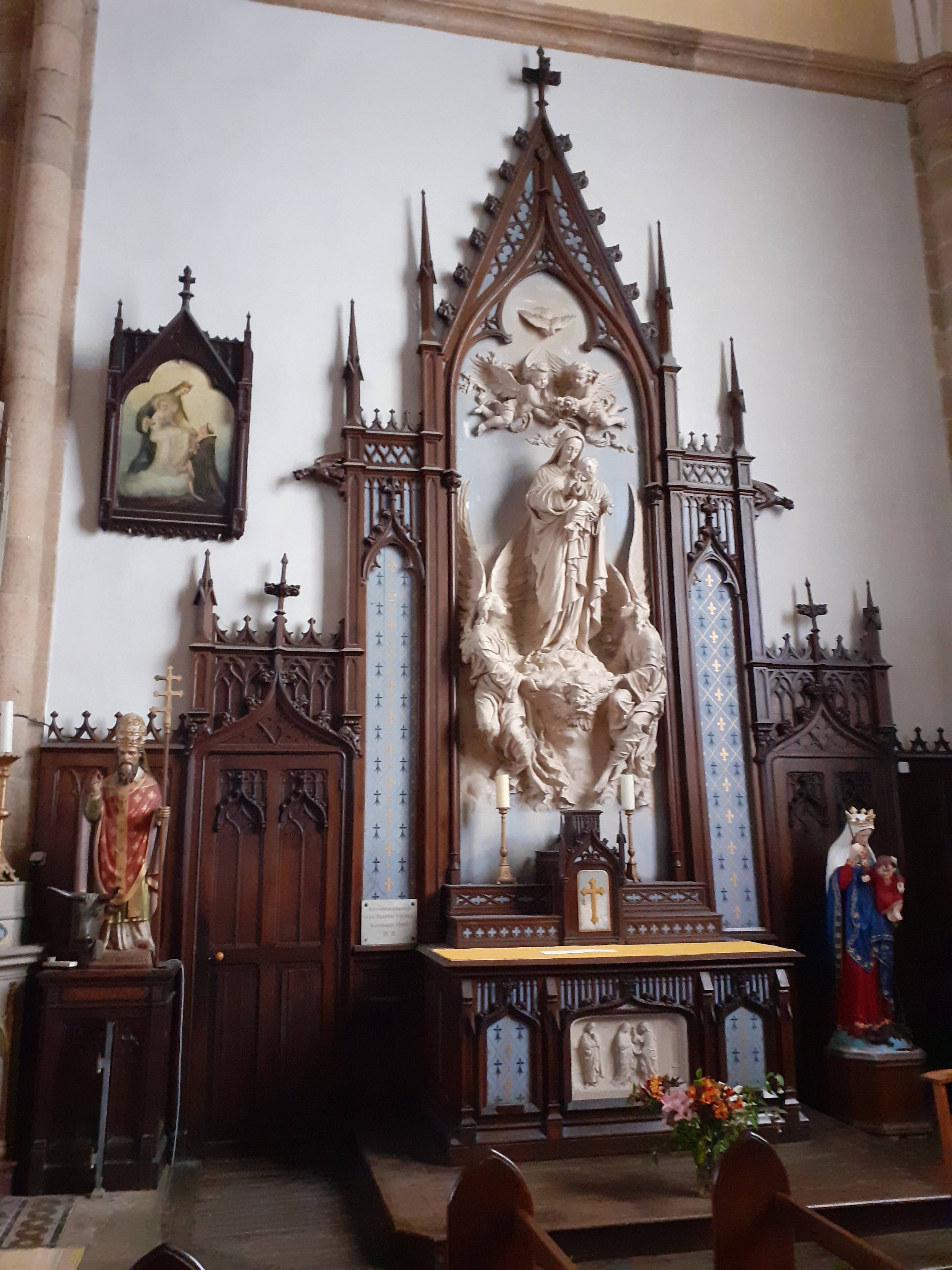 Joli clocher flèche. Église fermée. Ouvrez vos églises braves gens. 07/2021 - Voilà qui est bien, une église ouverte, enfin, avec de très beaux vitraux anciens. Nombreuses statuettes de différents saints.