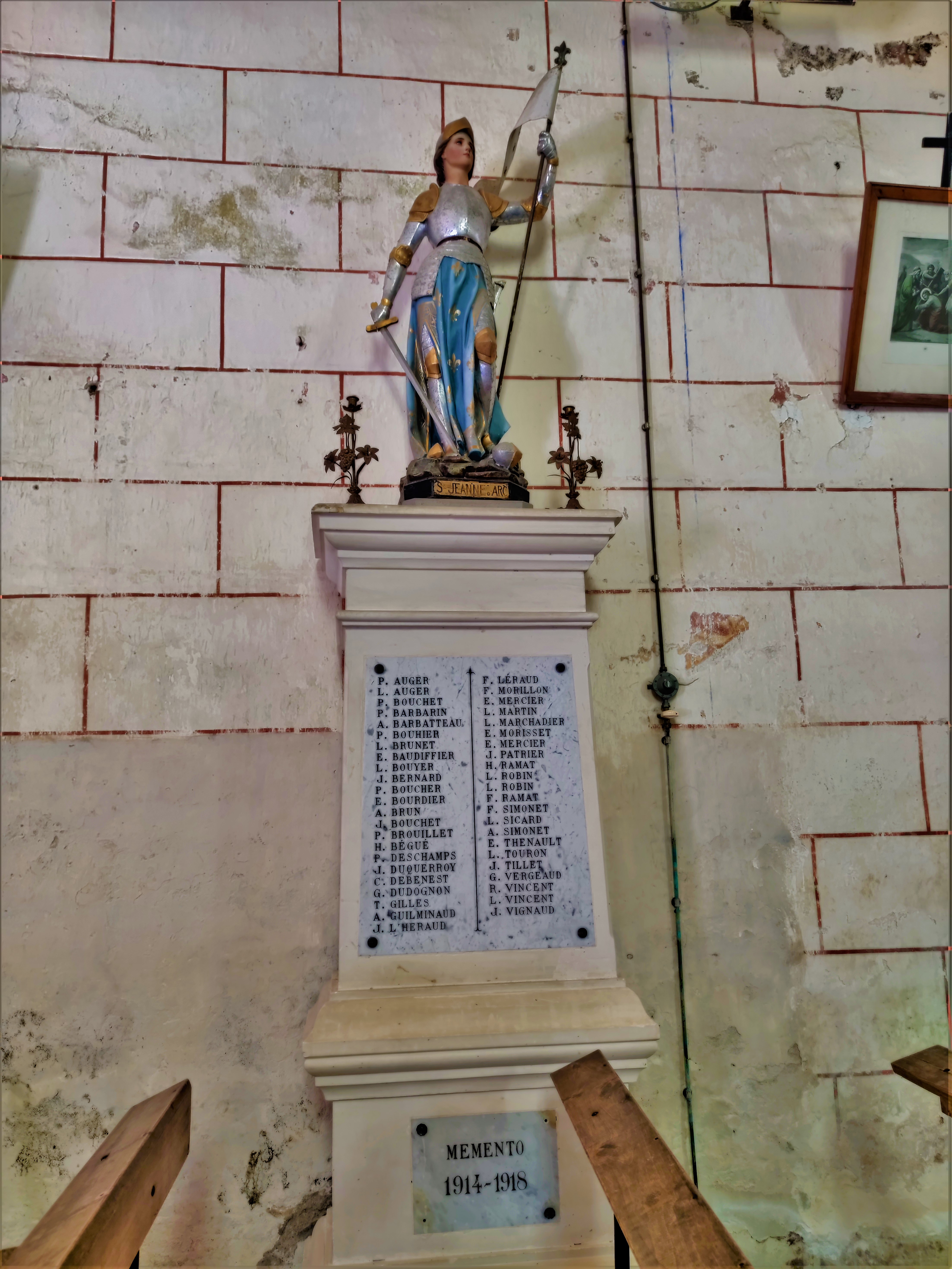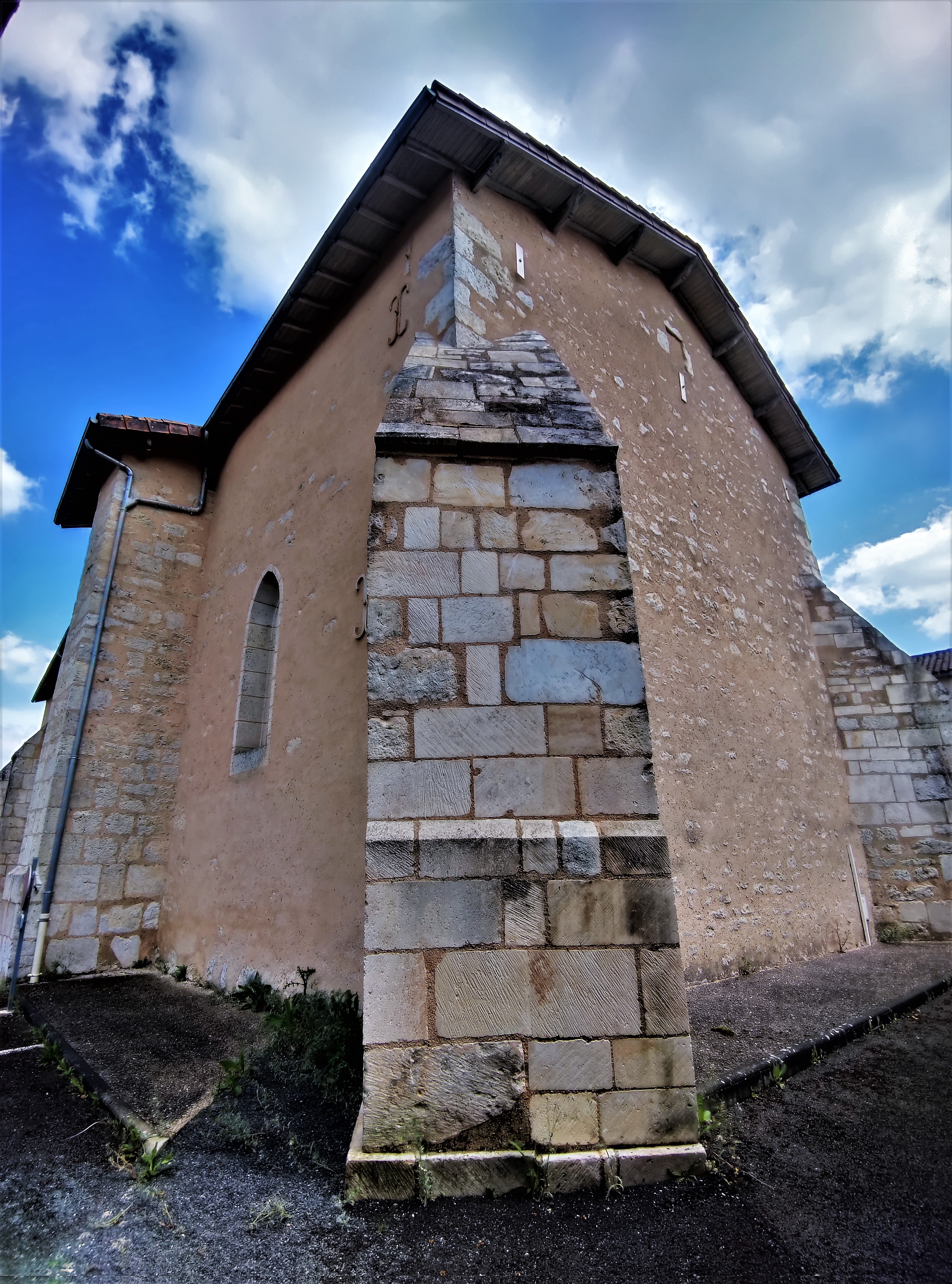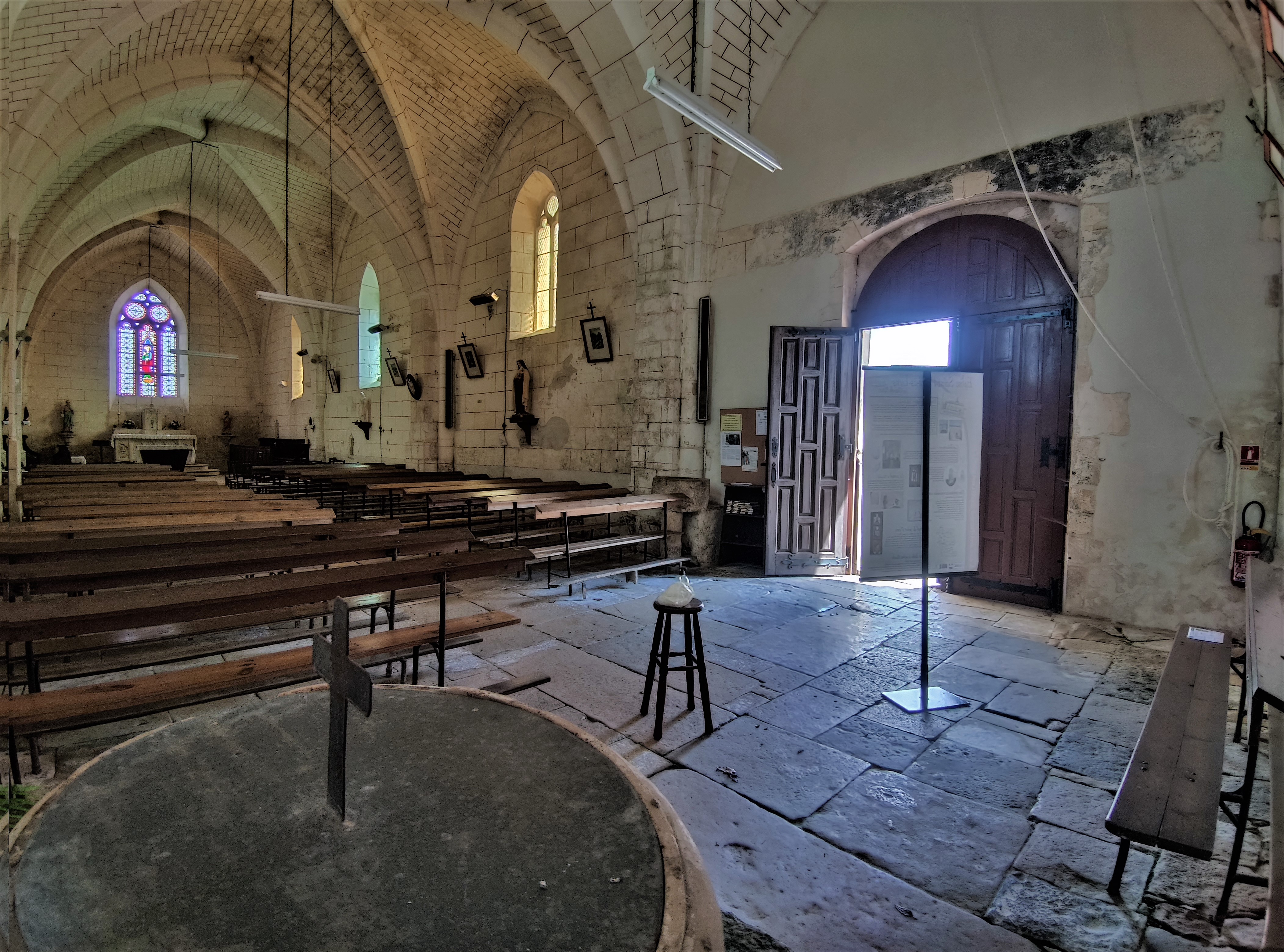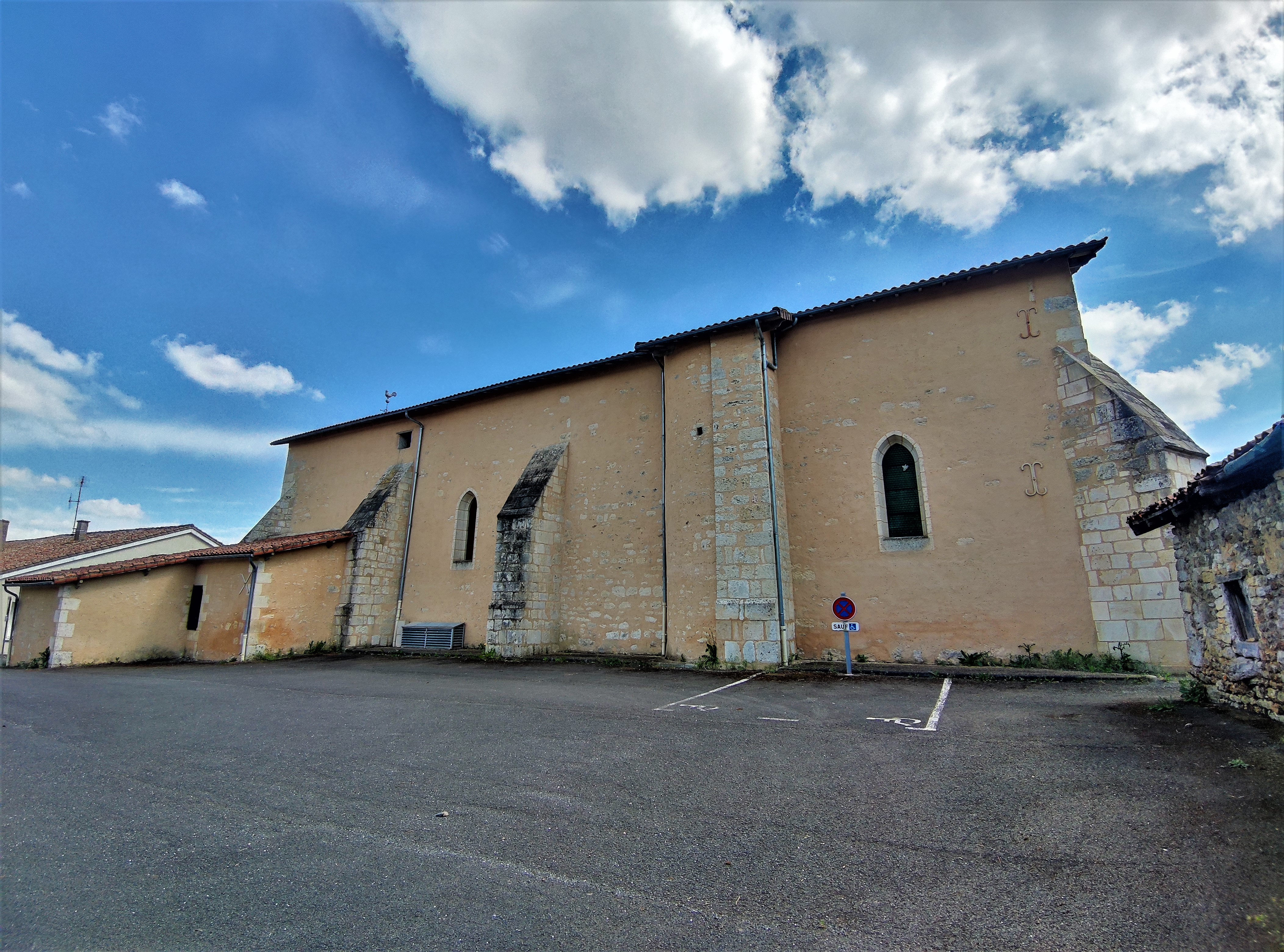 Pour la visiter, il faut s'adresser à la mairie située en face. Édifiée au 15ème, cette église est protégée par les Monuments Historiques depuis 1993 (inscription) pour ses décors peints du 16ème. Des peintures murales, découvertes au 19ème mais recouvertes de badigeon à cette époque, furent redécouvertes au 20ème, elles bénéficient aujourd'hui d'un projet de restauration. Le portail, situé sur le mur Sud, possède quelques décors du style gothique flamboyant. L'ancien clocher en bois a disparu en 1979, laissant sa place à un clocher mur à deux arcades équipées de deux cloches. Une petite église de village dont le nom est lié à Saint-Martin-de-Tours. Ce dernier aurait oublié son bâton de marche lors de son passage, donnant son nom à cette bourgade.