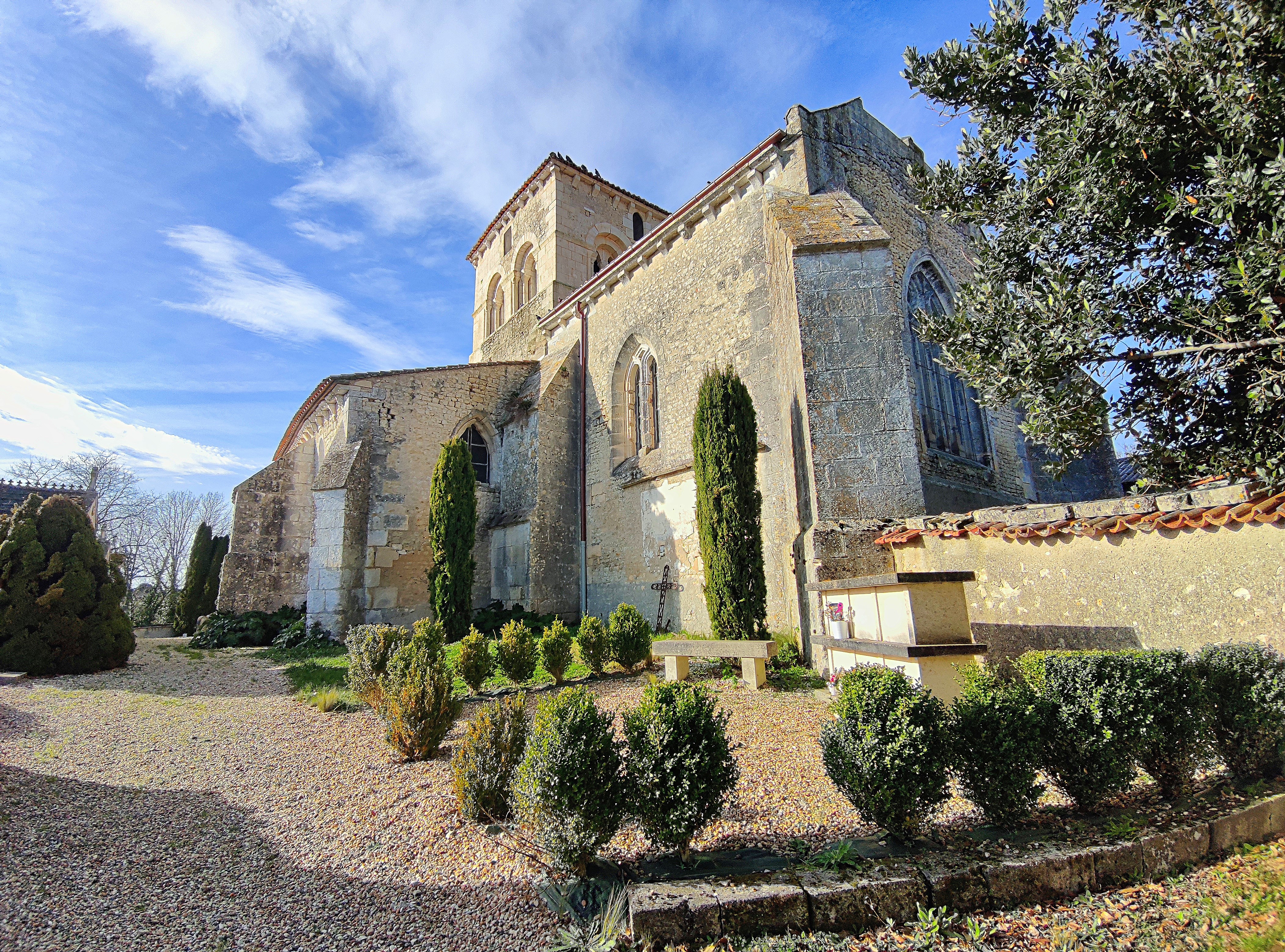 Protégée par les MH depuis 1965, c'est une belle église, mélange de styles, témoins de son histoire millénaire. Ancienne prieurale du 11è et 12è, agrandie d'une chapelle Sud au 14è, d'une au Nord au 16è, le chœur, le chevet furent reconstruits au 15è, et l'ensemble fut restauré au 19è. Je me suis contenté de l'extérieur, elle était fermée lors de mon passage, la mairie aussi. Pour y entrer, il faut compter sur la chance, ce sont des paroissiens qui se chargent de l'ouverture, les services techniques de la mairie ont la clé mais la mairie ne prête pas les clés.
