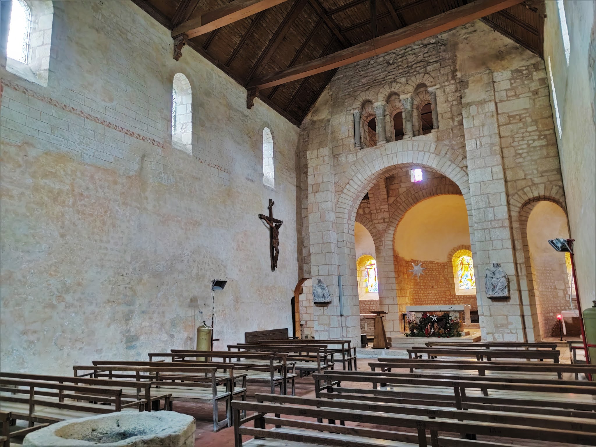 L'église Saint-Pierre, fascinant édifice millénaire, vous accueille tous les jours. Ouverte et accueillante, l'église Saint-Pierre aux liens présente aujourd'hui l'authenticité d'un édifice du 11ème siècle. Une nef à vaisseau unique s'ouvre sur un transept aussi large que la longueur de la nef, transept ouvert à l'Est sur une abside et deux absidioles. Quelques ajouts au 12ème siècle n'ont pas entamé l'attrait que procure cet édifice millénaire. Ce qui attire le regard lorsque l'on entre, c'est la croisée du transept ses 4 arcs en plein cintre, structures monumentales limitant une tour carrée qui porte le clocher. L'évocation d'une architecture carolingienne ou/et préromane est évidente. Le chevet est superbe, abside et absidioles lui procure un charme indéniable. La statuaire en pierre et bois du 16ème siècle offre à voir aux visiteurs des objets remarquables. L'église a fait l'objet de divers chantiers de restaurations depuis 1981. Ces derniers ont définitivement effacé les erreurs commises au 19ème siècle, redonnant à cette église prestance et authenticité.