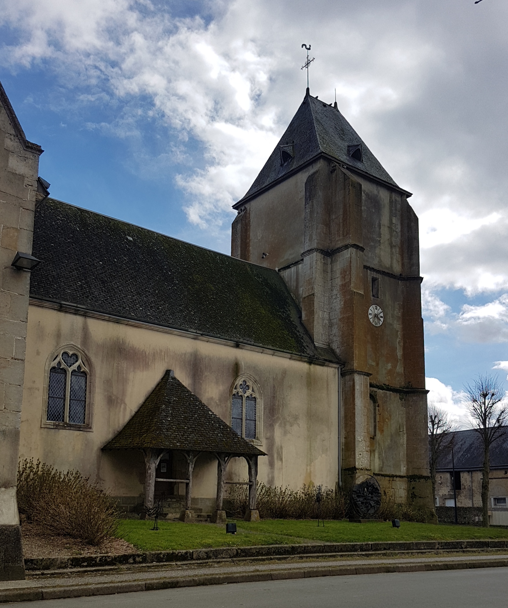 L'Église est malheureusement fermée à clé il faut demander la clé à un habitant ( par exemple la sympathique et talentueuse artiste Véronique Lesage) . La commune manque malheureusement d'argent pour restaurer les supports des superbes vitraux . À voir à l'extérieur le superbe caquetoire ( porche où les paroissiens pouvaient papoter )