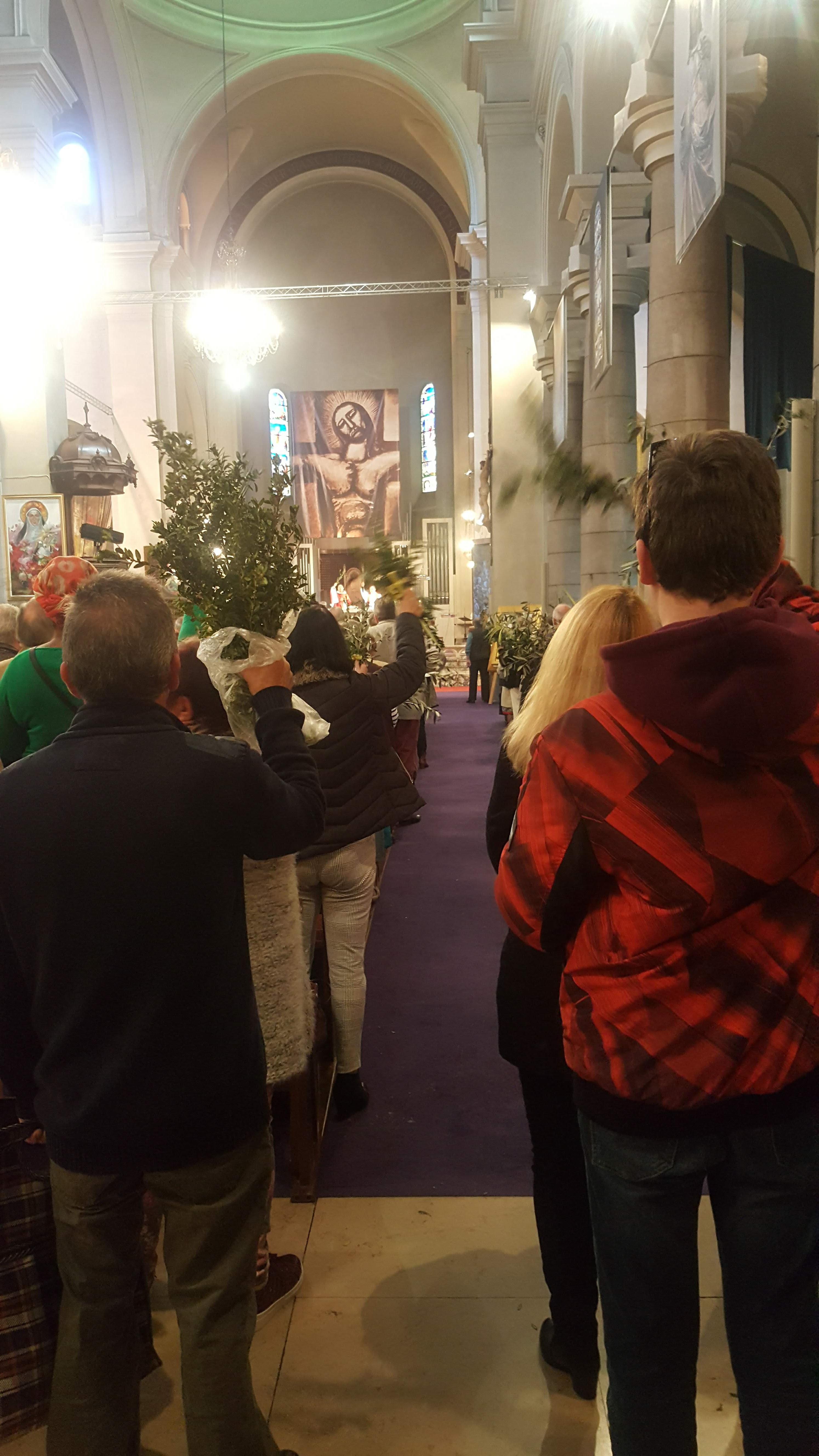 Église catholique, (avril 2019) messe du dimanche des Rameaux en français. Très belle église ancienne.