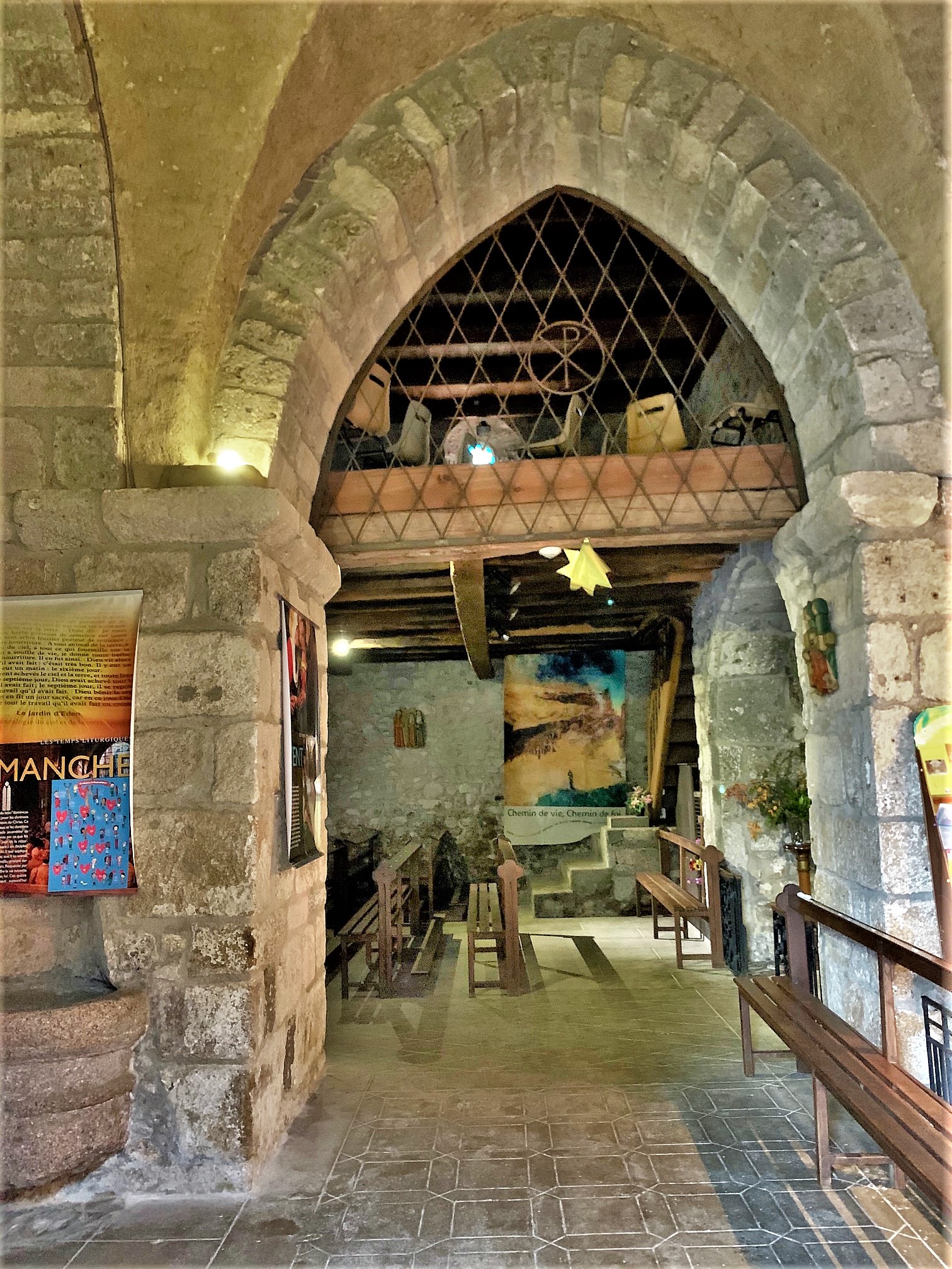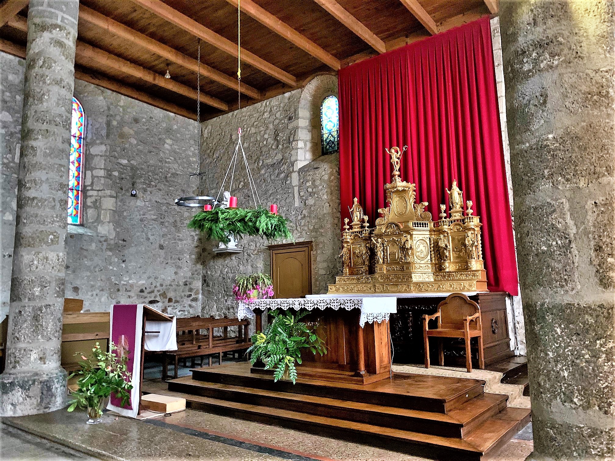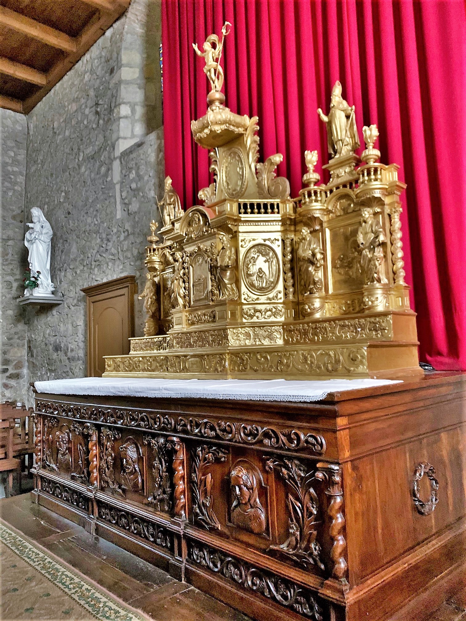 4 sur 5, comme le nombre de monuments religieux de la commune de Chabanais, un village de 1600 habitants possédant 4 clochers. L'église Saint-Pierre, construite au 17ème siècle, n'est peut-être pas la plus prestigieuse mais je l'ai trouvé accueillante, vivante car investie par les paroissiens, et un brin mystérieuse. Désorientée, le chœur est au sud-ouest, on y pénètre curieusement par le clocher-porche situé à droite du mur Est. Au dessus du portail, une niche abrite une sculpture de Saint-Pierre, copie en bois d'une création primitive en pierre, que le temps avait dégradé. Cinq colonnes, qui devaient soutenir une voûte en pierre, aujourd'hui disparue ou peut-être jamais construite, occupent la nef, plafonnée en bois. Sous la tribune, ajoutée au 19ème siècle, l'endroit est sombre et une cuve baptismale est intégrée au mur. Un tableau intéressant, réalisé au 19ème siècle, copie d'une oeuvre exposée au Louvre, est à voir. L'autel-tabernacle-retable du 18ème siècle, classé en 1980, est superbe. Le chemin de croix, de belle facture, est l'ouvrage de Claude Gruer. Les trois autres clochers sont l'église Saint-Sébastien du 19ème siècle, le clocher Saint-Michel, seul reste d'une église romane, et le prieuré Notre-Dame de Grenord, restes d'une église du 12ème siècle située à 2 kms.