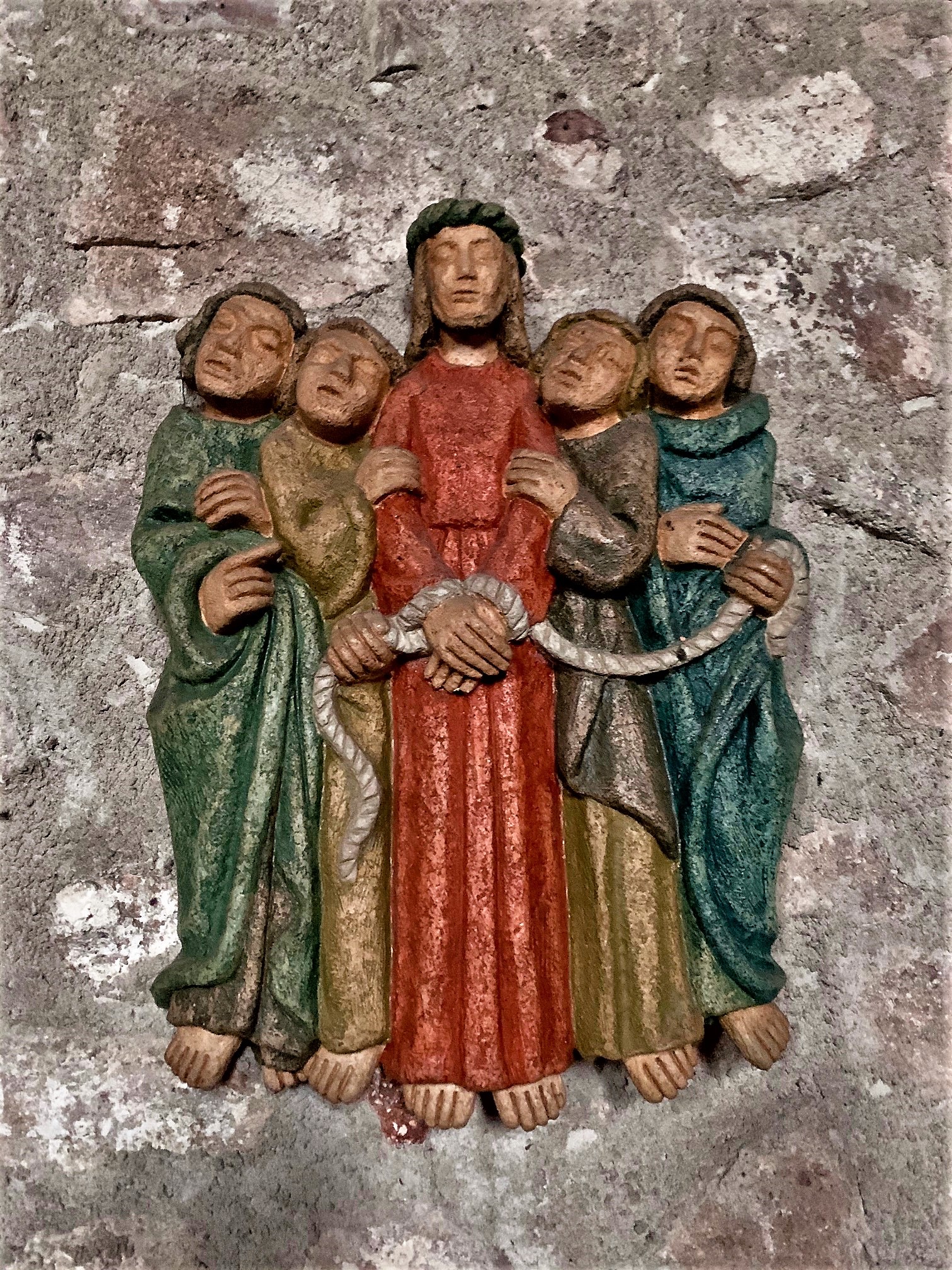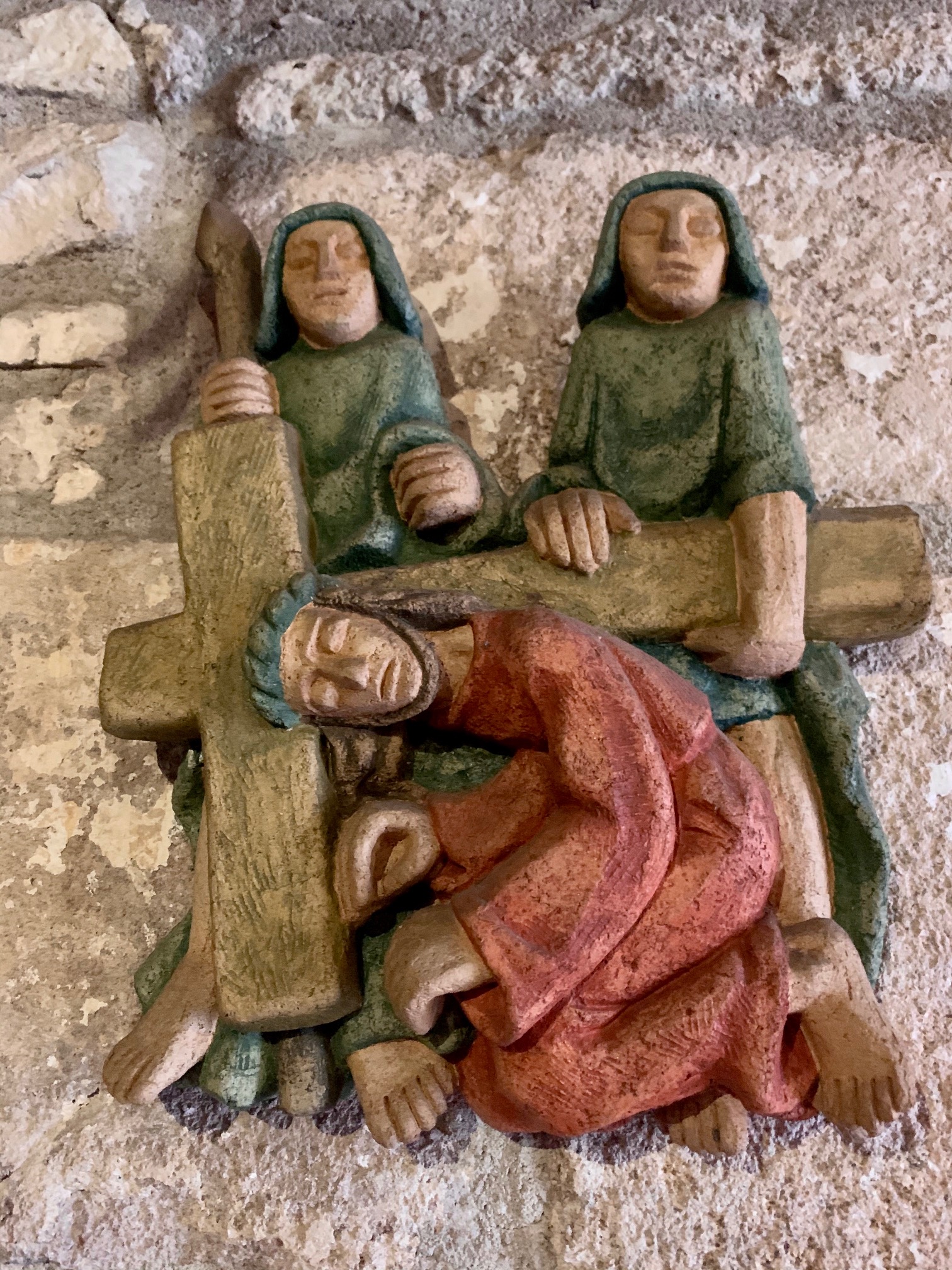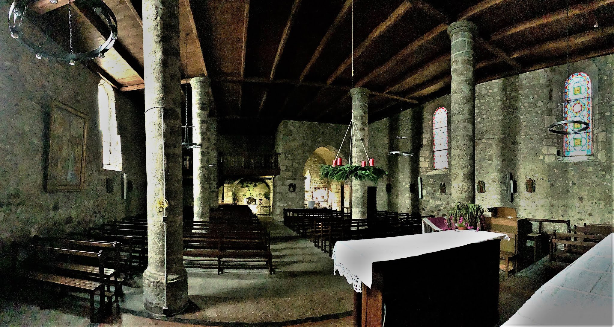 4 sur 5, comme le nombre de monuments religieux de la commune de Chabanais, un village de 1600 habitants possédant 4 clochers. L'église Saint-Pierre, construite au 17ème siècle, n'est peut-être pas la plus prestigieuse mais je l'ai trouvé accueillante, vivante car investie par les paroissiens, et un brin mystérieuse. Désorientée, le chœur est au sud-ouest, on y pénètre curieusement par le clocher-porche situé à droite du mur Est. Au dessus du portail, une niche abrite une sculpture de Saint-Pierre, copie en bois d'une création primitive en pierre, que le temps avait dégradé. Cinq colonnes, qui devaient soutenir une voûte en pierre, aujourd'hui disparue ou peut-être jamais construite, occupent la nef, plafonnée en bois. Sous la tribune, ajoutée au 19ème siècle, l'endroit est sombre et une cuve baptismale est intégrée au mur. Un tableau intéressant, réalisé au 19ème siècle, copie d'une oeuvre exposée au Louvre, est à voir. L'autel-tabernacle-retable du 18ème siècle, classé en 1980, est superbe. Le chemin de croix, de belle facture, est l'ouvrage de Claude Gruer. Les trois autres clochers sont l'église Saint-Sébastien du 19ème siècle, le clocher Saint-Michel, seul reste d'une église romane, et le prieuré Notre-Dame de Grenord, restes d'une église du 12ème siècle située à 2 kms.
