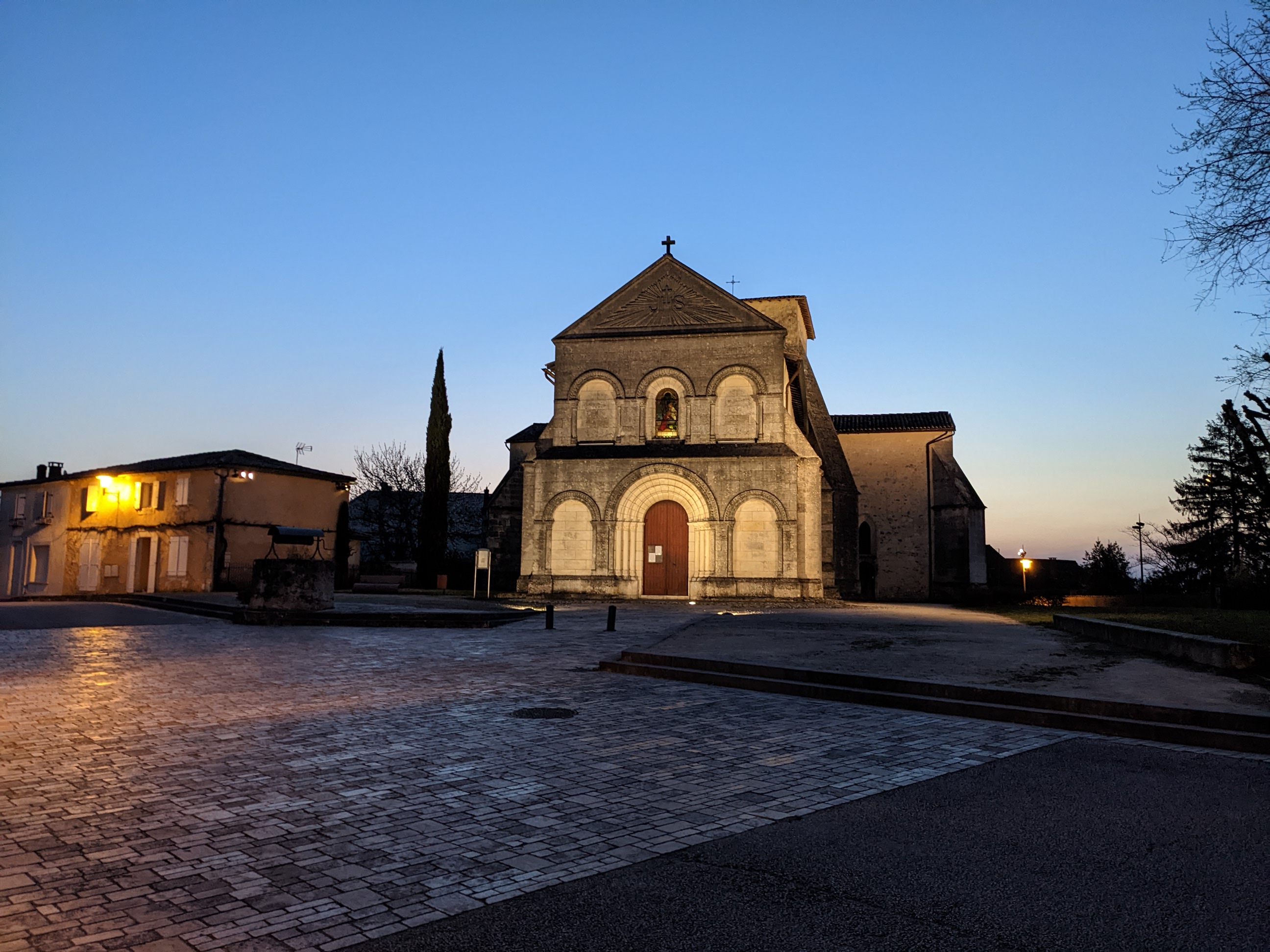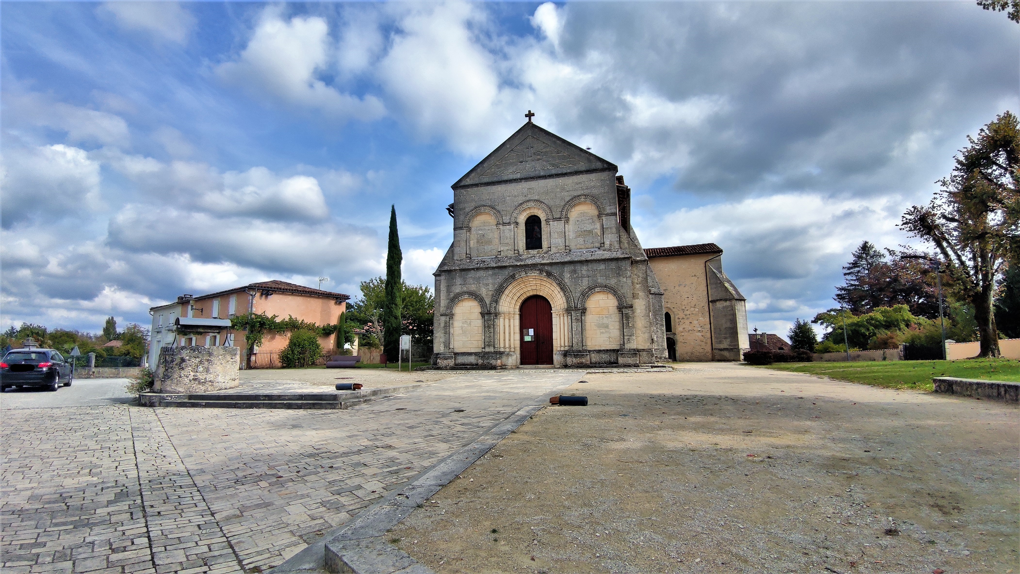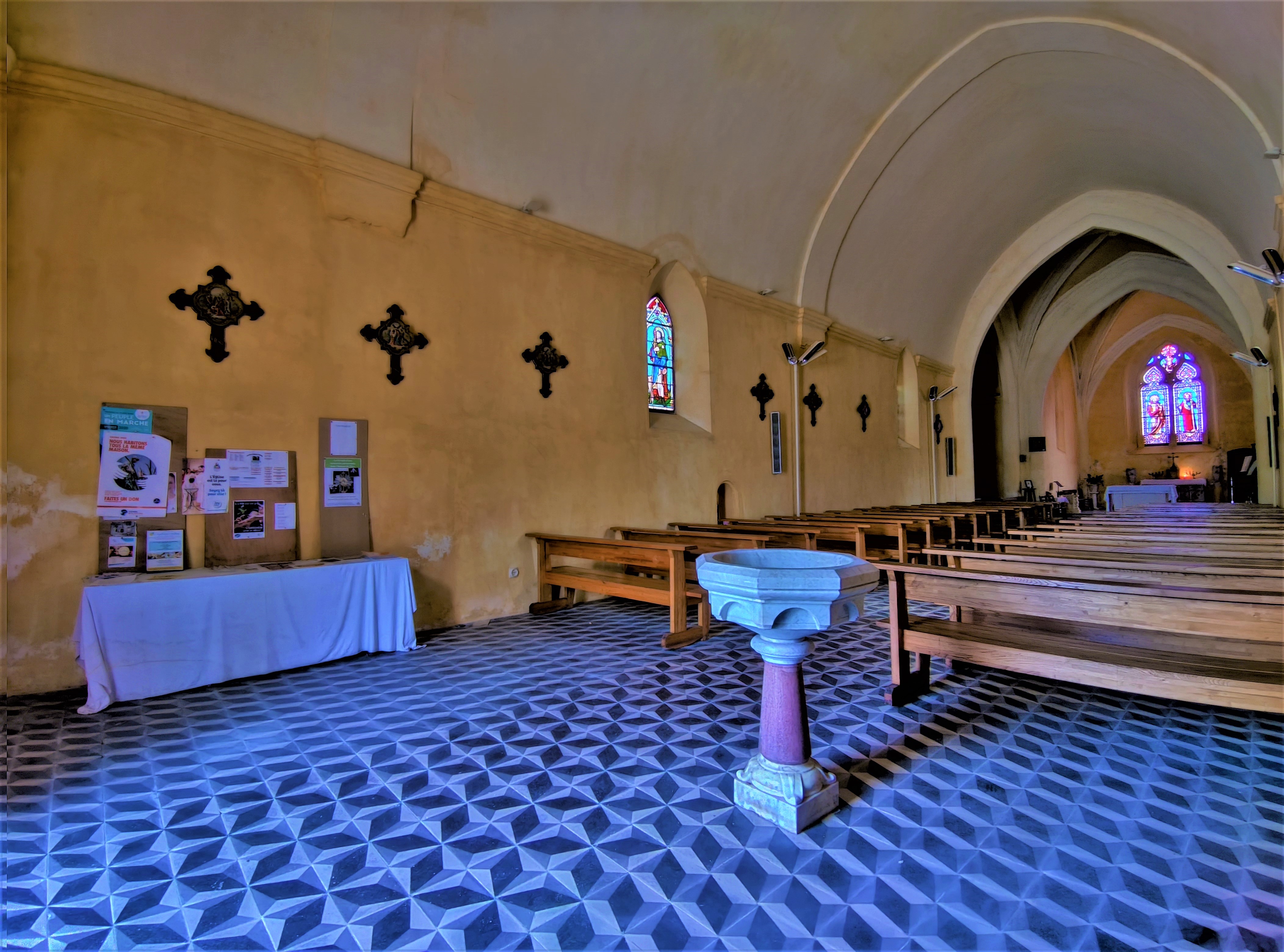 Des origines romanes du 12ème siècle, sans vestiges apparents, mais dont l'allure primitive a été préservée : église ouverte et accueillante. Toute la partie Est a été reconstruite au 15ème siècle dans le style gothique ; le plan en croix latine, la croisée du transept voûtée d'ogives, le clocher carré fortement contreforté comme les croisillons et le chevet. La belle façade néo-romane à 2 niveaux d'arcatures surmontés d'un pignon gravé de l'emblème JHS date du 19ème siècle. Les 4 ouvertures ogivales et le recouvrement en berceau brisé de la nef ont été refaits à la même époque. Malgré toutes ces transformations, cette église respire une forme d'authenticité médiévale, elle témoigne de presque mille ans de l'histoire locale. Une curiosité, la sacristie de style classique accolée au chevet. Ouverte et accueillante, mise en valeur au milieu du village, cette église est bien préservée et bien entretenue, les paroissiens tiennent à leur église, les paroissiens et les collectivités à leur patrimoine bâti.