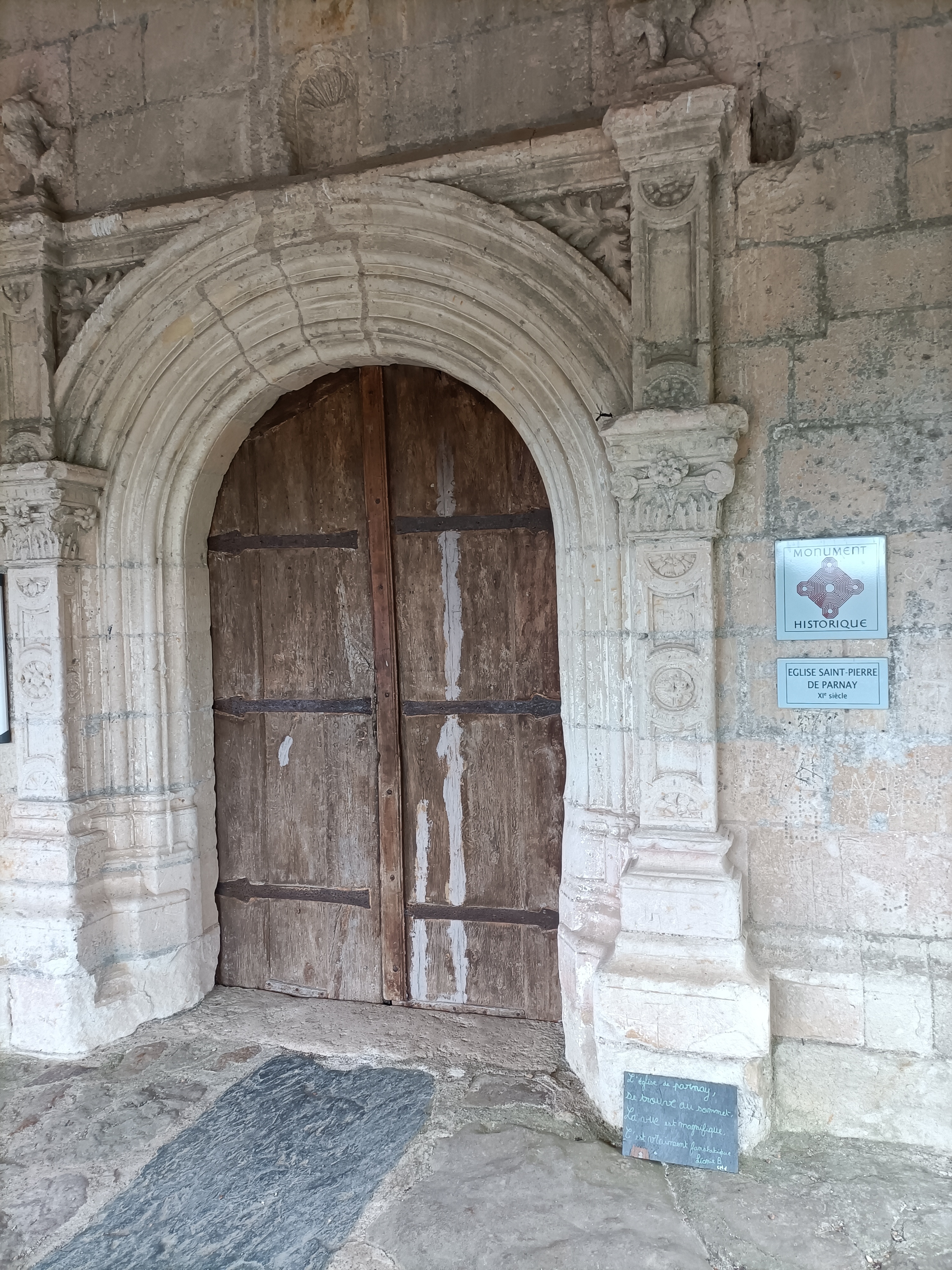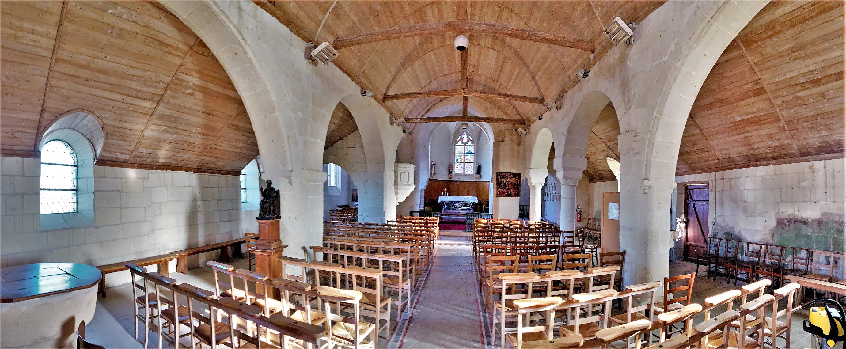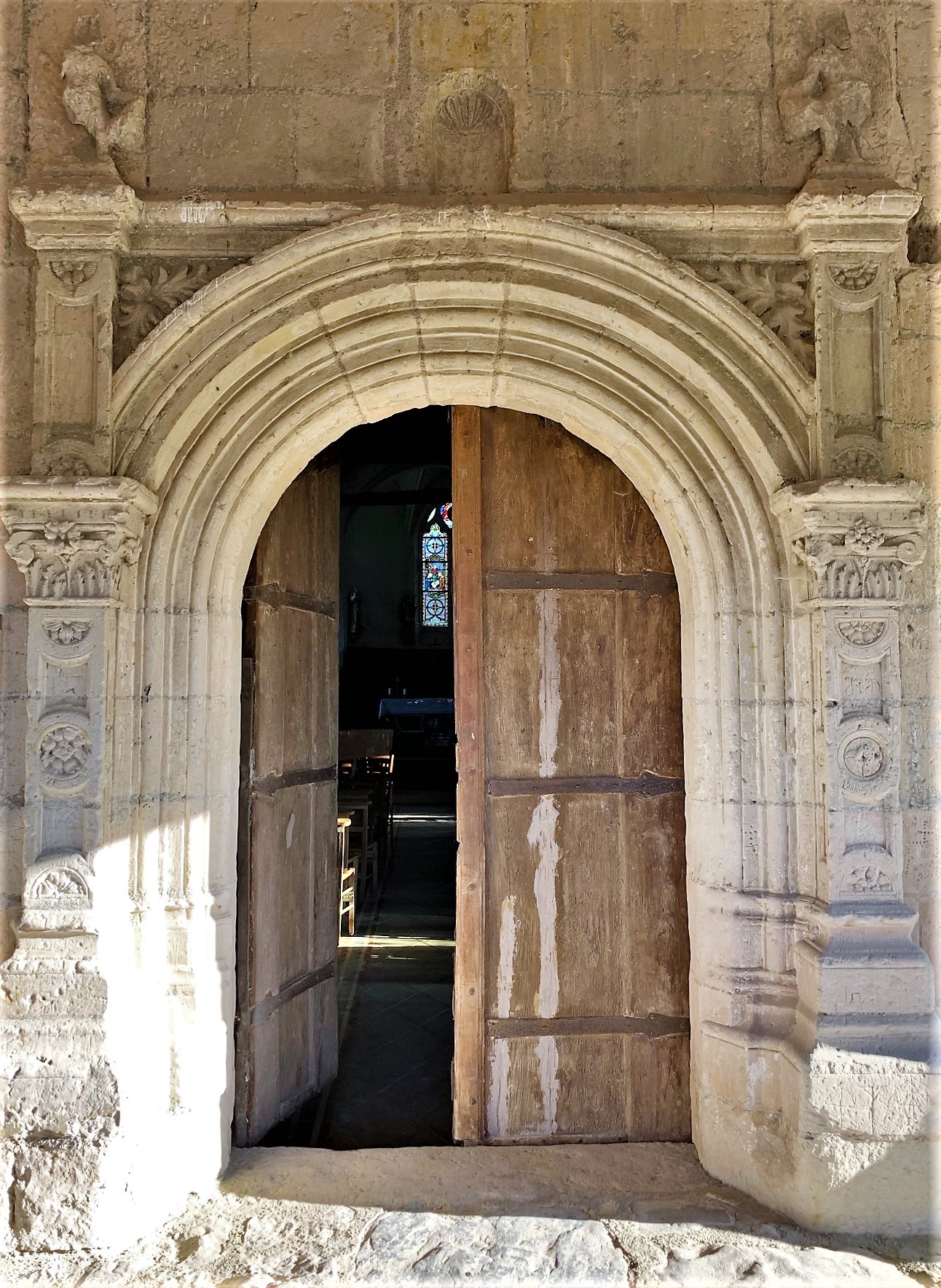 La chance était avec moi, j'ai pu la visiter alors qu'elle est normalement fermée. Venu jusqu'à cette église sur les conseils d'un habitant de la région, alors qu'elle est habituellement fermée, le maire et un employé municipal discutaient d'un travail à effectuer et j'ai été autorisé à pénétrer l'édifice. L'église du 11ème siècle a beaucoup évoluée au cours des temps. Les chapiteaux qui ornent les piliers de la nef en sont les vestiges. Le clocher est du 12ème siècle, le transept, l'abside polygonale et le chœur sont du 15ème siècle, d'un pur style gothique. Reconstruite au 19ème siècle, la nef est à trois vaisseaux, les collatéraux sont séparés du vaisseau central par des arcades en plein cintre reposant sur les piliers cités plus haut. La nef et les bas-côtés sont voûtés d'un même berceau de lambris, la croisée du transept possède un voûte de pierres en berceau légèrement brisé, la voûte du chœur est à croisée d'ogives, comme celle de la chapelle de la vierge dans le bras nord du transept. Un lieu intime, idéal pour se recueillir, un auvent abrite l'entrée et l'étonnant portail de style renaissance. Beaucoup de charme se dégage de cette église classée en 1950.