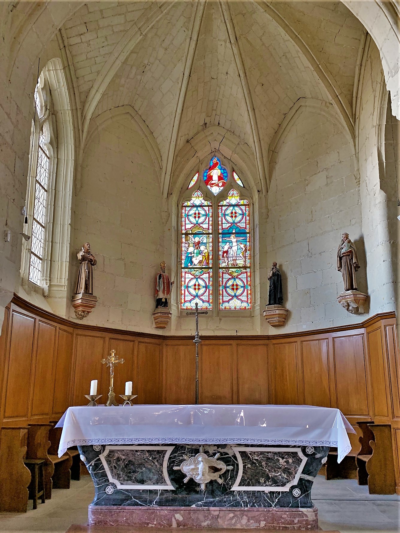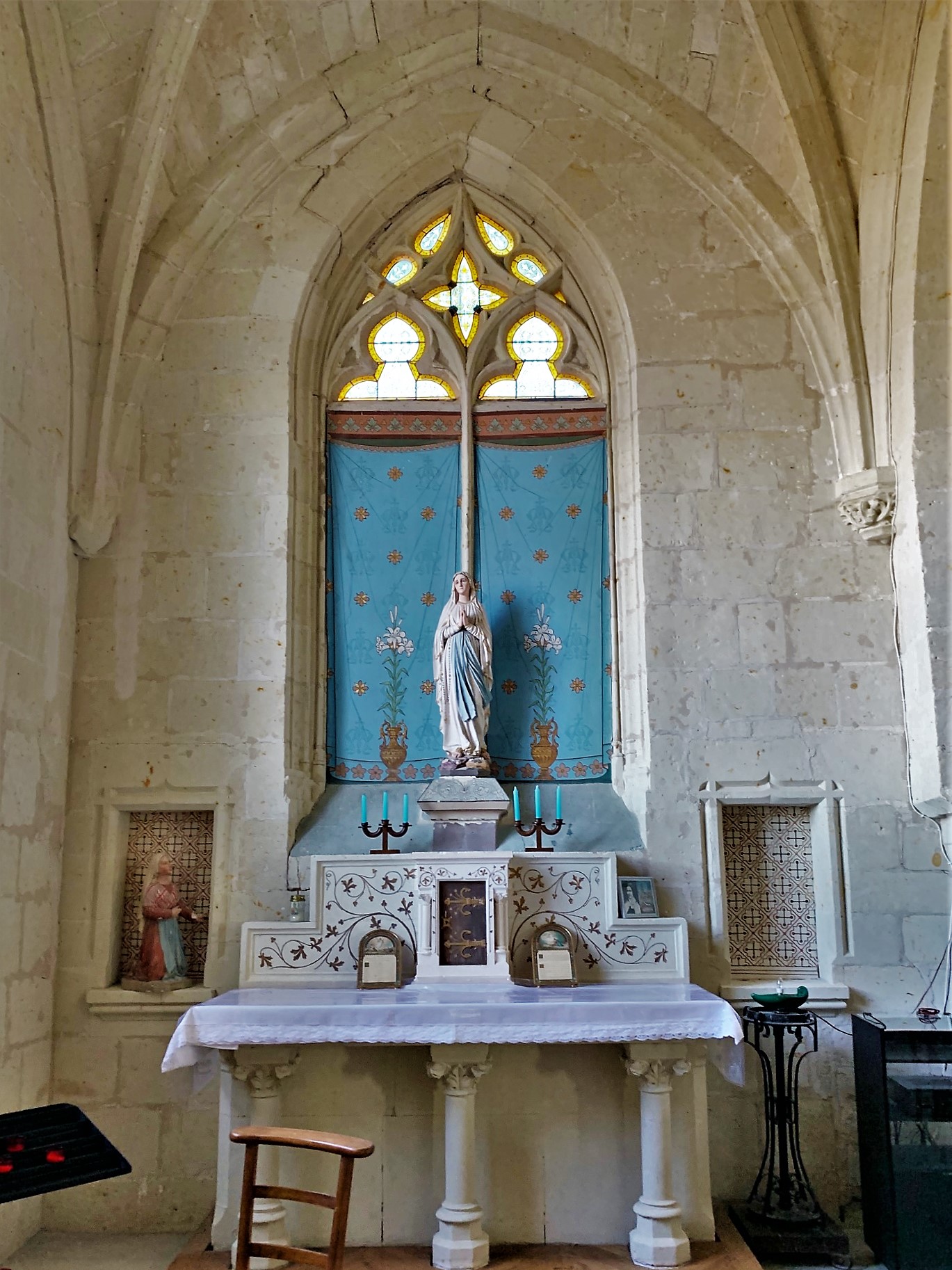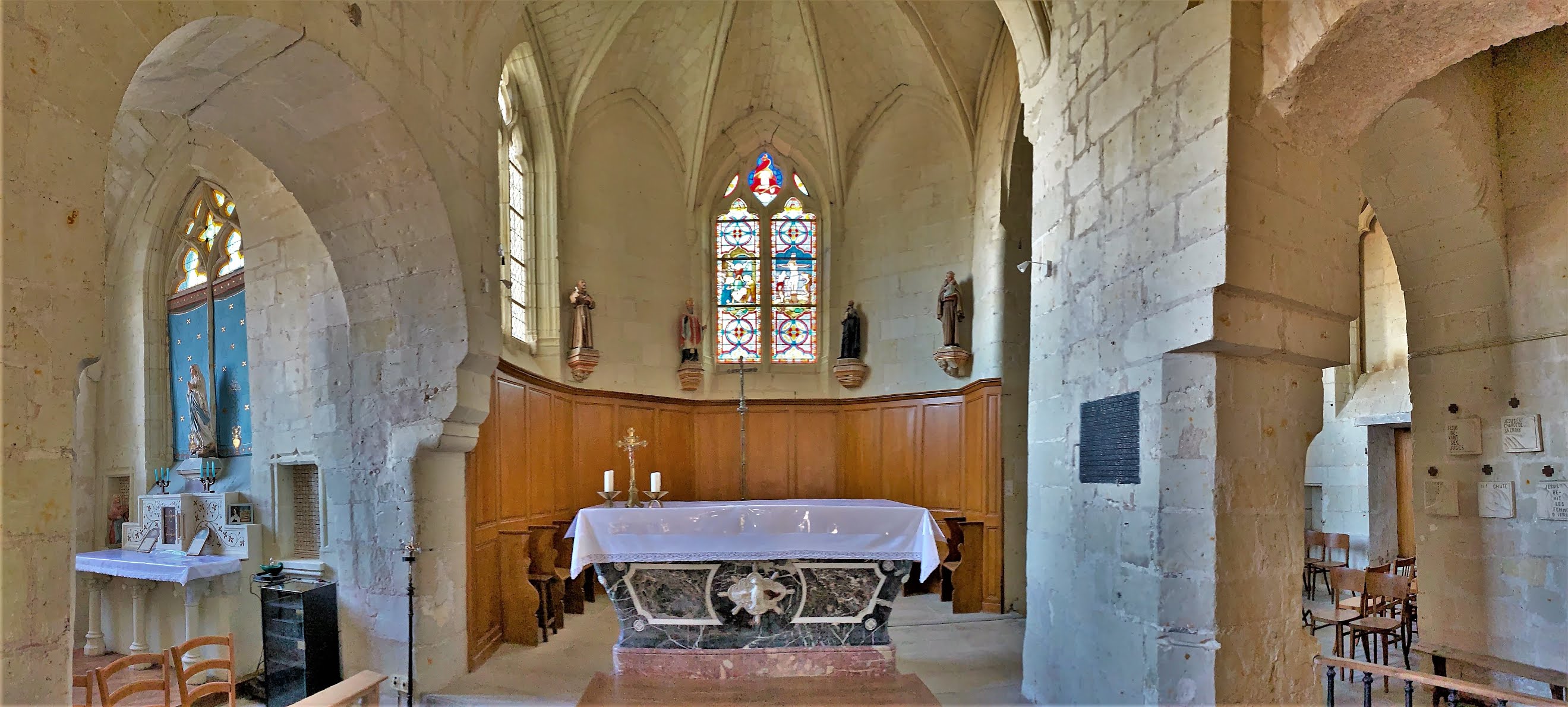 La chance était avec moi, j'ai pu la visiter alors qu'elle est normalement fermée. Venu jusqu'à cette église sur les conseils d'un habitant de la région, alors qu'elle est habituellement fermée, le maire et un employé municipal discutaient d'un travail à effectuer et j'ai été autorisé à pénétrer l'édifice. L'église du 11ème siècle a beaucoup évoluée au cours des temps. Les chapiteaux qui ornent les piliers de la nef en sont les vestiges. Le clocher est du 12ème siècle, le transept, l'abside polygonale et le chœur sont du 15ème siècle, d'un pur style gothique. Reconstruite au 19ème siècle, la nef est à trois vaisseaux, les collatéraux sont séparés du vaisseau central par des arcades en plein cintre reposant sur les piliers cités plus haut. La nef et les bas-côtés sont voûtés d'un même berceau de lambris, la croisée du transept possède un voûte de pierres en berceau légèrement brisé, la voûte du chœur est à croisée d'ogives, comme celle de la chapelle de la vierge dans le bras nord du transept. Un lieu intime, idéal pour se recueillir, un auvent abrite l'entrée et l'étonnant portail de style renaissance. Beaucoup de charme se dégage de cette église classée en 1950.