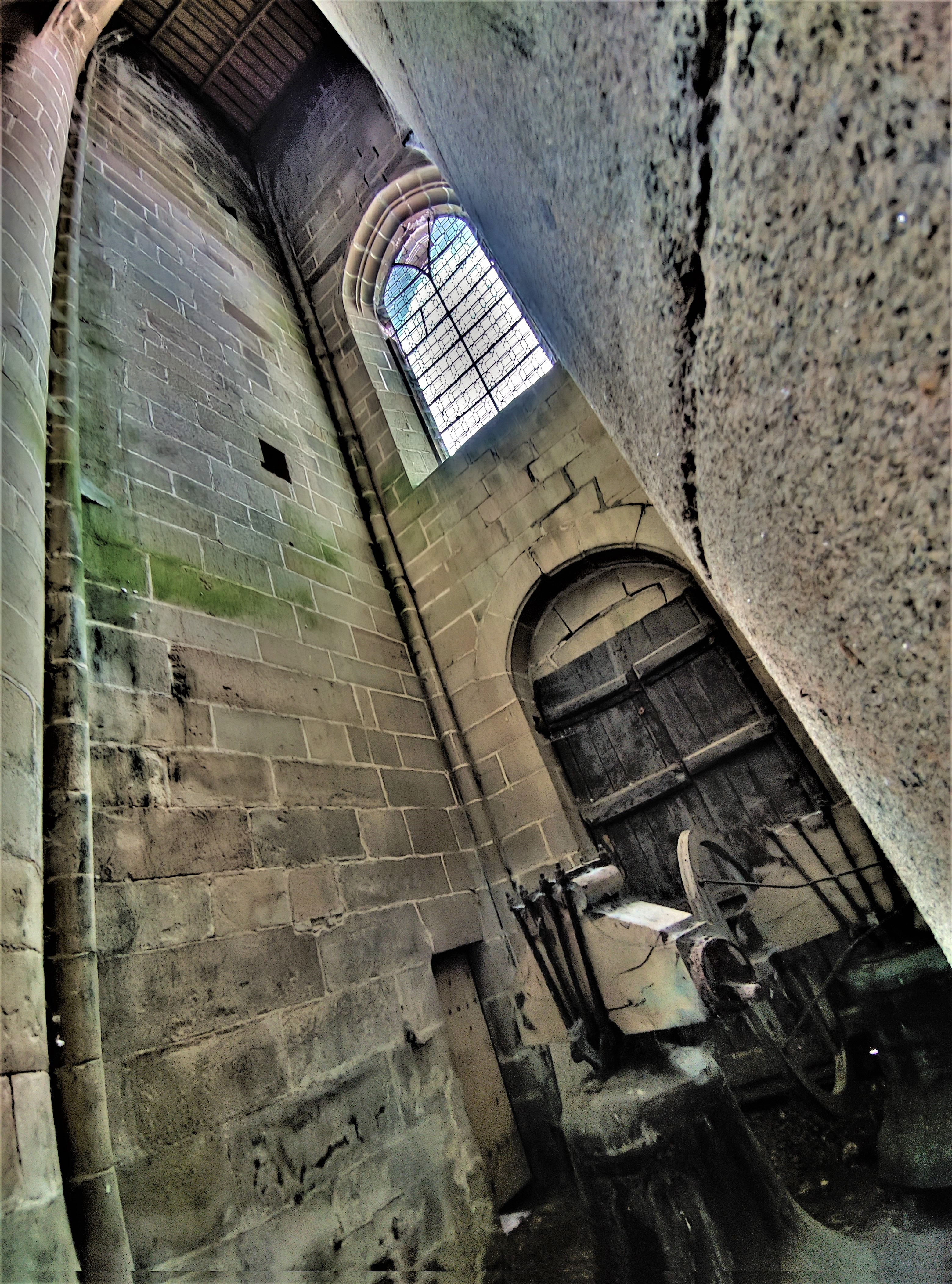 Même une église vide en cours de rénovation peut être très intéressante. A voir de l'extérieur, les belles baies vitrées peuvent être admirées une fois à l'intérieur. La fenêtre avec la représentation de Saint Eloi se démarque clairement. Les cloches de l'église suspendues sont également visibles à l'arrière. C'était très surprenant de voir un intérieur d'église comme celui-là.