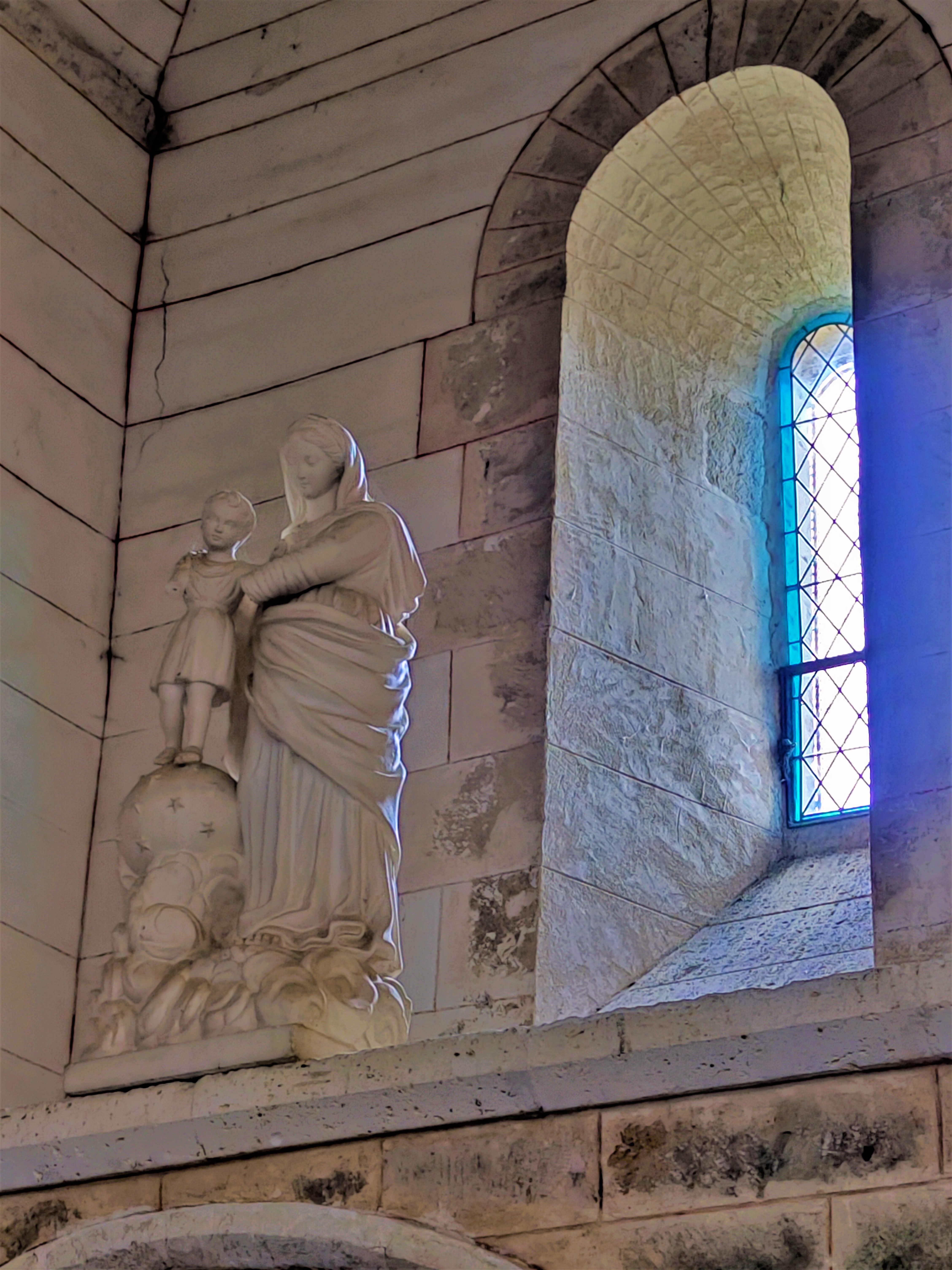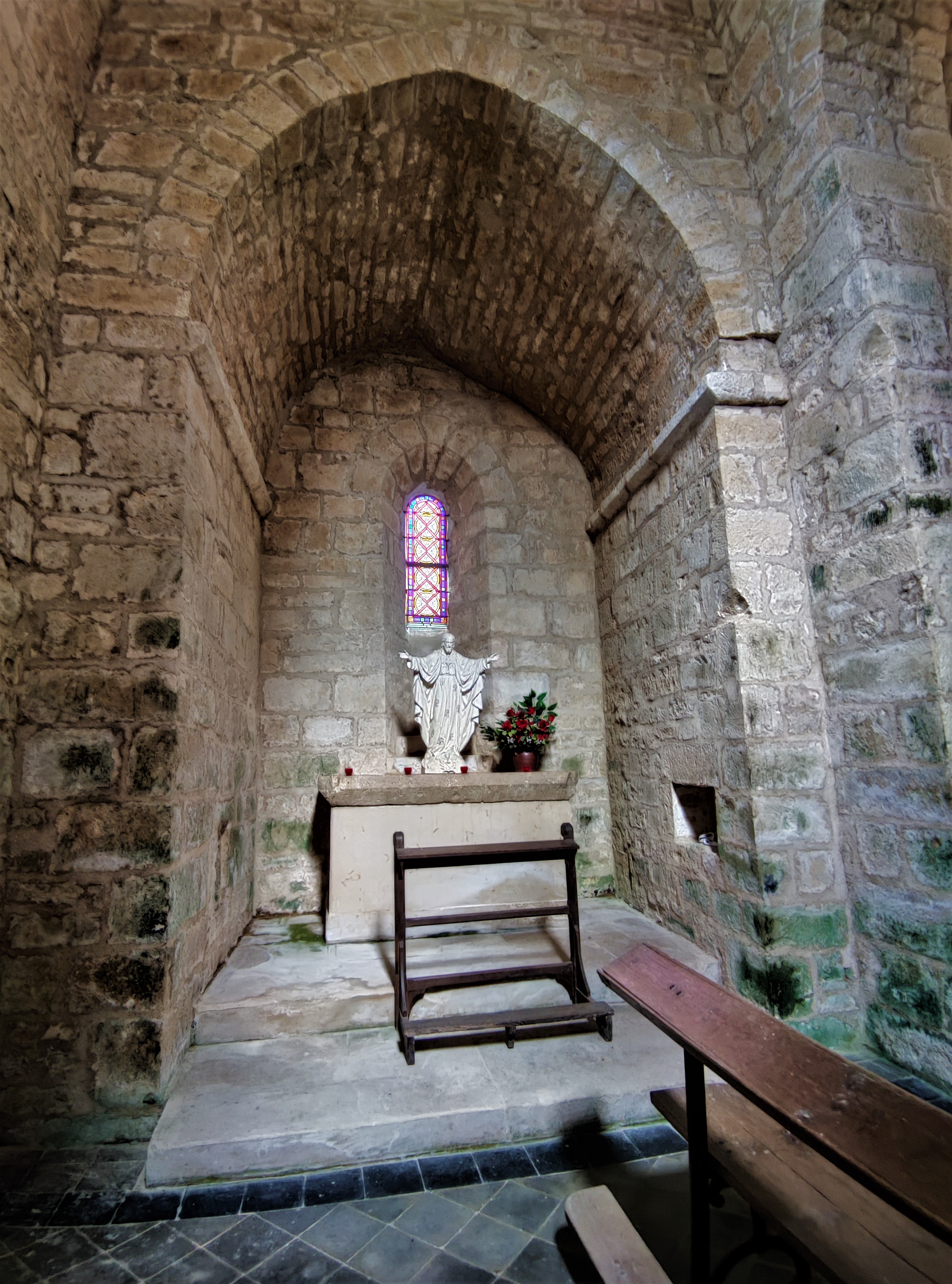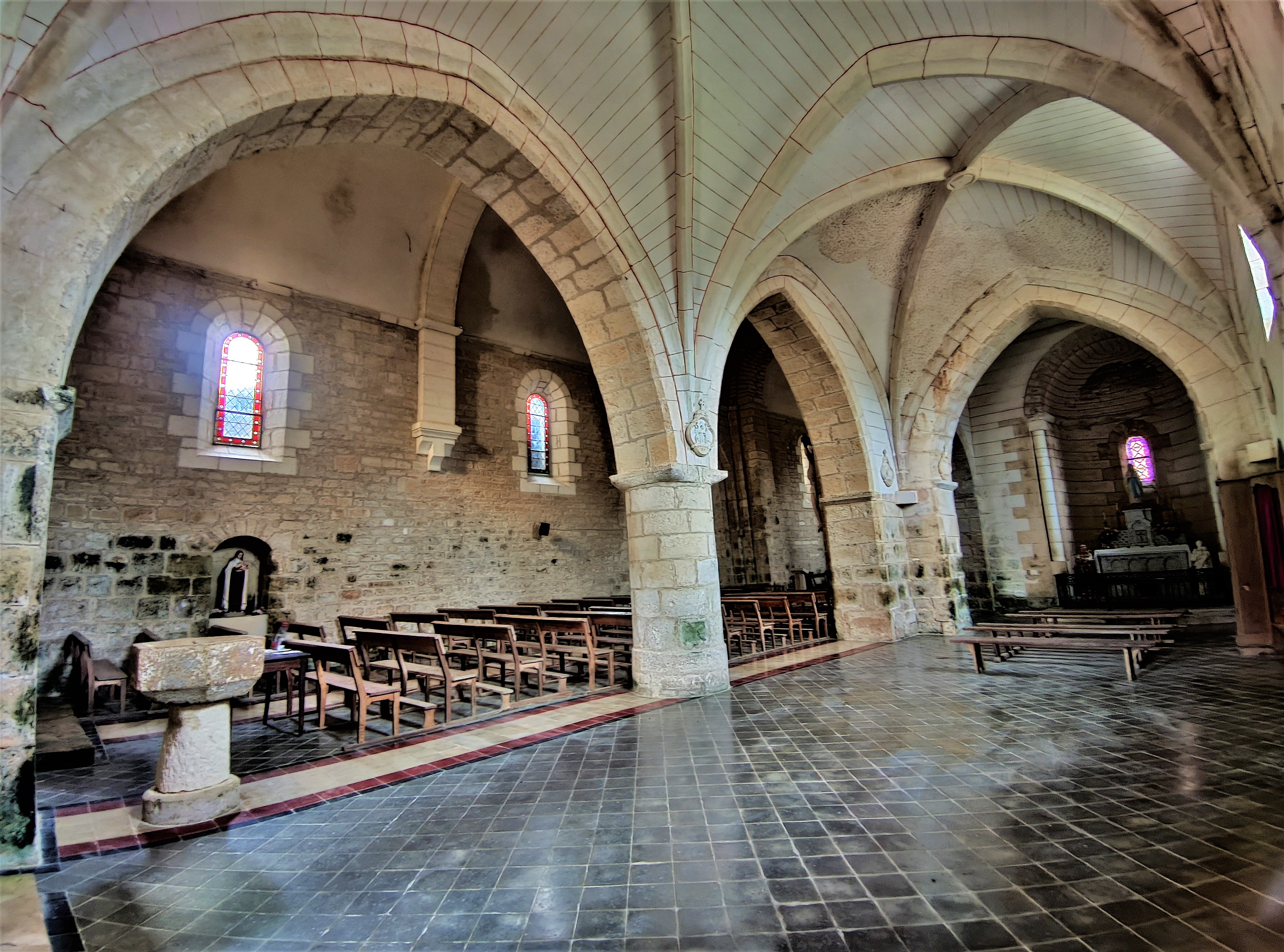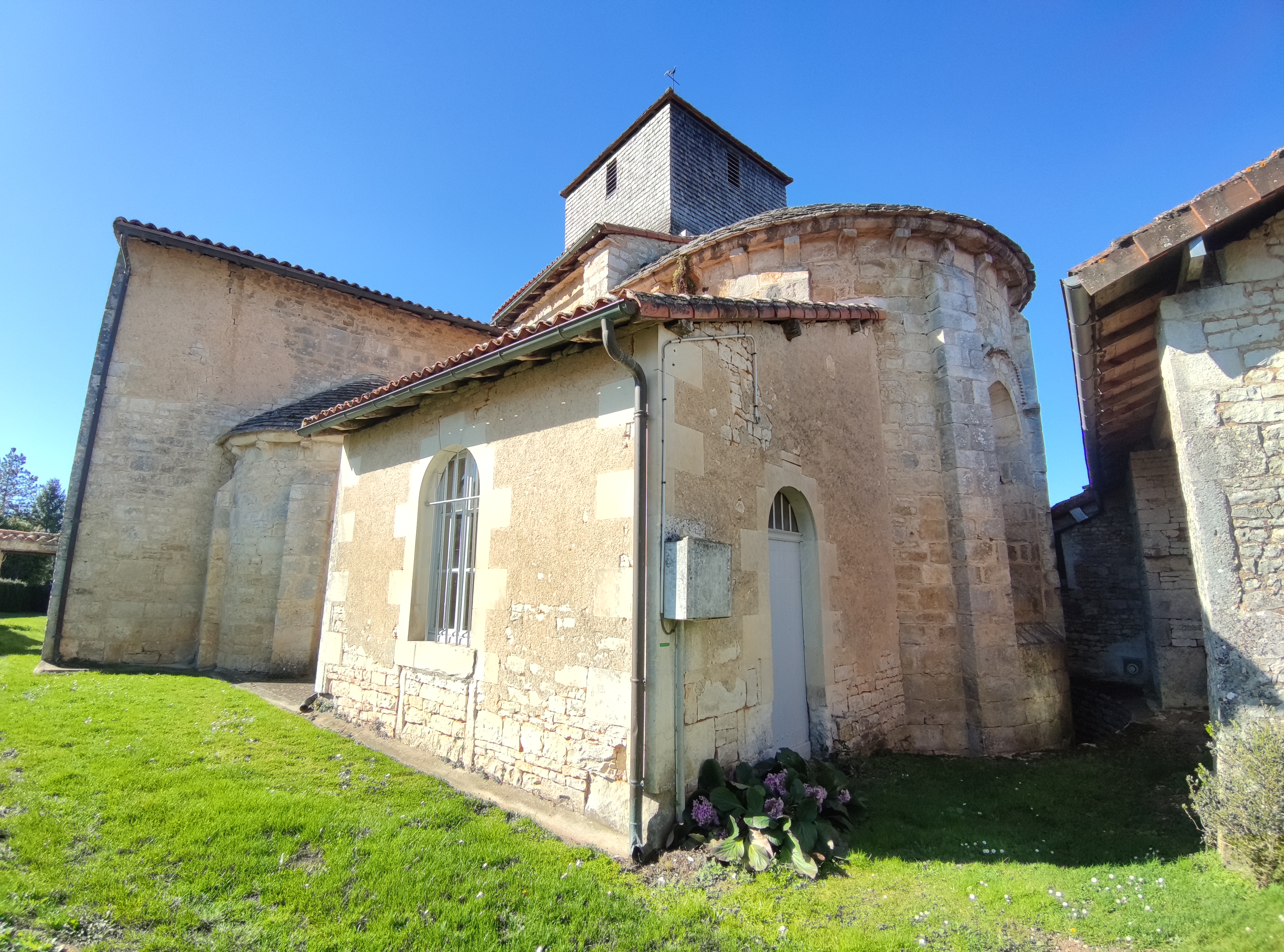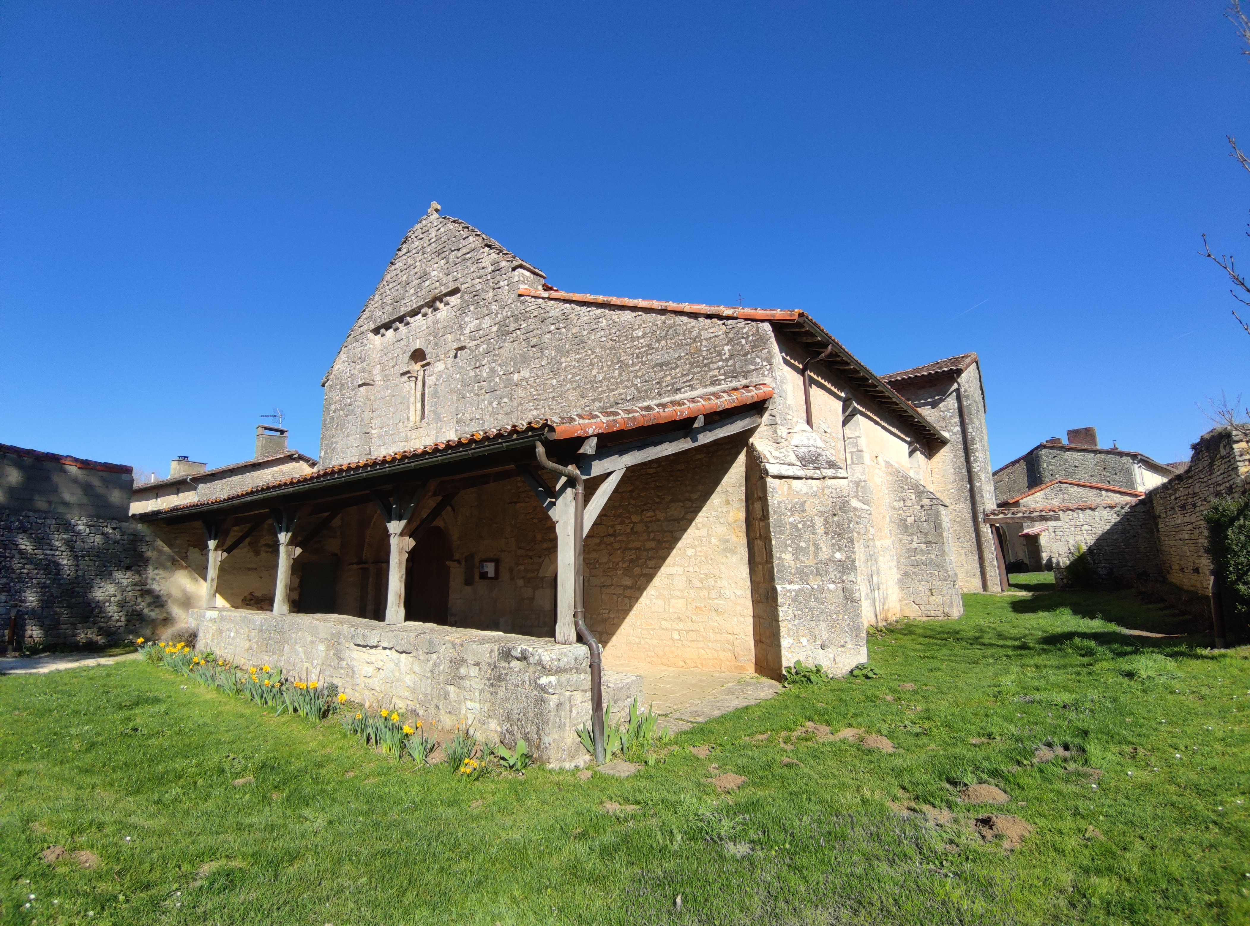 Lors de mon premier passage, cette église était fermée mais m’avait intrigué. Arrivant par l'Ouest, une belle allée conduit jusqu'à la façade romane, bordée sur toute sa longueur d'un grand caquetoir. Si on arrive par l'Est, la pagaille architecturale m'avait surpris, je n'arrivais pas à concevoir l'intérieur. Je suis donc revenu aux heures d'ouvertures de la mairie, j'ai adoré découvrir cet intérieur souvent modifié d'une église qui a bénéficié depuis mille ans des meilleurs soins. Construite au 11ème et 12ème, elle fut agrandie d'un collatéral au 16ème qui engloba le croisillon Sud et son absidiole. L'enfeu du 12ème, placé au Sud est inscrit depuis avril 1938 par les M.H. et l'église dans sa totalité depuis octobre 1997. Les voûtes en pierres ont survécu sauf celle de la nef romane qui a été reconstruite en briques au 19ème. Je ne peux qu'encourager la visite de cette église charmante et originale.