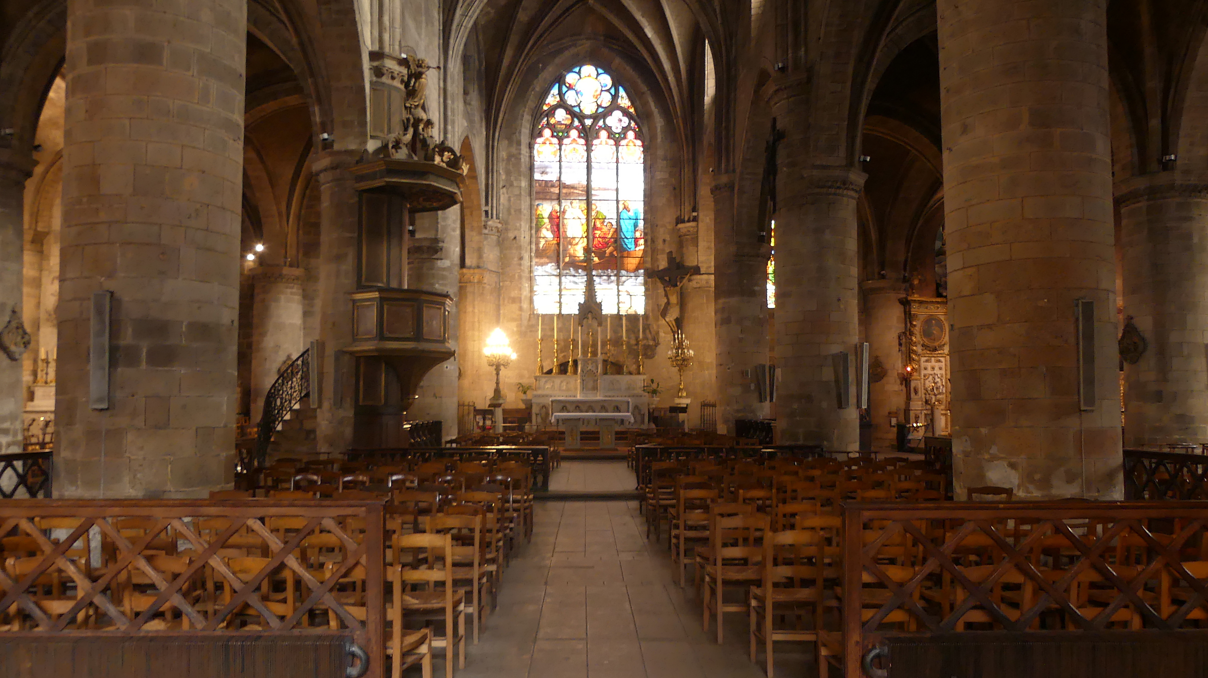 Belle église, grande comme une cathédrale. Piliers et vitraux à voir...