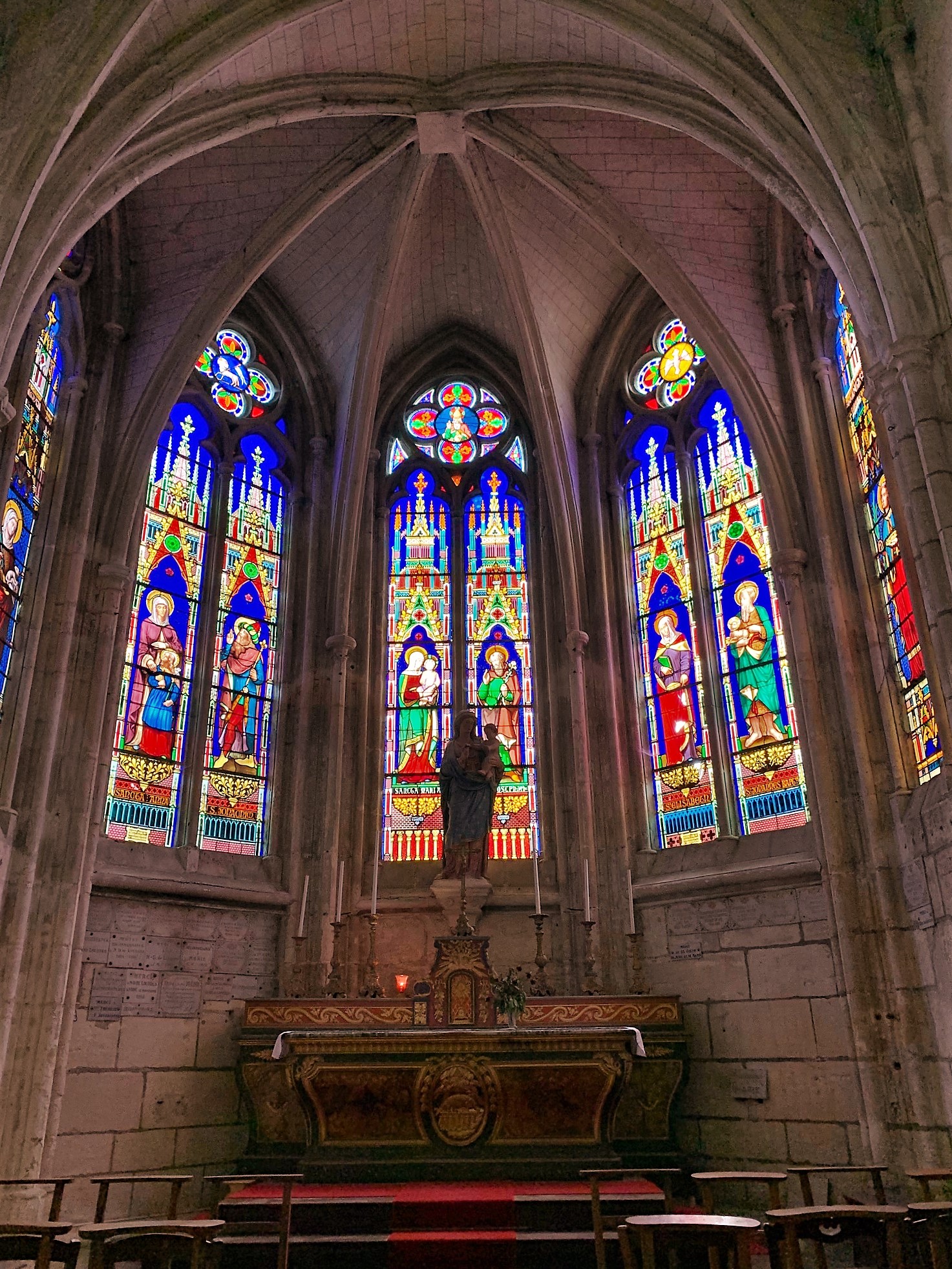 Une église gothique, un sanctuaire, un déambulatoire, une toute petite nef, 7 chapelles et pas de clocher. L'ensemble est magnifique, deux chapelles forment un début de transept et les 5 autres sont rayonnantes, offrant à cette église un superbe chevet. Un premier édifice, très ancien, restauré au 11ème et 12ème siècles, devenu abbatiale, fut détruit en 1361 par les anglais. Un plan ambitieux de reconstruction fut mis en route. A peine le chœur achevé, les bandes anglaises, en 1420, ravagèrent l'abbaye. L'édifice fut restauré mais jamais achevé.