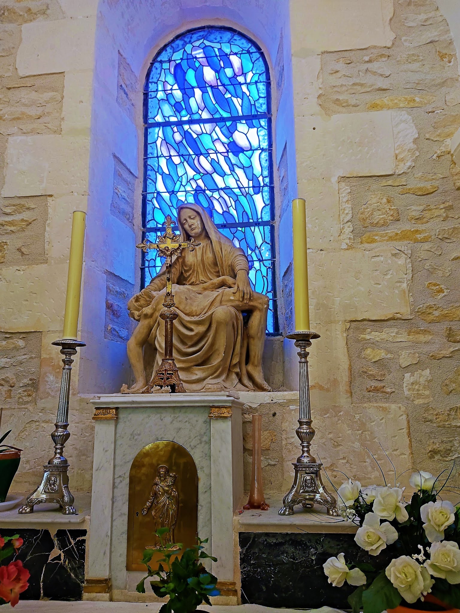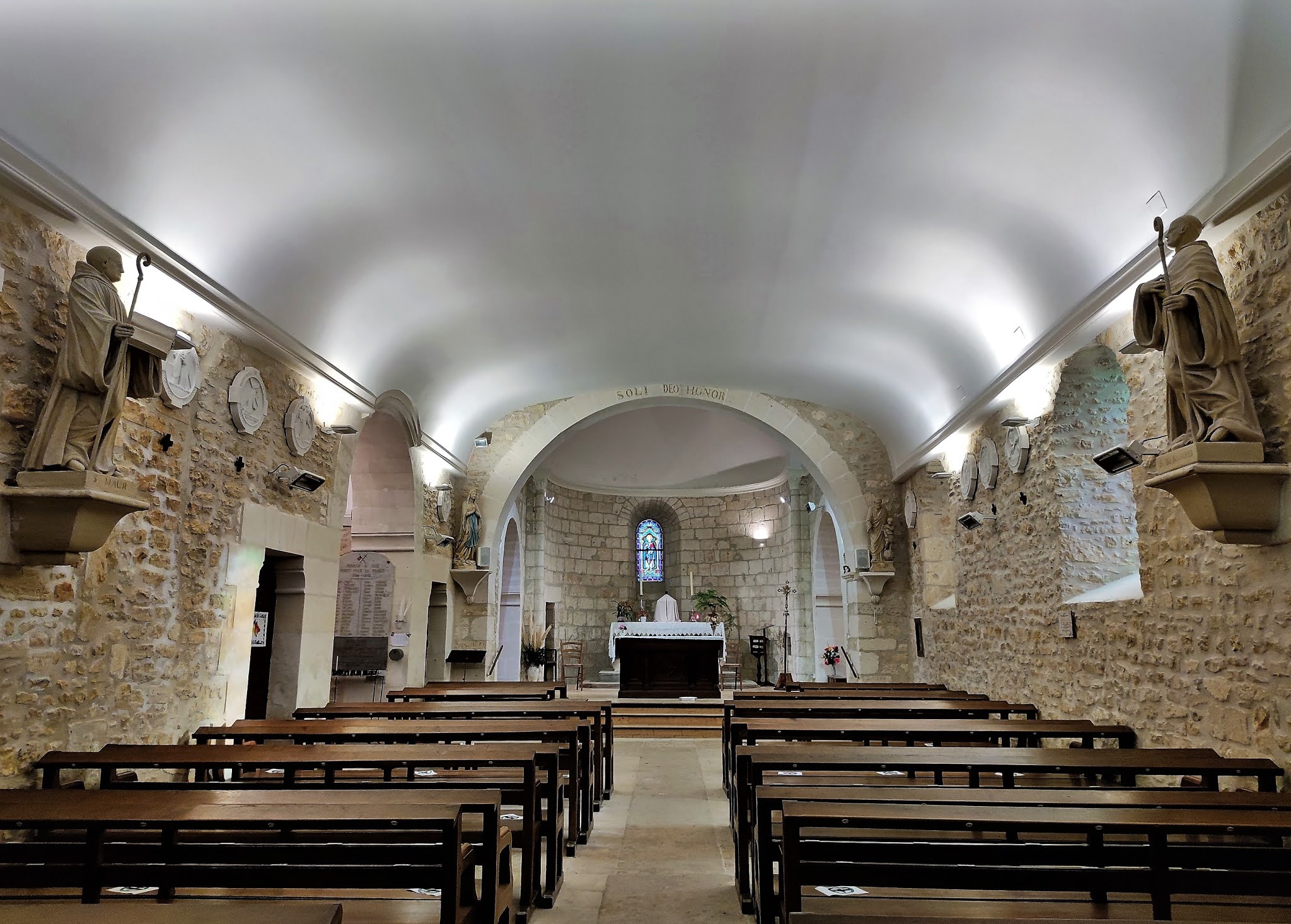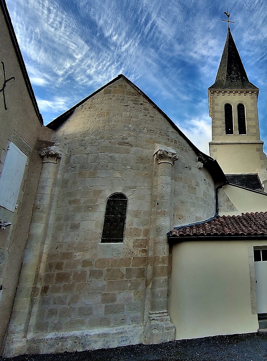 Merveille aux dimensions modestes, elle est témoigne de mille ans d'histoire. Cinq années de restaurations intérieures et extérieures offrent aux visiteurs une église superbe. Je remercie le paroissien, responsable des ouvertures de l'église, pour la visite guidée qu'il m'a offerte. Grâce à lui de multiples détails me sont apparus et m'ont été expliqués. Cette église, construite au 11ème et 12ème siècles, a conservé l'abside de l'édifice primitif et ses colonnes intérieures et extérieures munies de chapiteaux romans. Ces parties, en pierres de taille, sont visibles au chevet mais aussi dans le bras Sud du transept. Le portail date aussi du début du millénaire. A l'intérieur, les murs en pierres apparentes donnent un cachet particulier, les voûtes recouvertes d'un enduit blanc reflètent bien la lumière. Les vitraux de Marina Gelineau, vitrailliste renommée installée à Poitiers, en parfaite harmonie avec l'édifice, diffusent un éclairage coloré et bienveillant. Ils bénéficient d'une signalétique. Dans le chœur, un vitrail représentant le saint-Patron de l'église occupe la petite baie de plein cintre. La statuaire est remarquable, deux statues de Saint-Bernard et Saint-Maur accueillent les visiteurs à l'entrée Ouest. Dans la chapelle sous clocher, dédiée à la vierge, une piéta en pierre est à découvrir. Le clocher, tour carrée accolée au Nord de la nef, abrite 4 cloches, dont une de 1450, une des plus anciennes de France. Agrandie et modifiée au 19ème siècle, cette église Saint Pierre ès Lien a gardé son charme et son authenticité. La fraicheur apportée par les restaurations lui a redonné belle allure.